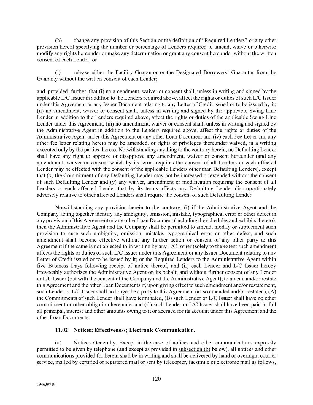 120 194639719 (h) change any provision of this Section or the definition of “Required Lenders” or any other provision hereof specifying the number or percentage of Lenders required to amend, waive or otherwise modify any rights hereunder or make any determination or grant any consent hereunder without the written consent of each Lender; or (i) release either the Facility Guarantor or the Designated Borrowers’ Guarantor from the Guaranty without the written consent of each Lender; and, provided, further, that (i) no amendment, waiver or consent shall, unless in writing and signed by the applicable L/C Issuer in addition to the Lenders required above, affect the rights or duties of such L/C Issuer under this Agreement or any Issuer Document relating to any Letter of Credit issued or to be issued by it; (ii) no amendment, waiver or consent shall, unless in writing and signed by the applicable Swing Line Lender in addition to the Lenders required above, affect the rights or duties of the applicable Swing Line Lender under this Agreement, (iii) no amendment, waiver or consent shall, unless in writing and signed by the Administrative Agent in addition to the Lenders required above, affect the rights or duties of the Administrative Agent under this Agreement or any other Loan Document and (iv) each Fee Letter and any other fee letter relating hereto may be amended, or rights or privileges thereunder waived, in a writing executed only by the parties thereto. Notwithstanding anything to the contrary herein, no Defaulting Lender shall have any right to approve or disapprove any amendment, waiver or consent hereunder (and any amendment, waiver or consent which by its terms requires the consent of all Lenders or each affected Lender may be effected with the consent of the applicable Lenders other than Defaulting Lenders), except that (x) the Commitment of any Defaulting Lender may not be increased or extended without the consent of such Defaulting Lender and (y) any waiver, amendment or modification requiring the consent of all Lenders or each affected Lender that by its terms affects any Defaulting Lender disproportionately adversely relative to other affected Lenders shall require the consent of such Defaulting Lender. Notwithstanding any provision herein to the contrary, (i) if the Administrative Agent and the Company acting together identify any ambiguity, omission, mistake, typographical error or other defect in any provision of this Agreement or any other Loan Document (including the schedules and exhibits thereto), then the Administrative Agent and the Company shall be permitted to amend, modify or supplement such provision to cure such ambiguity, omission, mistake, typographical error or other defect, and such amendment shall become effective without any further action or consent of any other party to this Agreement if the same is not objected to in writing by any L/C Issuer (solely to the extent such amendment affects the rights or duties of such L/C Issuer under this Agreement or any Issuer Document relating to any Letter of Credit issued or to be issued by it) or the Required Lenders to the Administrative Agent within five Business Days following receipt of notice thereof, and (ii) each Lender and L/C Issuer hereby irrevocably authorizes the Administrative Agent on its behalf, and without further consent of any Lender or L/C Issuer (but with the consent of the Company and the Administrative Agent), to amend and/or restate this Agreement and the other Loan Documents if, upon giving effect to such amendment and/or restatement, such Lender or L/C Issuer shall no longer be a party to this Agreement (as so amended and/or restated), (A) the Commitments of such Lender shall have terminated, (B) such Lender or L/C Issuer shall have no other commitment or other obligation hereunder and (C) such Lender or L/C Issuer shall have been paid in full all principal, interest and other amounts owing to it or accrued for its account under this Agreement and the other Loan Documents. 11.02 Notices; Effectiveness; Electronic Communication. (a) Notices Generally. Except in the case of notices and other communications expressly permitted to be given by telephone (and except as provided in subsection (b) below), all notices and other communications provided for herein shall be in writing and shall be delivered by hand or overnight courier service, mailed by certified or registered mail or sent by telecopier, facsimile or electronic mail as follows,