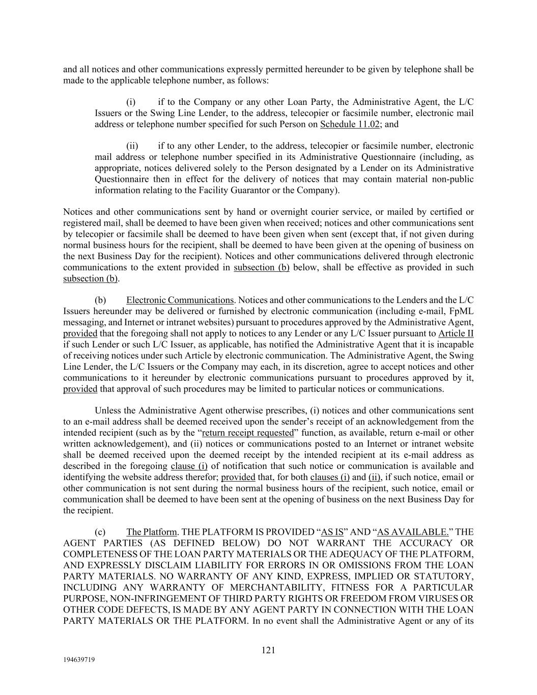 121 194639719 and all notices and other communications expressly permitted hereunder to be given by telephone shall be made to the applicable telephone number, as follows: (i) if to the Company or any other Loan Party, the Administrative Agent, the L/C Issuers or the Swing Line Lender, to the address, telecopier or facsimile number, electronic mail address or telephone number specified for such Person on Schedule 11.02; and (ii) if to any other Lender, to the address, telecopier or facsimile number, electronic mail address or telephone number specified in its Administrative Questionnaire (including, as appropriate, notices delivered solely to the Person designated by a Lender on its Administrative Questionnaire then in effect for the delivery of notices that may contain material non-public information relating to the Facility Guarantor or the Company). Notices and other communications sent by hand or overnight courier service, or mailed by certified or registered mail, shall be deemed to have been given when received; notices and other communications sent by telecopier or facsimile shall be deemed to have been given when sent (except that, if not given during normal business hours for the recipient, shall be deemed to have been given at the opening of business on the next Business Day for the recipient). Notices and other communications delivered through electronic communications to the extent provided in subsection (b) below, shall be effective as provided in such subsection (b). (b) Electronic Communications. Notices and other communications to the Lenders and the L/C Issuers hereunder may be delivered or furnished by electronic communication (including e-mail, FpML messaging, and Internet or intranet websites) pursuant to procedures approved by the Administrative Agent, provided that the foregoing shall not apply to notices to any Lender or any L/C Issuer pursuant to Article II if such Lender or such L/C Issuer, as applicable, has notified the Administrative Agent that it is incapable of receiving notices under such Article by electronic communication. The Administrative Agent, the Swing Line Lender, the L/C Issuers or the Company may each, in its discretion, agree to accept notices and other communications to it hereunder by electronic communications pursuant to procedures approved by it, provided that approval of such procedures may be limited to particular notices or communications. Unless the Administrative Agent otherwise prescribes, (i) notices and other communications sent to an e-mail address shall be deemed received upon the sender’s receipt of an acknowledgement from the intended recipient (such as by the “return receipt requested” function, as available, return e-mail or other written acknowledgement), and (ii) notices or communications posted to an Internet or intranet website shall be deemed received upon the deemed receipt by the intended recipient at its e-mail address as described in the foregoing clause (i) of notification that such notice or communication is available and identifying the website address therefor; provided that, for both clauses (i) and (ii), if such notice, email or other communication is not sent during the normal business hours of the recipient, such notice, email or communication shall be deemed to have been sent at the opening of business on the next Business Day for the recipient. (c) The Platform. THE PLATFORM IS PROVIDED “AS IS” AND “AS AVAILABLE.” THE AGENT PARTIES (AS DEFINED BELOW) DO NOT WARRANT THE ACCURACY OR COMPLETENESS OF THE LOAN PARTY MATERIALS OR THE ADEQUACY OF THE PLATFORM, AND EXPRESSLY DISCLAIM LIABILITY FOR ERRORS IN OR OMISSIONS FROM THE LOAN PARTY MATERIALS. NO WARRANTY OF ANY KIND, EXPRESS, IMPLIED OR STATUTORY, INCLUDING ANY WARRANTY OF MERCHANTABILITY, FITNESS FOR A PARTICULAR PURPOSE, NON-INFRINGEMENT OF THIRD PARTY RIGHTS OR FREEDOM FROM VIRUSES OR OTHER CODE DEFECTS, IS MADE BY ANY AGENT PARTY IN CONNECTION WITH THE LOAN PARTY MATERIALS OR THE PLATFORM. In no event shall the Administrative Agent or any of its