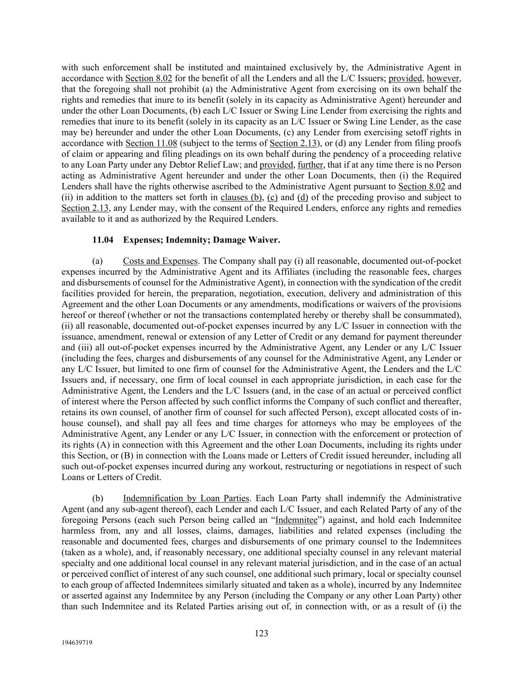 123 194639719 with such enforcement shall be instituted and maintained exclusively by, the Administrative Agent in accordance with Section 8.02 for the benefit of all the Lenders and all the L/C Issuers; provided, however, that the foregoing shall not prohibit (a) the Administrative Agent from exercising on its own behalf the rights and remedies that inure to its benefit (solely in its capacity as Administrative Agent) hereunder and under the other Loan Documents, (b) each L/C Issuer or Swing Line Lender from exercising the rights and remedies that inure to its benefit (solely in its capacity as an L/C Issuer or Swing Line Lender, as the case may be) hereunder and under the other Loan Documents, (c) any Lender from exercising setoff rights in accordance with Section 11.08 (subject to the terms of Section 2.13), or (d) any Lender from filing proofs of claim or appearing and filing pleadings on its own behalf during the pendency of a proceeding relative to any Loan Party under any Debtor Relief Law; and provided, further, that if at any time there is no Person acting as Administrative Agent hereunder and under the other Loan Documents, then (i) the Required Lenders shall have the rights otherwise ascribed to the Administrative Agent pursuant to Section 8.02 and (ii) in addition to the matters set forth in clauses (b), (c) and (d) of the preceding proviso and subject to Section 2.13, any Lender may, with the consent of the Required Lenders, enforce any rights and remedies available to it and as authorized by the Required Lenders. 11.04 Expenses; Indemnity; Damage Waiver. (a) Costs and Expenses. The Company shall pay (i) all reasonable, documented out-of-pocket expenses incurred by the Administrative Agent and its Affiliates (including the reasonable fees, charges and disbursements of counsel for the Administrative Agent), in connection with the syndication of the credit facilities provided for herein, the preparation, negotiation, execution, delivery and administration of this Agreement and the other Loan Documents or any amendments, modifications or waivers of the provisions hereof or thereof (whether or not the transactions contemplated hereby or thereby shall be consummated), (ii) all reasonable, documented out-of-pocket expenses incurred by any L/C Issuer in connection with the issuance, amendment, renewal or extension of any Letter of Credit or any demand for payment thereunder and (iii) all out-of-pocket expenses incurred by the Administrative Agent, any Lender or any L/C Issuer (including the fees, charges and disbursements of any counsel for the Administrative Agent, any Lender or any L/C Issuer, but limited to one firm of counsel for the Administrative Agent, the Lenders and the L/C Issuers and, if necessary, one firm of local counsel in each appropriate jurisdiction, in each case for the Administrative Agent, the Lenders and the L/C Issuers (and, in the case of an actual or perceived conflict of interest where the Person affected by such conflict informs the Company of such conflict and thereafter, retains its own counsel, of another firm of counsel for such affected Person), except allocated costs of in- house counsel), and shall pay all fees and time charges for attorneys who may be employees of the Administrative Agent, any Lender or any L/C Issuer, in connection with the enforcement or protection of its rights (A) in connection with this Agreement and the other Loan Documents, including its rights under this Section, or (B) in connection with the Loans made or Letters of Credit issued hereunder, including all such out-of-pocket expenses incurred during any workout, restructuring or negotiations in respect of such Loans or Letters of Credit. (b) Indemnification by Loan Parties. Each Loan Party shall indemnify the Administrative Agent (and any sub-agent thereof), each Lender and each L/C Issuer, and each Related Party of any of the foregoing Persons (each such Person being called an “Indemnitee”) against, and hold each Indemnitee harmless from, any and all losses, claims, damages, liabilities and related expenses (including the reasonable and documented fees, charges and disbursements of one primary counsel to the Indemnitees (taken as a whole), and, if reasonably necessary, one additional specialty counsel in any relevant material specialty and one additional local counsel in any relevant material jurisdiction, and in the case of an actual or perceived conflict of interest of any such counsel, one additional such primary, local or specialty counsel to each group of affected Indemnitees similarly situated and taken as a whole), incurred by any Indemnitee or asserted against any Indemnitee by any Person (including the Company or any other Loan Party) other than such Indemnitee and its Related Parties arising out of, in connection with, or as a result of (i) the