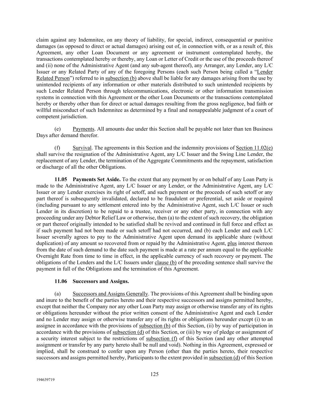 125 194639719 claim against any Indemnitee, on any theory of liability, for special, indirect, consequential or punitive damages (as opposed to direct or actual damages) arising out of, in connection with, or as a result of, this Agreement, any other Loan Document or any agreement or instrument contemplated hereby, the transactions contemplated hereby or thereby, any Loan or Letter of Credit or the use of the proceeds thereof and (ii) none of the Administrative Agent (and any sub-agent thereof), any Arranger, any Lender, any L/C Issuer or any Related Party of any of the foregoing Persons (each such Person being called a “Lender Related Person”) referred to in subsection (b) above shall be liable for any damages arising from the use by unintended recipients of any information or other materials distributed to such unintended recipients by such Lender Related Person through telecommunications, electronic or other information transmission systems in connection with this Agreement or the other Loan Documents or the transactions contemplated hereby or thereby other than for direct or actual damages resulting from the gross negligence, bad faith or willful misconduct of such Indemnitee as determined by a final and nonappealable judgment of a court of competent jurisdiction. (e) Payments. All amounts due under this Section shall be payable not later than ten Business Days after demand therefor. (f) Survival. The agreements in this Section and the indemnity provisions of Section 11.02(e) shall survive the resignation of the Administrative Agent, any L/C Issuer and the Swing Line Lender, the replacement of any Lender, the termination of the Aggregate Commitments and the repayment, satisfaction or discharge of all the other Obligations. 11.05 Payments Set Aside. To the extent that any payment by or on behalf of any Loan Party is made to the Administrative Agent, any L/C Issuer or any Lender, or the Administrative Agent, any L/C Issuer or any Lender exercises its right of setoff, and such payment or the proceeds of such setoff or any part thereof is subsequently invalidated, declared to be fraudulent or preferential, set aside or required (including pursuant to any settlement entered into by the Administrative Agent, such L/C Issuer or such Lender in its discretion) to be repaid to a trustee, receiver or any other party, in connection with any proceeding under any Debtor Relief Law or otherwise, then (a) to the extent of such recovery, the obligation or part thereof originally intended to be satisfied shall be revived and continued in full force and effect as if such payment had not been made or such setoff had not occurred, and (b) each Lender and each L/C Issuer severally agrees to pay to the Administrative Agent upon demand its applicable share (without duplication) of any amount so recovered from or repaid by the Administrative Agent, plus interest thereon from the date of such demand to the date such payment is made at a rate per annum equal to the applicable Overnight Rate from time to time in effect, in the applicable currency of such recovery or payment. The obligations of the Lenders and the L/C Issuers under clause (b) of the preceding sentence shall survive the payment in full of the Obligations and the termination of this Agreement. 11.06 Successors and Assigns. (a) Successors and Assigns Generally. The provisions of this Agreement shall be binding upon and inure to the benefit of the parties hereto and their respective successors and assigns permitted hereby, except that neither the Company nor any other Loan Party may assign or otherwise transfer any of its rights or obligations hereunder without the prior written consent of the Administrative Agent and each Lender and no Lender may assign or otherwise transfer any of its rights or obligations hereunder except (i) to an assignee in accordance with the provisions of subsection (b) of this Section, (ii) by way of participation in accordance with the provisions of subsection (d) of this Section, or (iii) by way of pledge or assignment of a security interest subject to the restrictions of subsection (f) of this Section (and any other attempted assignment or transfer by any party hereto shall be null and void). Nothing in this Agreement, expressed or implied, shall be construed to confer upon any Person (other than the parties hereto, their respective successors and assigns permitted hereby, Participants to the extent provided in subsection (d) of this Section