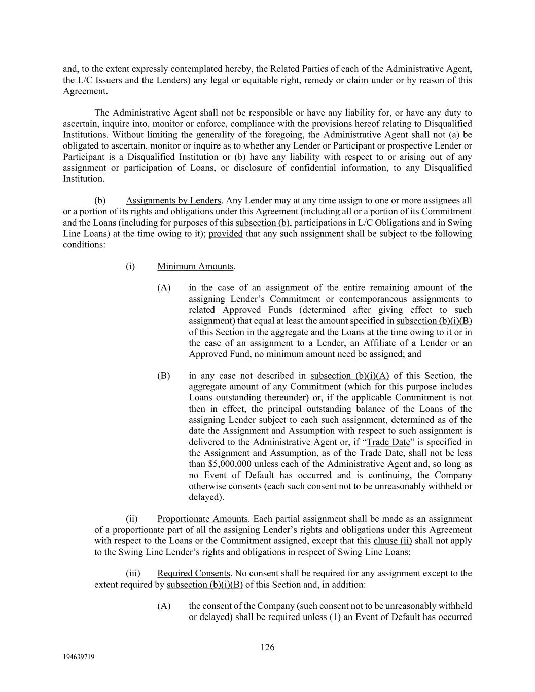 126 194639719 and, to the extent expressly contemplated hereby, the Related Parties of each of the Administrative Agent, the L/C Issuers and the Lenders) any legal or equitable right, remedy or claim under or by reason of this Agreement. The Administrative Agent shall not be responsible or have any liability for, or have any duty to ascertain, inquire into, monitor or enforce, compliance with the provisions hereof relating to Disqualified Institutions. Without limiting the generality of the foregoing, the Administrative Agent shall not (a) be obligated to ascertain, monitor or inquire as to whether any Lender or Participant or prospective Lender or Participant is a Disqualified Institution or (b) have any liability with respect to or arising out of any assignment or participation of Loans, or disclosure of confidential information, to any Disqualified Institution. (b) Assignments by Lenders. Any Lender may at any time assign to one or more assignees all or a portion of its rights and obligations under this Agreement (including all or a portion of its Commitment and the Loans (including for purposes of this subsection (b), participations in L/C Obligations and in Swing Line Loans) at the time owing to it); provided that any such assignment shall be subject to the following conditions: (i) Minimum Amounts. (A) in the case of an assignment of the entire remaining amount of the assigning Lender’s Commitment or contemporaneous assignments to related Approved Funds (determined after giving effect to such assignment) that equal at least the amount specified in subsection (b)(i)(B) of this Section in the aggregate and the Loans at the time owing to it or in the case of an assignment to a Lender, an Affiliate of a Lender or an Approved Fund, no minimum amount need be assigned; and (B) in any case not described in subsection (b)(i)(A) of this Section, the aggregate amount of any Commitment (which for this purpose includes Loans outstanding thereunder) or, if the applicable Commitment is not then in effect, the principal outstanding balance of the Loans of the assigning Lender subject to each such assignment, determined as of the date the Assignment and Assumption with respect to such assignment is delivered to the Administrative Agent or, if “Trade Date” is specified in the Assignment and Assumption, as of the Trade Date, shall not be less than $5,000,000 unless each of the Administrative Agent and, so long as no Event of Default has occurred and is continuing, the Company otherwise consents (each such consent not to be unreasonably withheld or delayed). (ii) Proportionate Amounts. Each partial assignment shall be made as an assignment of a proportionate part of all the assigning Lender’s rights and obligations under this Agreement with respect to the Loans or the Commitment assigned, except that this clause (ii) shall not apply to the Swing Line Lender’s rights and obligations in respect of Swing Line Loans; (iii) Required Consents. No consent shall be required for any assignment except to the extent required by subsection (b)(i)(B) of this Section and, in addition: (A) the consent of the Company (such consent not to be unreasonably withheld or delayed) shall be required unless (1) an Event of Default has occurred