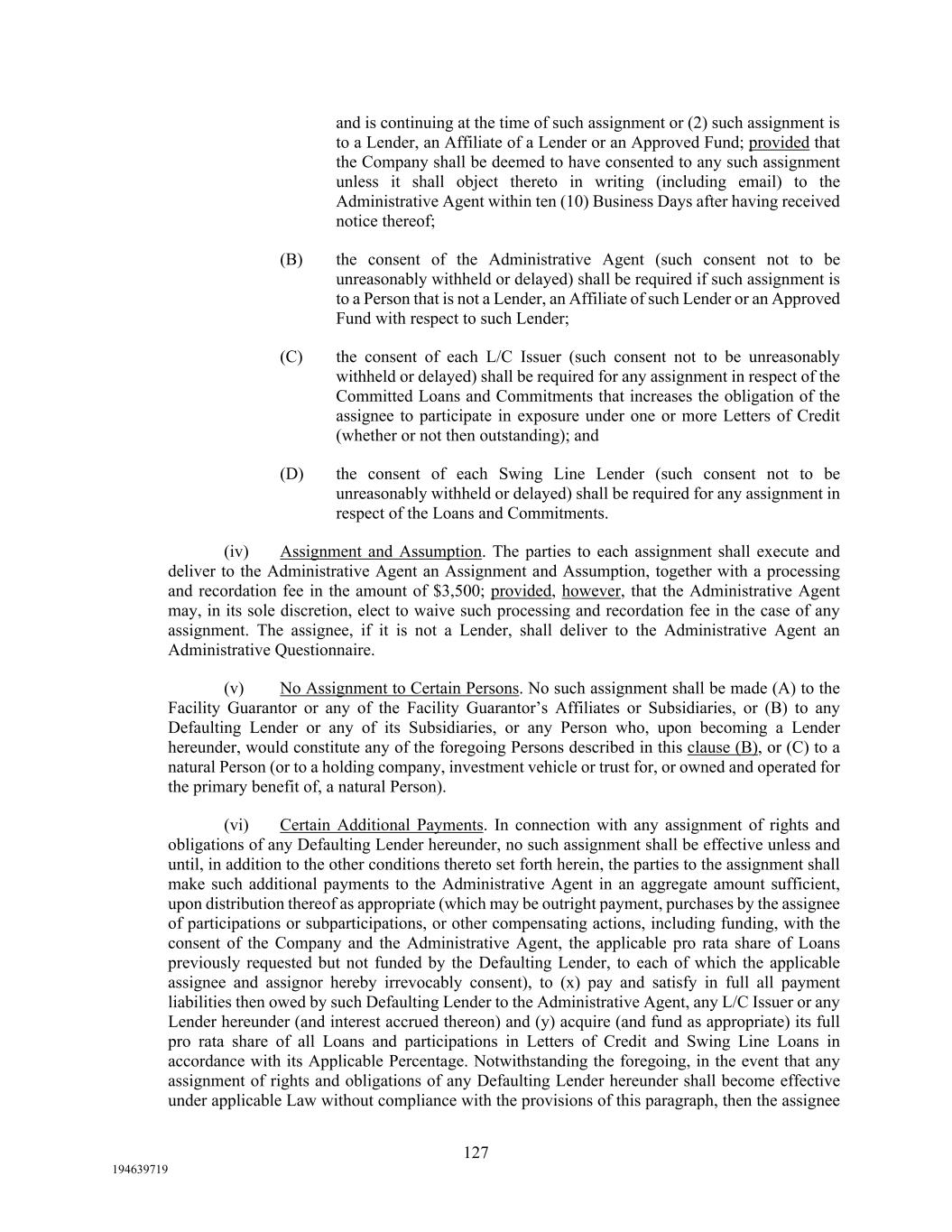 127 194639719 and is continuing at the time of such assignment or (2) such assignment is to a Lender, an Affiliate of a Lender or an Approved Fund; provided that the Company shall be deemed to have consented to any such assignment unless it shall object thereto in writing (including email) to the Administrative Agent within ten (10) Business Days after having received notice thereof; (B) the consent of the Administrative Agent (such consent not to be unreasonably withheld or delayed) shall be required if such assignment is to a Person that is not a Lender, an Affiliate of such Lender or an Approved Fund with respect to such Lender; (C) the consent of each L/C Issuer (such consent not to be unreasonably withheld or delayed) shall be required for any assignment in respect of the Committed Loans and Commitments that increases the obligation of the assignee to participate in exposure under one or more Letters of Credit (whether or not then outstanding); and (D) the consent of each Swing Line Lender (such consent not to be unreasonably withheld or delayed) shall be required for any assignment in respect of the Loans and Commitments. (iv) Assignment and Assumption. The parties to each assignment shall execute and deliver to the Administrative Agent an Assignment and Assumption, together with a processing and recordation fee in the amount of $3,500; provided, however, that the Administrative Agent may, in its sole discretion, elect to waive such processing and recordation fee in the case of any assignment. The assignee, if it is not a Lender, shall deliver to the Administrative Agent an Administrative Questionnaire. (v) No Assignment to Certain Persons. No such assignment shall be made (A) to the Facility Guarantor or any of the Facility Guarantor’s Affiliates or Subsidiaries, or (B) to any Defaulting Lender or any of its Subsidiaries, or any Person who, upon becoming a Lender hereunder, would constitute any of the foregoing Persons described in this clause (B), or (C) to a natural Person (or to a holding company, investment vehicle or trust for, or owned and operated for the primary benefit of, a natural Person). (vi) Certain Additional Payments. In connection with any assignment of rights and obligations of any Defaulting Lender hereunder, no such assignment shall be effective unless and until, in addition to the other conditions thereto set forth herein, the parties to the assignment shall make such additional payments to the Administrative Agent in an aggregate amount sufficient, upon distribution thereof as appropriate (which may be outright payment, purchases by the assignee of participations or subparticipations, or other compensating actions, including funding, with the consent of the Company and the Administrative Agent, the applicable pro rata share of Loans previously requested but not funded by the Defaulting Lender, to each of which the applicable assignee and assignor hereby irrevocably consent), to (x) pay and satisfy in full all payment liabilities then owed by such Defaulting Lender to the Administrative Agent, any L/C Issuer or any Lender hereunder (and interest accrued thereon) and (y) acquire (and fund as appropriate) its full pro rata share of all Loans and participations in Letters of Credit and Swing Line Loans in accordance with its Applicable Percentage. Notwithstanding the foregoing, in the event that any assignment of rights and obligations of any Defaulting Lender hereunder shall become effective under applicable Law without compliance with the provisions of this paragraph, then the assignee