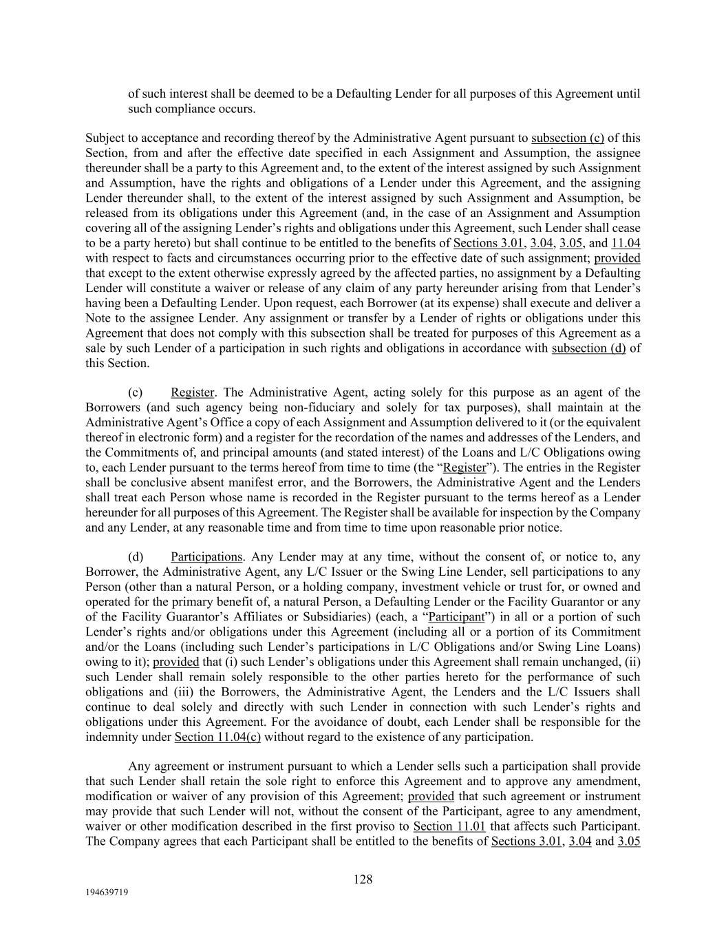128 194639719 of such interest shall be deemed to be a Defaulting Lender for all purposes of this Agreement until such compliance occurs. Subject to acceptance and recording thereof by the Administrative Agent pursuant to subsection (c) of this Section, from and after the effective date specified in each Assignment and Assumption, the assignee thereunder shall be a party to this Agreement and, to the extent of the interest assigned by such Assignment and Assumption, have the rights and obligations of a Lender under this Agreement, and the assigning Lender thereunder shall, to the extent of the interest assigned by such Assignment and Assumption, be released from its obligations under this Agreement (and, in the case of an Assignment and Assumption covering all of the assigning Lender’s rights and obligations under this Agreement, such Lender shall cease to be a party hereto) but shall continue to be entitled to the benefits of Sections 3.01, 3.04, 3.05, and 11.04 with respect to facts and circumstances occurring prior to the effective date of such assignment; provided that except to the extent otherwise expressly agreed by the affected parties, no assignment by a Defaulting Lender will constitute a waiver or release of any claim of any party hereunder arising from that Lender’s having been a Defaulting Lender. Upon request, each Borrower (at its expense) shall execute and deliver a Note to the assignee Lender. Any assignment or transfer by a Lender of rights or obligations under this Agreement that does not comply with this subsection shall be treated for purposes of this Agreement as a sale by such Lender of a participation in such rights and obligations in accordance with subsection (d) of this Section. (c) Register. The Administrative Agent, acting solely for this purpose as an agent of the Borrowers (and such agency being non-fiduciary and solely for tax purposes), shall maintain at the Administrative Agent’s Office a copy of each Assignment and Assumption delivered to it (or the equivalent thereof in electronic form) and a register for the recordation of the names and addresses of the Lenders, and the Commitments of, and principal amounts (and stated interest) of the Loans and L/C Obligations owing to, each Lender pursuant to the terms hereof from time to time (the “Register”). The entries in the Register shall be conclusive absent manifest error, and the Borrowers, the Administrative Agent and the Lenders shall treat each Person whose name is recorded in the Register pursuant to the terms hereof as a Lender hereunder for all purposes of this Agreement. The Register shall be available for inspection by the Company and any Lender, at any reasonable time and from time to time upon reasonable prior notice. (d) Participations. Any Lender may at any time, without the consent of, or notice to, any Borrower, the Administrative Agent, any L/C Issuer or the Swing Line Lender, sell participations to any Person (other than a natural Person, or a holding company, investment vehicle or trust for, or owned and operated for the primary benefit of, a natural Person, a Defaulting Lender or the Facility Guarantor or any of the Facility Guarantor’s Affiliates or Subsidiaries) (each, a “Participant”) in all or a portion of such Lender’s rights and/or obligations under this Agreement (including all or a portion of its Commitment and/or the Loans (including such Lender’s participations in L/C Obligations and/or Swing Line Loans) owing to it); provided that (i) such Lender’s obligations under this Agreement shall remain unchanged, (ii) such Lender shall remain solely responsible to the other parties hereto for the performance of such obligations and (iii) the Borrowers, the Administrative Agent, the Lenders and the L/C Issuers shall continue to deal solely and directly with such Lender in connection with such Lender’s rights and obligations under this Agreement. For the avoidance of doubt, each Lender shall be responsible for the indemnity under Section 11.04(c) without regard to the existence of any participation. Any agreement or instrument pursuant to which a Lender sells such a participation shall provide that such Lender shall retain the sole right to enforce this Agreement and to approve any amendment, modification or waiver of any provision of this Agreement; provided that such agreement or instrument may provide that such Lender will not, without the consent of the Participant, agree to any amendment, waiver or other modification described in the first proviso to Section 11.01 that affects such Participant. The Company agrees that each Participant shall be entitled to the benefits of Sections 3.01, 3.04 and 3.05