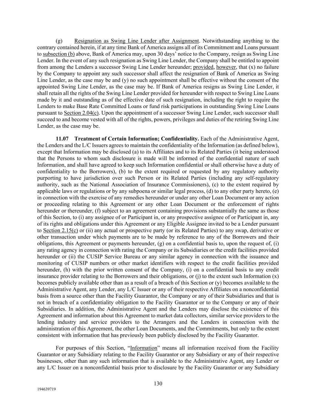 130 194639719 (g) Resignation as Swing Line Lender after Assignment. Notwithstanding anything to the contrary contained herein, if at any time Bank of America assigns all of its Commitment and Loans pursuant to subsection (b) above, Bank of America may, upon 30 days’ notice to the Company, resign as Swing Line Lender. In the event of any such resignation as Swing Line Lender, the Company shall be entitled to appoint from among the Lenders a successor Swing Line Lender hereunder; provided, however, that (x) no failure by the Company to appoint any such successor shall affect the resignation of Bank of America as Swing Line Lender, as the case may be and (y) no such appointment shall be effective without the consent of the appointed Swing Line Lender, as the case may be. If Bank of America resigns as Swing Line Lender, it shall retain all the rights of the Swing Line Lender provided for hereunder with respect to Swing Line Loans made by it and outstanding as of the effective date of such resignation, including the right to require the Lenders to make Base Rate Committed Loans or fund risk participations in outstanding Swing Line Loans pursuant to Section 2.04(c). Upon the appointment of a successor Swing Line Lender, such successor shall succeed to and become vested with all of the rights, powers, privileges and duties of the retiring Swing Line Lender, as the case may be. 11.07 Treatment of Certain Information; Confidentiality. Each of the Administrative Agent, the Lenders and the L/C Issuers agrees to maintain the confidentiality of the Information (as defined below), except that Information may be disclosed (a) to its Affiliates and to its Related Parties (it being understood that the Persons to whom such disclosure is made will be informed of the confidential nature of such Information, and shall have agreed to keep such Information confidential or shall otherwise have a duty of confidentiality to the Borrowers), (b) to the extent required or requested by any regulatory authority purporting to have jurisdiction over such Person or its Related Parties (including any self-regulatory authority, such as the National Association of Insurance Commissioners), (c) to the extent required by applicable laws or regulations or by any subpoena or similar legal process, (d) to any other party hereto, (e) in connection with the exercise of any remedies hereunder or under any other Loan Document or any action or proceeding relating to this Agreement or any other Loan Document or the enforcement of rights hereunder or thereunder, (f) subject to an agreement containing provisions substantially the same as those of this Section, to (i) any assignee of or Participant in, or any prospective assignee of or Participant in, any of its rights and obligations under this Agreement or any Eligible Assignee invited to be a Lender pursuant to Section 2.15(c) or (ii) any actual or prospective party (or its Related Parties) to any swap, derivative or other transaction under which payments are to be made by reference to any of the Borrowers and their obligations, this Agreement or payments hereunder, (g) on a confidential basis to, upon the request of, (i) any rating agency in connection with rating the Company or its Subsidiaries or the credit facilities provided hereunder or (ii) the CUSIP Service Bureau or any similar agency in connection with the issuance and monitoring of CUSIP numbers or other market identifiers with respect to the credit facilities provided hereunder, (h) with the prior written consent of the Company, (i) on a confidential basis to any credit insurance provider relating to the Borrowers and their obligations, or (j) to the extent such Information (x) becomes publicly available other than as a result of a breach of this Section or (y) becomes available to the Administrative Agent, any Lender, any L/C Issuer or any of their respective Affiliates on a nonconfidential basis from a source other than the Facility Guarantor, the Company or any of their Subsidiaries and that is not in breach of a confidentiality obligation to the Facility Guarantor or to the Company or any of their Subsidiaries. In addition, the Administrative Agent and the Lenders may disclose the existence of this Agreement and information about this Agreement to market data collectors, similar service providers to the lending industry and service providers to the Arrangers and the Lenders in connection with the administration of this Agreement, the other Loan Documents, and the Commitments, but only to the extent consistent with information that has previously been publicly disclosed by the Facility Guarantor. For purposes of this Section, “Information” means all information received from the Facility Guarantor or any Subsidiary relating to the Facility Guarantor or any Subsidiary or any of their respective businesses, other than any such information that is available to the Administrative Agent, any Lender or any L/C Issuer on a nonconfidential basis prior to disclosure by the Facility Guarantor or any Subsidiary