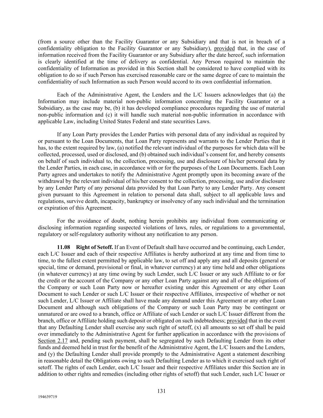 131 194639719 (from a source other than the Facility Guarantor or any Subsidiary and that is not in breach of a confidentiality obligation to the Facility Guarantor or any Subsidiary), provided that, in the case of information received from the Facility Guarantor or any Subsidiary after the date hereof, such information is clearly identified at the time of delivery as confidential. Any Person required to maintain the confidentiality of Information as provided in this Section shall be considered to have complied with its obligation to do so if such Person has exercised reasonable care or the same degree of care to maintain the confidentiality of such Information as such Person would accord to its own confidential information. Each of the Administrative Agent, the Lenders and the L/C Issuers acknowledges that (a) the Information may include material non-public information concerning the Facility Guarantor or a Subsidiary, as the case may be, (b) it has developed compliance procedures regarding the use of material non-public information and (c) it will handle such material non-public information in accordance with applicable Law, including United States Federal and state securities Laws. If any Loan Party provides the Lender Parties with personal data of any individual as required by or pursuant to the Loan Documents, that Loan Party represents and warrants to the Lender Parties that it has, to the extent required by law, (a) notified the relevant individual of the purposes for which data will be collected, processed, used or disclosed, and (b) obtained such individual’s consent for, and hereby consents on behalf of such individual to, the collection, processing, use and disclosure of his/her personal data by the Lender Parties, in each case, in accordance with or for the purposes of the Loan Documents. Each Loan Party agrees and undertakes to notify the Administrative Agent promptly upon its becoming aware of the withdrawal by the relevant individual of his/her consent to the collection, processing, use and/or disclosure by any Lender Party of any personal data provided by that Loan Party to any Lender Party. Any consent given pursuant to this Agreement in relation to personal data shall, subject to all applicable laws and regulations, survive death, incapacity, bankruptcy or insolvency of any such individual and the termination or expiration of this Agreement. For the avoidance of doubt, nothing herein prohibits any individual from communicating or disclosing information regarding suspected violations of laws, rules, or regulations to a governmental, regulatory or self-regulatory authority without any notification to any person. 11.08 Right of Setoff. If an Event of Default shall have occurred and be continuing, each Lender, each L/C Issuer and each of their respective Affiliates is hereby authorized at any time and from time to time, to the fullest extent permitted by applicable law, to set off and apply any and all deposits (general or special, time or demand, provisional or final, in whatever currency) at any time held and other obligations (in whatever currency) at any time owing by such Lender, such L/C Issuer or any such Affiliate to or for the credit or the account of the Company or any other Loan Party against any and all of the obligations of the Company or such Loan Party now or hereafter existing under this Agreement or any other Loan Document to such Lender or such L/C Issuer or their respective Affiliates, irrespective of whether or not such Lender, L/C Issuer or Affiliate shall have made any demand under this Agreement or any other Loan Document and although such obligations of the Company or such Loan Party may be contingent or unmatured or are owed to a branch, office or Affiliate of such Lender or such L/C Issuer different from the branch, office or Affiliate holding such deposit or obligated on such indebtedness; provided that in the event that any Defaulting Lender shall exercise any such right of setoff, (x) all amounts so set off shall be paid over immediately to the Administrative Agent for further application in accordance with the provisions of Section 2.17 and, pending such payment, shall be segregated by such Defaulting Lender from its other funds and deemed held in trust for the benefit of the Administrative Agent, the L/C Issuers and the Lenders, and (y) the Defaulting Lender shall provide promptly to the Administrative Agent a statement describing in reasonable detail the Obligations owing to such Defaulting Lender as to which it exercised such right of setoff. The rights of each Lender, each L/C Issuer and their respective Affiliates under this Section are in addition to other rights and remedies (including other rights of setoff) that such Lender, such L/C Issuer or