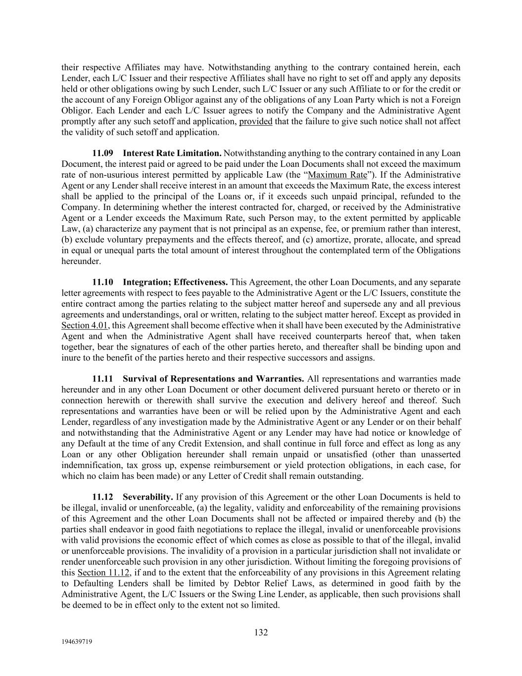 132 194639719 their respective Affiliates may have. Notwithstanding anything to the contrary contained herein, each Lender, each L/C Issuer and their respective Affiliates shall have no right to set off and apply any deposits held or other obligations owing by such Lender, such L/C Issuer or any such Affiliate to or for the credit or the account of any Foreign Obligor against any of the obligations of any Loan Party which is not a Foreign Obligor. Each Lender and each L/C Issuer agrees to notify the Company and the Administrative Agent promptly after any such setoff and application, provided that the failure to give such notice shall not affect the validity of such setoff and application. 11.09 Interest Rate Limitation. Notwithstanding anything to the contrary contained in any Loan Document, the interest paid or agreed to be paid under the Loan Documents shall not exceed the maximum rate of non-usurious interest permitted by applicable Law (the “Maximum Rate”). If the Administrative Agent or any Lender shall receive interest in an amount that exceeds the Maximum Rate, the excess interest shall be applied to the principal of the Loans or, if it exceeds such unpaid principal, refunded to the Company. In determining whether the interest contracted for, charged, or received by the Administrative Agent or a Lender exceeds the Maximum Rate, such Person may, to the extent permitted by applicable Law, (a) characterize any payment that is not principal as an expense, fee, or premium rather than interest, (b) exclude voluntary prepayments and the effects thereof, and (c) amortize, prorate, allocate, and spread in equal or unequal parts the total amount of interest throughout the contemplated term of the Obligations hereunder. 11.10 Integration; Effectiveness. This Agreement, the other Loan Documents, and any separate letter agreements with respect to fees payable to the Administrative Agent or the L/C Issuers, constitute the entire contract among the parties relating to the subject matter hereof and supersede any and all previous agreements and understandings, oral or written, relating to the subject matter hereof. Except as provided in Section 4.01, this Agreement shall become effective when it shall have been executed by the Administrative Agent and when the Administrative Agent shall have received counterparts hereof that, when taken together, bear the signatures of each of the other parties hereto, and thereafter shall be binding upon and inure to the benefit of the parties hereto and their respective successors and assigns. 11.11 Survival of Representations and Warranties. All representations and warranties made hereunder and in any other Loan Document or other document delivered pursuant hereto or thereto or in connection herewith or therewith shall survive the execution and delivery hereof and thereof. Such representations and warranties have been or will be relied upon by the Administrative Agent and each Lender, regardless of any investigation made by the Administrative Agent or any Lender or on their behalf and notwithstanding that the Administrative Agent or any Lender may have had notice or knowledge of any Default at the time of any Credit Extension, and shall continue in full force and effect as long as any Loan or any other Obligation hereunder shall remain unpaid or unsatisfied (other than unasserted indemnification, tax gross up, expense reimbursement or yield protection obligations, in each case, for which no claim has been made) or any Letter of Credit shall remain outstanding. 11.12 Severability. If any provision of this Agreement or the other Loan Documents is held to be illegal, invalid or unenforceable, (a) the legality, validity and enforceability of the remaining provisions of this Agreement and the other Loan Documents shall not be affected or impaired thereby and (b) the parties shall endeavor in good faith negotiations to replace the illegal, invalid or unenforceable provisions with valid provisions the economic effect of which comes as close as possible to that of the illegal, invalid or unenforceable provisions. The invalidity of a provision in a particular jurisdiction shall not invalidate or render unenforceable such provision in any other jurisdiction. Without limiting the foregoing provisions of this Section 11.12, if and to the extent that the enforceability of any provisions in this Agreement relating to Defaulting Lenders shall be limited by Debtor Relief Laws, as determined in good faith by the Administrative Agent, the L/C Issuers or the Swing Line Lender, as applicable, then such provisions shall be deemed to be in effect only to the extent not so limited.
