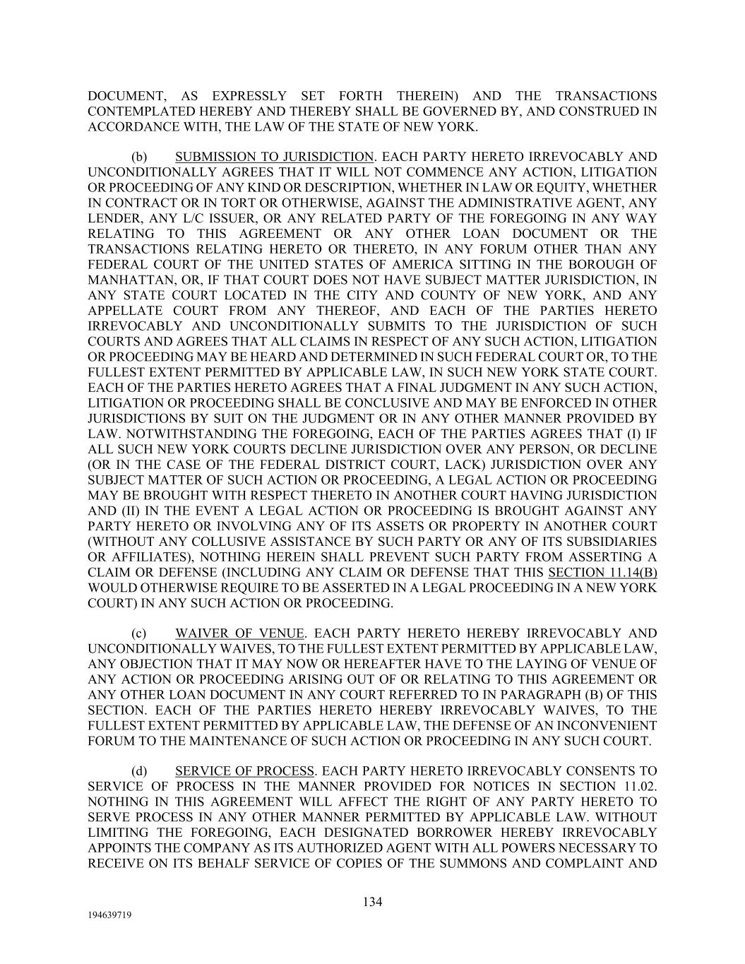134 194639719 DOCUMENT, AS EXPRESSLY SET FORTH THEREIN) AND THE TRANSACTIONS CONTEMPLATED HEREBY AND THEREBY SHALL BE GOVERNED BY, AND CONSTRUED IN ACCORDANCE WITH, THE LAW OF THE STATE OF NEW YORK. (b) SUBMISSION TO JURISDICTION. EACH PARTY HERETO IRREVOCABLY AND UNCONDITIONALLY AGREES THAT IT WILL NOT COMMENCE ANY ACTION, LITIGATION OR PROCEEDING OF ANY KIND OR DESCRIPTION, WHETHER IN LAW OR EQUITY, WHETHER IN CONTRACT OR IN TORT OR OTHERWISE, AGAINST THE ADMINISTRATIVE AGENT, ANY LENDER, ANY L/C ISSUER, OR ANY RELATED PARTY OF THE FOREGOING IN ANY WAY RELATING TO THIS AGREEMENT OR ANY OTHER LOAN DOCUMENT OR THE TRANSACTIONS RELATING HERETO OR THERETO, IN ANY FORUM OTHER THAN ANY FEDERAL COURT OF THE UNITED STATES OF AMERICA SITTING IN THE BOROUGH OF MANHATTAN, OR, IF THAT COURT DOES NOT HAVE SUBJECT MATTER JURISDICTION, IN ANY STATE COURT LOCATED IN THE CITY AND COUNTY OF NEW YORK, AND ANY APPELLATE COURT FROM ANY THEREOF, AND EACH OF THE PARTIES HERETO IRREVOCABLY AND UNCONDITIONALLY SUBMITS TO THE JURISDICTION OF SUCH COURTS AND AGREES THAT ALL CLAIMS IN RESPECT OF ANY SUCH ACTION, LITIGATION OR PROCEEDING MAY BE HEARD AND DETERMINED IN SUCH FEDERAL COURT OR, TO THE FULLEST EXTENT PERMITTED BY APPLICABLE LAW, IN SUCH NEW YORK STATE COURT. EACH OF THE PARTIES HERETO AGREES THAT A FINAL JUDGMENT IN ANY SUCH ACTION, LITIGATION OR PROCEEDING SHALL BE CONCLUSIVE AND MAY BE ENFORCED IN OTHER JURISDICTIONS BY SUIT ON THE JUDGMENT OR IN ANY OTHER MANNER PROVIDED BY LAW. NOTWITHSTANDING THE FOREGOING, EACH OF THE PARTIES AGREES THAT (I) IF ALL SUCH NEW YORK COURTS DECLINE JURISDICTION OVER ANY PERSON, OR DECLINE (OR IN THE CASE OF THE FEDERAL DISTRICT COURT, LACK) JURISDICTION OVER ANY SUBJECT MATTER OF SUCH ACTION OR PROCEEDING, A LEGAL ACTION OR PROCEEDING MAY BE BROUGHT WITH RESPECT THERETO IN ANOTHER COURT HAVING JURISDICTION AND (II) IN THE EVENT A LEGAL ACTION OR PROCEEDING IS BROUGHT AGAINST ANY PARTY HERETO OR INVOLVING ANY OF ITS ASSETS OR PROPERTY IN ANOTHER COURT (WITHOUT ANY COLLUSIVE ASSISTANCE BY SUCH PARTY OR ANY OF ITS SUBSIDIARIES OR AFFILIATES), NOTHING HEREIN SHALL PREVENT SUCH PARTY FROM ASSERTING A CLAIM OR DEFENSE (INCLUDING ANY CLAIM OR DEFENSE THAT THIS SECTION 11.14(B) WOULD OTHERWISE REQUIRE TO BE ASSERTED IN A LEGAL PROCEEDING IN A NEW YORK COURT) IN ANY SUCH ACTION OR PROCEEDING. (c) WAIVER OF VENUE. EACH PARTY HERETO HEREBY IRREVOCABLY AND UNCONDITIONALLY WAIVES, TO THE FULLEST EXTENT PERMITTED BY APPLICABLE LAW, ANY OBJECTION THAT IT MAY NOW OR HEREAFTER HAVE TO THE LAYING OF VENUE OF ANY ACTION OR PROCEEDING ARISING OUT OF OR RELATING TO THIS AGREEMENT OR ANY OTHER LOAN DOCUMENT IN ANY COURT REFERRED TO IN PARAGRAPH (B) OF THIS SECTION. EACH OF THE PARTIES HERETO HEREBY IRREVOCABLY WAIVES, TO THE FULLEST EXTENT PERMITTED BY APPLICABLE LAW, THE DEFENSE OF AN INCONVENIENT FORUM TO THE MAINTENANCE OF SUCH ACTION OR PROCEEDING IN ANY SUCH COURT. (d) SERVICE OF PROCESS. EACH PARTY HERETO IRREVOCABLY CONSENTS TO SERVICE OF PROCESS IN THE MANNER PROVIDED FOR NOTICES IN SECTION 11.02. NOTHING IN THIS AGREEMENT WILL AFFECT THE RIGHT OF ANY PARTY HERETO TO SERVE PROCESS IN ANY OTHER MANNER PERMITTED BY APPLICABLE LAW. WITHOUT LIMITING THE FOREGOING, EACH DESIGNATED BORROWER HEREBY IRREVOCABLY APPOINTS THE COMPANY AS ITS AUTHORIZED AGENT WITH ALL POWERS NECESSARY TO RECEIVE ON ITS BEHALF SERVICE OF COPIES OF THE SUMMONS AND COMPLAINT AND