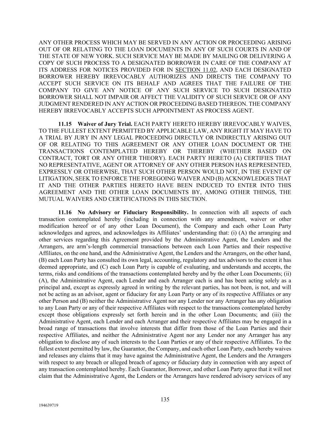135 194639719 ANY OTHER PROCESS WHICH MAY BE SERVED IN ANY ACTION OR PROCEEDING ARISING OUT OF OR RELATING TO THE LOAN DOCUMENTS IN ANY OF SUCH COURTS IN AND OF THE STATE OF NEW YORK. SUCH SERVICE MAY BE MADE BY MAILING OR DELIVERING A COPY OF SUCH PROCESS TO A DESIGNATED BORROWER IN CARE OF THE COMPANY AT ITS ADDRESS FOR NOTICES PROVIDED FOR IN SECTION 11.02, AND EACH DESIGNATED BORROWER HEREBY IRREVOCABLY AUTHORIZES AND DIRECTS THE COMPANY TO ACCEPT SUCH SERVICE ON ITS BEHALF AND AGREES THAT THE FAILURE OF THE COMPANY TO GIVE ANY NOTICE OF ANY SUCH SERVICE TO SUCH DESIGNATED BORROWER SHALL NOT IMPAIR OR AFFECT THE VALIDITY OF SUCH SERVICE OR OF ANY JUDGMENT RENDERED IN ANY ACTION OR PROCEEDING BASED THEREON. THE COMPANY HEREBY IRREVOCABLY ACCEPTS SUCH APPOINTMENT AS PROCESS AGENT. 11.15 Waiver of Jury Trial. EACH PARTY HERETO HEREBY IRREVOCABLY WAIVES, TO THE FULLEST EXTENT PERMITTED BY APPLICABLE LAW, ANY RIGHT IT MAY HAVE TO A TRIAL BY JURY IN ANY LEGAL PROCEEDING DIRECTLY OR INDIRECTLY ARISING OUT OF OR RELATING TO THIS AGREEMENT OR ANY OTHER LOAN DOCUMENT OR THE TRANSACTIONS CONTEMPLATED HEREBY OR THEREBY (WHETHER BASED ON CONTRACT, TORT OR ANY OTHER THEORY). EACH PARTY HERETO (A) CERTIFIES THAT NO REPRESENTATIVE, AGENT OR ATTORNEY OF ANY OTHER PERSON HAS REPRESENTED, EXPRESSLY OR OTHERWISE, THAT SUCH OTHER PERSON WOULD NOT, IN THE EVENT OF LITIGATION, SEEK TO ENFORCE THE FOREGOING WAIVER AND (B) ACKNOWLEDGES THAT IT AND THE OTHER PARTIES HERETO HAVE BEEN INDUCED TO ENTER INTO THIS AGREEMENT AND THE OTHER LOAN DOCUMENTS BY, AMONG OTHER THINGS, THE MUTUAL WAIVERS AND CERTIFICATIONS IN THIS SECTION. 11.16 No Advisory or Fiduciary Responsibility. In connection with all aspects of each transaction contemplated hereby (including in connection with any amendment, waiver or other modification hereof or of any other Loan Document), the Company and each other Loan Party acknowledges and agrees, and acknowledges its Affiliates’ understanding that: (i) (A) the arranging and other services regarding this Agreement provided by the Administrative Agent, the Lenders and the Arrangers, are arm’s-length commercial transactions between each Loan Parties and their respective Affiliates, on the one hand, and the Administrative Agent, the Lenders and the Arrangers, on the other hand, (B) each Loan Party has consulted its own legal, accounting, regulatory and tax advisors to the extent it has deemed appropriate, and (C) each Loan Party is capable of evaluating, and understands and accepts, the terms, risks and conditions of the transactions contemplated hereby and by the other Loan Documents; (ii) (A), the Administrative Agent, each Lender and each Arranger each is and has been acting solely as a principal and, except as expressly agreed in writing by the relevant parties, has not been, is not, and will not be acting as an advisor, agent or fiduciary for any Loan Party or any of its respective Affiliates or any other Person and (B) neither the Administrative Agent nor any Lender nor any Arranger has any obligation to any Loan Party or any of their respective Affiliates with respect to the transactions contemplated hereby except those obligations expressly set forth herein and in the other Loan Documents; and (iii) the Administrative Agent, each Lender and each Arranger and their respective Affiliates may be engaged in a broad range of transactions that involve interests that differ from those of the Loan Parties and their respective Affiliates, and neither the Administrative Agent nor any Lender nor any Arranger has any obligation to disclose any of such interests to the Loan Parties or any of their respective Affiliates. To the fullest extent permitted by law, the Guarantor, the Company, and each other Loan Party, each hereby waives and releases any claims that it may have against the Administrative Agent, the Lenders and the Arrangers with respect to any breach or alleged breach of agency or fiduciary duty in connection with any aspect of any transaction contemplated hereby. Each Guarantor, Borrower, and other Loan Party agree that it will not claim that the Administrative Agent, the Lenders or the Arrangers have rendered advisory services of any
