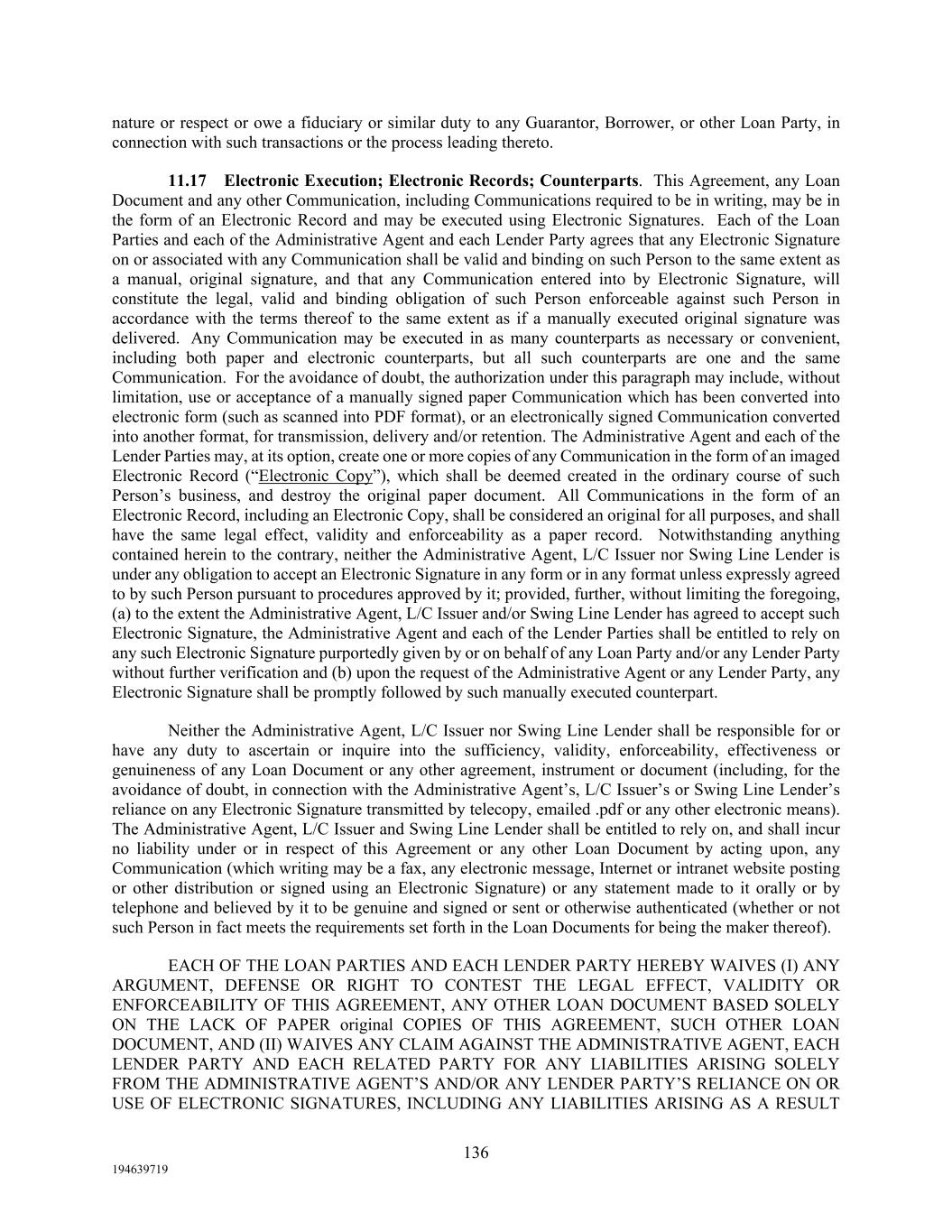 136 194639719 nature or respect or owe a fiduciary or similar duty to any Guarantor, Borrower, or other Loan Party, in connection with such transactions or the process leading thereto. 11.17 Electronic Execution; Electronic Records; Counterparts. This Agreement, any Loan Document and any other Communication, including Communications required to be in writing, may be in the form of an Electronic Record and may be executed using Electronic Signatures. Each of the Loan Parties and each of the Administrative Agent and each Lender Party agrees that any Electronic Signature on or associated with any Communication shall be valid and binding on such Person to the same extent as a manual, original signature, and that any Communication entered into by Electronic Signature, will constitute the legal, valid and binding obligation of such Person enforceable against such Person in accordance with the terms thereof to the same extent as if a manually executed original signature was delivered. Any Communication may be executed in as many counterparts as necessary or convenient, including both paper and electronic counterparts, but all such counterparts are one and the same Communication. For the avoidance of doubt, the authorization under this paragraph may include, without limitation, use or acceptance of a manually signed paper Communication which has been converted into electronic form (such as scanned into PDF format), or an electronically signed Communication converted into another format, for transmission, delivery and/or retention. The Administrative Agent and each of the Lender Parties may, at its option, create one or more copies of any Communication in the form of an imaged Electronic Record (“Electronic Copy”), which shall be deemed created in the ordinary course of such Person’s business, and destroy the original paper document. All Communications in the form of an Electronic Record, including an Electronic Copy, shall be considered an original for all purposes, and shall have the same legal effect, validity and enforceability as a paper record. Notwithstanding anything contained herein to the contrary, neither the Administrative Agent, L/C Issuer nor Swing Line Lender is under any obligation to accept an Electronic Signature in any form or in any format unless expressly agreed to by such Person pursuant to procedures approved by it; provided, further, without limiting the foregoing, (a) to the extent the Administrative Agent, L/C Issuer and/or Swing Line Lender has agreed to accept such Electronic Signature, the Administrative Agent and each of the Lender Parties shall be entitled to rely on any such Electronic Signature purportedly given by or on behalf of any Loan Party and/or any Lender Party without further verification and (b) upon the request of the Administrative Agent or any Lender Party, any Electronic Signature shall be promptly followed by such manually executed counterpart. Neither the Administrative Agent, L/C Issuer nor Swing Line Lender shall be responsible for or have any duty to ascertain or inquire into the sufficiency, validity, enforceability, effectiveness or genuineness of any Loan Document or any other agreement, instrument or document (including, for the avoidance of doubt, in connection with the Administrative Agent’s, L/C Issuer’s or Swing Line Lender’s reliance on any Electronic Signature transmitted by telecopy, emailed .pdf or any other electronic means). The Administrative Agent, L/C Issuer and Swing Line Lender shall be entitled to rely on, and shall incur no liability under or in respect of this Agreement or any other Loan Document by acting upon, any Communication (which writing may be a fax, any electronic message, Internet or intranet website posting or other distribution or signed using an Electronic Signature) or any statement made to it orally or by telephone and believed by it to be genuine and signed or sent or otherwise authenticated (whether or not such Person in fact meets the requirements set forth in the Loan Documents for being the maker thereof). EACH OF THE LOAN PARTIES AND EACH LENDER PARTY HEREBY WAIVES (I) ANY ARGUMENT, DEFENSE OR RIGHT TO CONTEST THE LEGAL EFFECT, VALIDITY OR ENFORCEABILITY OF THIS AGREEMENT, ANY OTHER LOAN DOCUMENT BASED SOLELY ON THE LACK OF PAPER original COPIES OF THIS AGREEMENT, SUCH OTHER LOAN DOCUMENT, AND (II) WAIVES ANY CLAIM AGAINST THE ADMINISTRATIVE AGENT, EACH LENDER PARTY AND EACH RELATED PARTY FOR ANY LIABILITIES ARISING SOLELY FROM THE ADMINISTRATIVE AGENT’S AND/OR ANY LENDER PARTY’S RELIANCE ON OR USE OF ELECTRONIC SIGNATURES, INCLUDING ANY LIABILITIES ARISING AS A RESULT
