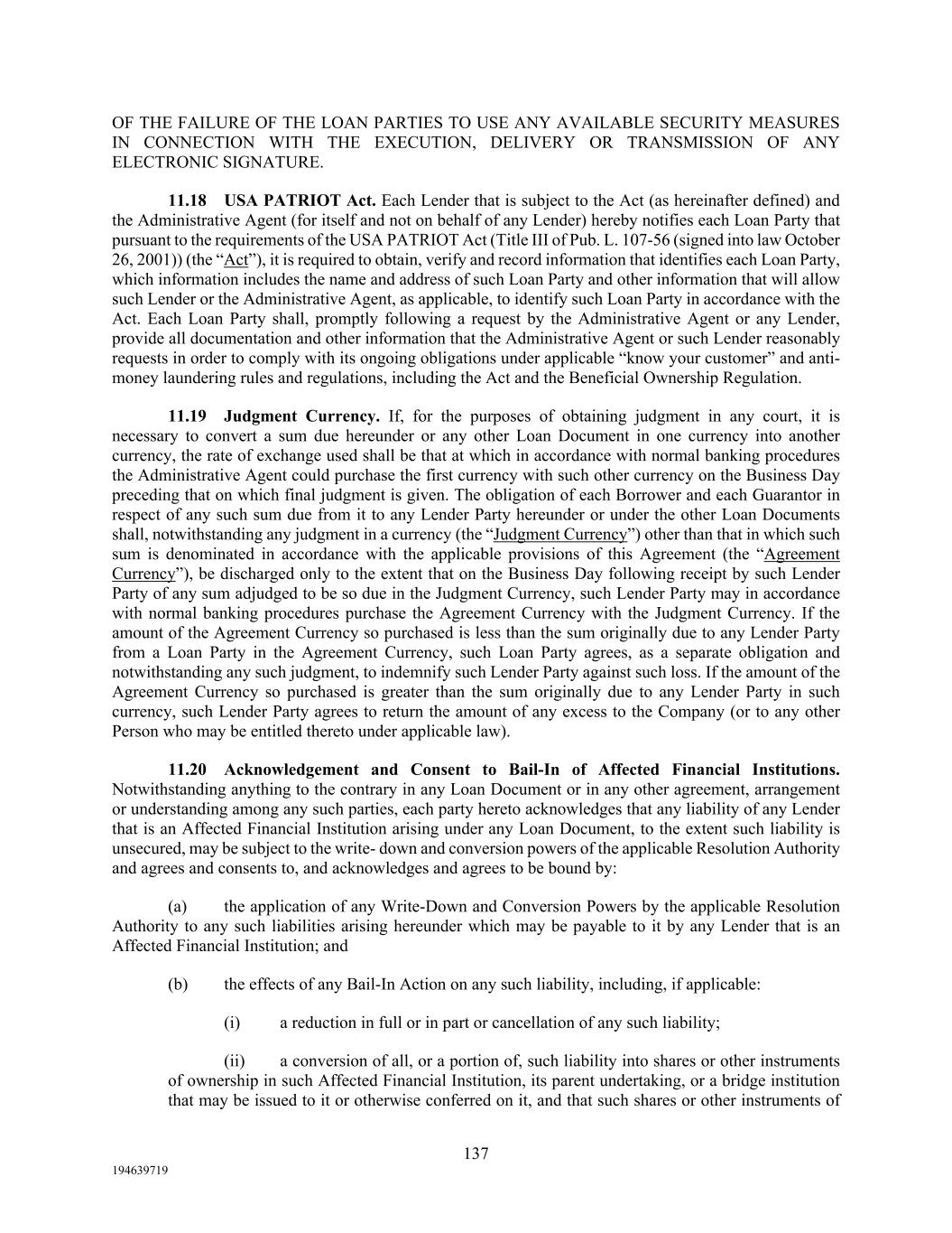 137 194639719 OF THE FAILURE OF THE LOAN PARTIES TO USE ANY AVAILABLE SECURITY MEASURES IN CONNECTION WITH THE EXECUTION, DELIVERY OR TRANSMISSION OF ANY ELECTRONIC SIGNATURE. 11.18 USA PATRIOT Act. Each Lender that is subject to the Act (as hereinafter defined) and the Administrative Agent (for itself and not on behalf of any Lender) hereby notifies each Loan Party that pursuant to the requirements of the USA PATRIOT Act (Title III of Pub. L. 107-56 (signed into law October 26, 2001)) (the “Act”), it is required to obtain, verify and record information that identifies each Loan Party, which information includes the name and address of such Loan Party and other information that will allow such Lender or the Administrative Agent, as applicable, to identify such Loan Party in accordance with the Act. Each Loan Party shall, promptly following a request by the Administrative Agent or any Lender, provide all documentation and other information that the Administrative Agent or such Lender reasonably requests in order to comply with its ongoing obligations under applicable “know your customer” and anti- money laundering rules and regulations, including the Act and the Beneficial Ownership Regulation. 11.19 Judgment Currency. If, for the purposes of obtaining judgment in any court, it is necessary to convert a sum due hereunder or any other Loan Document in one currency into another currency, the rate of exchange used shall be that at which in accordance with normal banking procedures the Administrative Agent could purchase the first currency with such other currency on the Business Day preceding that on which final judgment is given. The obligation of each Borrower and each Guarantor in respect of any such sum due from it to any Lender Party hereunder or under the other Loan Documents shall, notwithstanding any judgment in a currency (the “Judgment Currency”) other than that in which such sum is denominated in accordance with the applicable provisions of this Agreement (the “Agreement Currency”), be discharged only to the extent that on the Business Day following receipt by such Lender Party of any sum adjudged to be so due in the Judgment Currency, such Lender Party may in accordance with normal banking procedures purchase the Agreement Currency with the Judgment Currency. If the amount of the Agreement Currency so purchased is less than the sum originally due to any Lender Party from a Loan Party in the Agreement Currency, such Loan Party agrees, as a separate obligation and notwithstanding any such judgment, to indemnify such Lender Party against such loss. If the amount of the Agreement Currency so purchased is greater than the sum originally due to any Lender Party in such currency, such Lender Party agrees to return the amount of any excess to the Company (or to any other Person who may be entitled thereto under applicable law). 11.20 Acknowledgement and Consent to Bail-In of Affected Financial Institutions. Notwithstanding anything to the contrary in any Loan Document or in any other agreement, arrangement or understanding among any such parties, each party hereto acknowledges that any liability of any Lender that is an Affected Financial Institution arising under any Loan Document, to the extent such liability is unsecured, may be subject to the write- down and conversion powers of the applicable Resolution Authority and agrees and consents to, and acknowledges and agrees to be bound by: (a) the application of any Write-Down and Conversion Powers by the applicable Resolution Authority to any such liabilities arising hereunder which may be payable to it by any Lender that is an Affected Financial Institution; and (b) the effects of any Bail-In Action on any such liability, including, if applicable: (i) a reduction in full or in part or cancellation of any such liability; (ii) a conversion of all, or a portion of, such liability into shares or other instruments of ownership in such Affected Financial Institution, its parent undertaking, or a bridge institution that may be issued to it or otherwise conferred on it, and that such shares or other instruments of