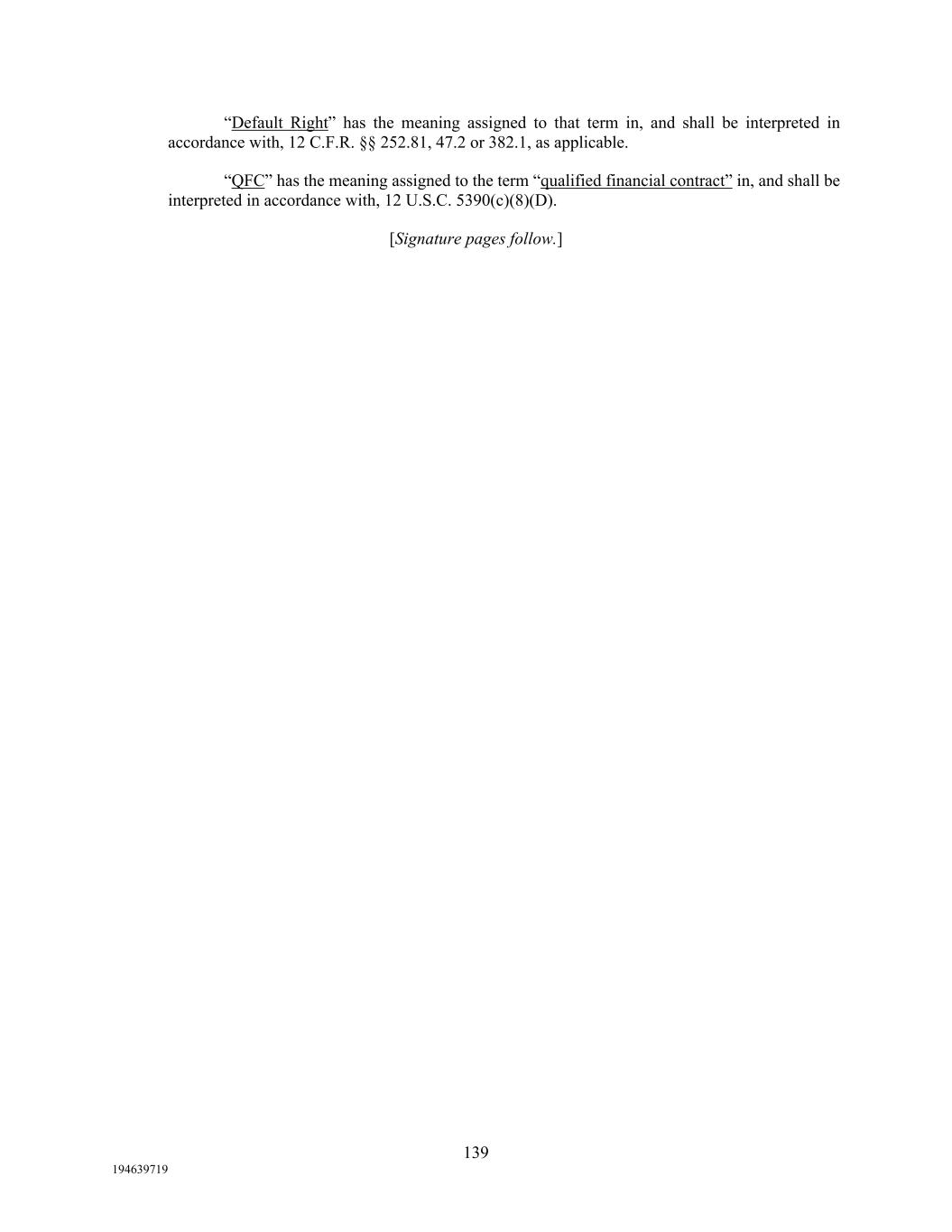 139 194639719 “Default Right” has the meaning assigned to that term in, and shall be interpreted in accordance with, 12 C.F.R. §§ 252.81, 47.2 or 382.1, as applicable. “QFC” has the meaning assigned to the term “qualified financial contract” in, and shall be interpreted in accordance with, 12 U.S.C. 5390(c)(8)(D). [Signature pages follow.]