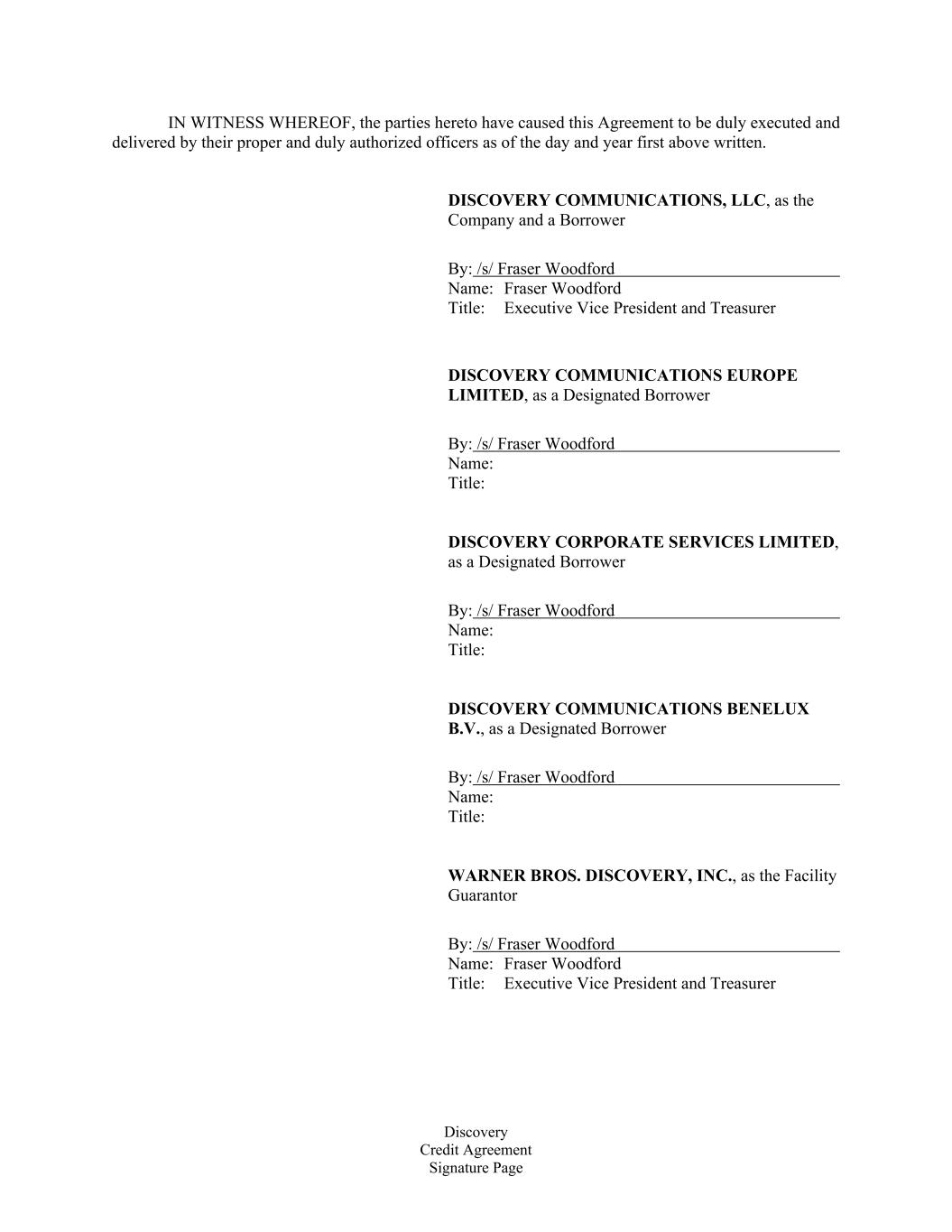 Discovery Credit Agreement Signature Page IN WITNESS WHEREOF, the parties hereto have caused this Agreement to be duly executed and delivered by their proper and duly authorized officers as of the day and year first above written. DISCOVERY COMMUNICATIONS, LLC, as the Company and a Borrower By: /s/ Fraser Woodford Name: Fraser Woodford Title: Executive Vice President and Treasurer DISCOVERY COMMUNICATIONS EUROPE LIMITED, as a Designated Borrower By: /s/ Fraser Woodford Name: Title: DISCOVERY CORPORATE SERVICES LIMITED, as a Designated Borrower By: /s/ Fraser Woodford Name: Title: DISCOVERY COMMUNICATIONS BENELUX B.V., as a Designated Borrower By: /s/ Fraser Woodford Name: Title: WARNER BROS. DISCOVERY, INC., as the Facility Guarantor By: /s/ Fraser Woodford Name: Fraser Woodford Title: Executive Vice President and Treasurer