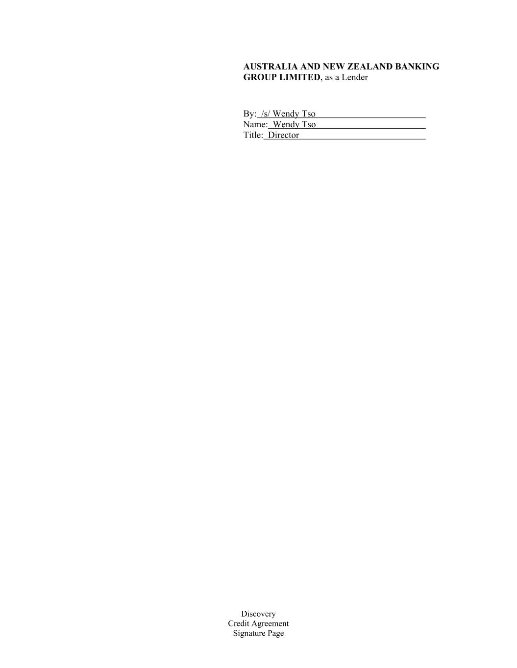 Discovery Credit Agreement Signature Page AUSTRALIA AND NEW ZEALAND BANKING GROUP LIMITED, as a Lender By: /s/ Wendy Tso Name: Wendy Tso Title: Director