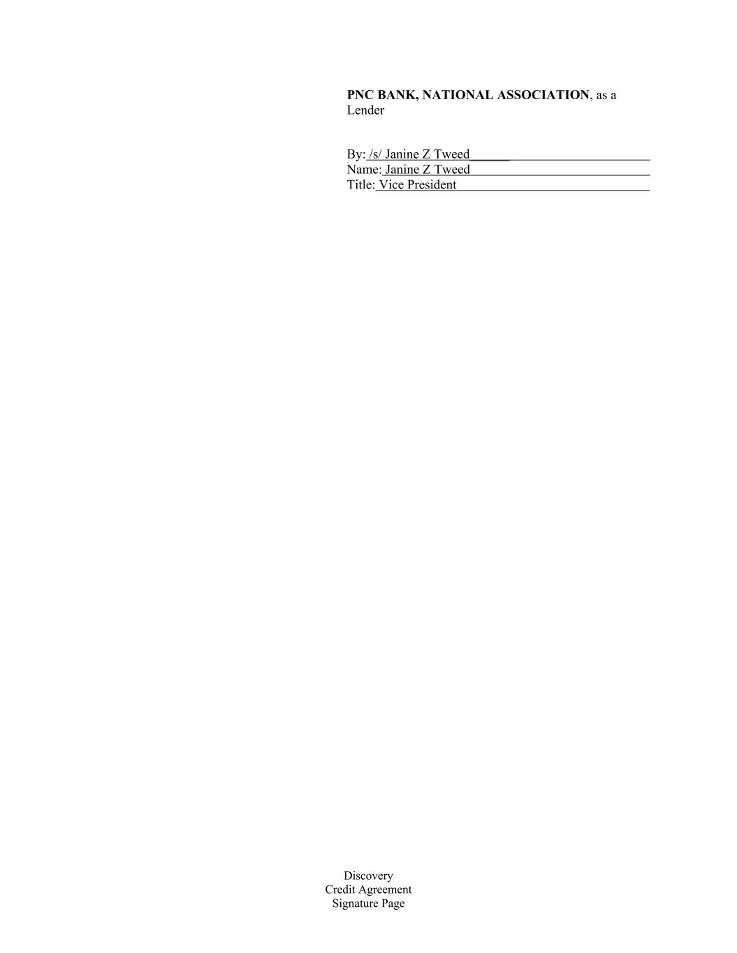 Discovery Credit Agreement Signature Page PNC BANK, NATIONAL ASSOCIATION, as a Lender By: /s/ Janine Z Tweed______ Name: Janine Z Tweed Title: Vice President