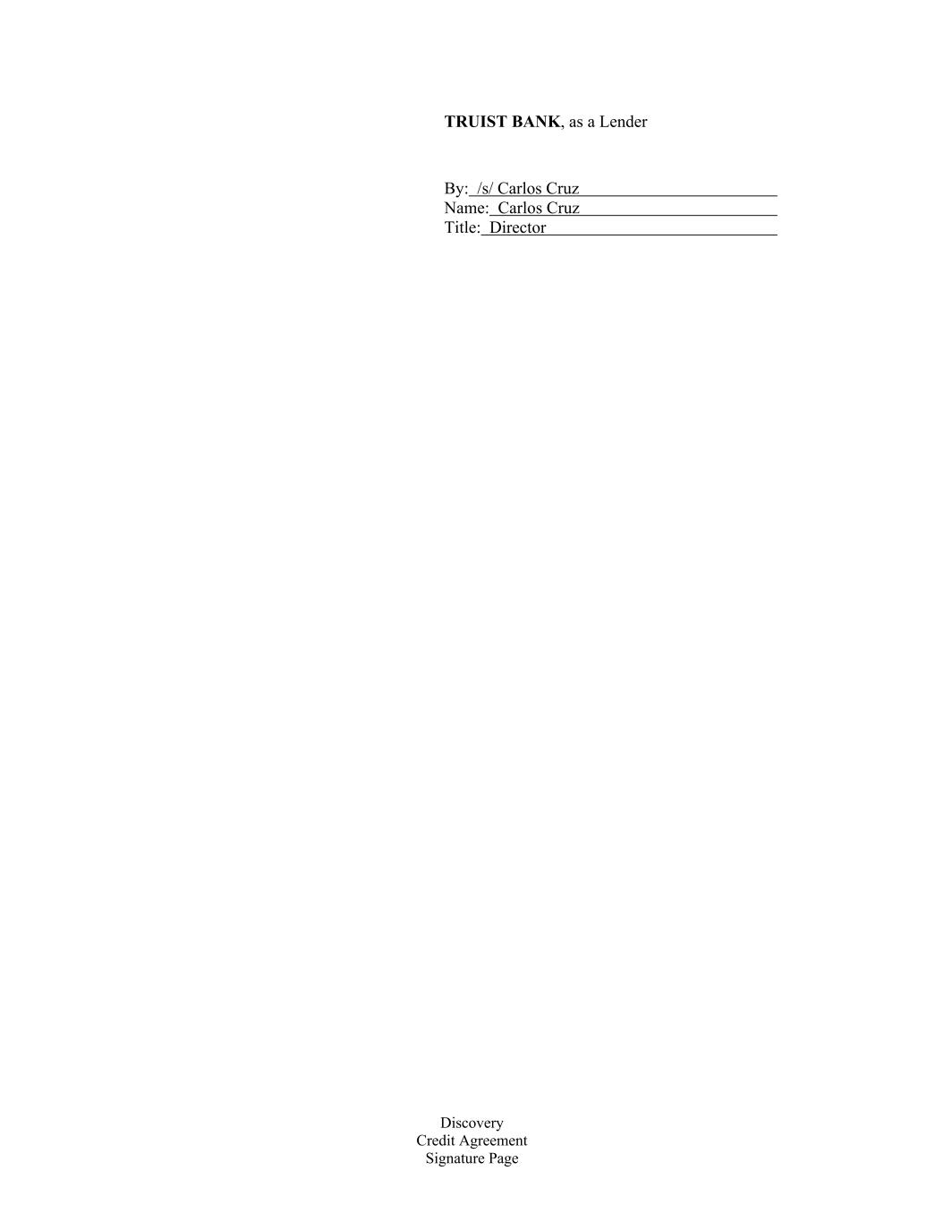 Discovery Credit Agreement Signature Page TRUIST BANK, as a Lender By: /s/ Carlos Cruz Name: Carlos Cruz Title: Director
