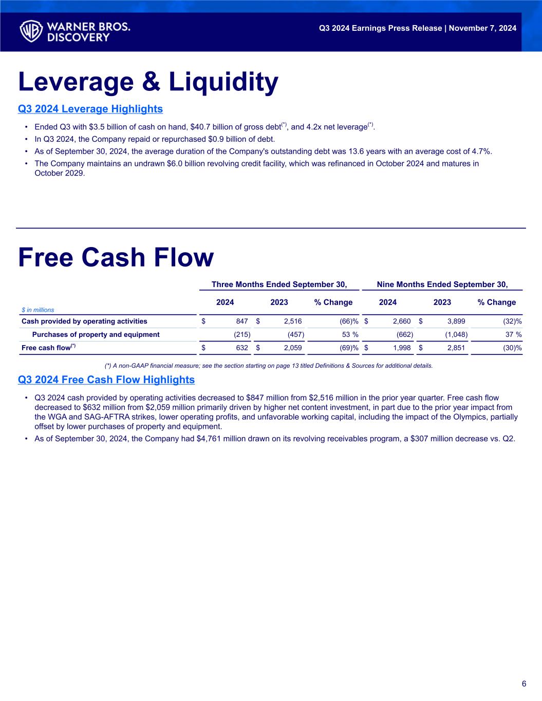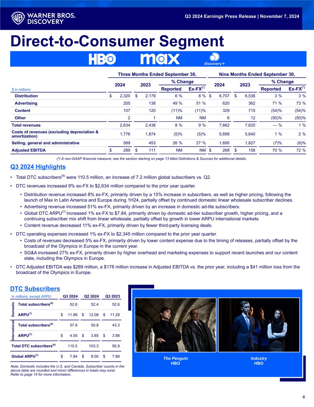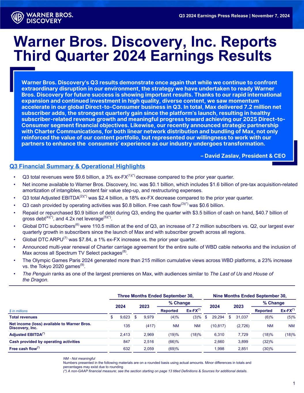 • Q3 total revenues were $9.6 billion, a 3% ex-FX(1)(*) decrease compared to the prior year quarter. • Net income available to Warner Bros. Discovery, Inc. was $0.1 billion, which includes $1.6 billion of pre-tax acquisition-related amortization of intangibles, content fair value step-up, and restructuring expenses. • Q3 total Adjusted EBITDA(2)(*) was $2.4 billion, a 18% ex-FX decrease compared to the prior year quarter. • Q3 cash provided by operating activities was $0.8 billion. Free cash flow(3)(*) was $0.6 billion. • Repaid or repurchased $0.9 billion of debt during Q3, ending the quarter with $3.5 billion of cash on hand, $40.7 billion of gross debt(4)(*), and 4.2x net leverage(5)(*). • Global DTC subscribers(6) were 110.5 million at the end of Q3, an increase of 7.2 million subscribers vs. Q2, our largest ever quarterly growth in subscribers since the launch of Max and with subscriber growth across all regions. • Global DTC ARPU(7) was $7.84, a 1% ex-FX increase vs. the prior year quarter. • Announced multi-year renewal of Charter carriage agreement for the entire suite of WBD cable networks and the inclusion of Max across all Spectrum TV Select packages(8). • The Olympic Games Paris 2024 generated more than 215 million cumulative views across WBD platforms, a 23% increase vs. the Tokyo 2020 games(9). • The Penguin ranks as one of the largest premieres on Max, with audiences similar to The Last of Us and House of the Dragon. Q3 2024 Earnings Press Release | November 7, 2024 Q3 Financial Summary & Operational Highlights Warner Bros. Discovery, Inc. Reports Third Quarter 2024 Earnings Results 1 Three Months Ended September 30, Nine Months Ended September 30, 2024 2023 % Change 2024 2023 % Change $ in millions Reported Ex-FX(*) Reported Ex-FX(*) Total revenues $ 9,623 $ 9,979 (4) % (3) % $ 29,294 $ 31,037 (6) % (5) % Net income (loss) available to Warner Bros. Discovery, Inc. 135 (417) NM NM (10,817) (2,726) NM NM Adjusted EBITDA(*) 2,413 2,969 (19) % (18) % 6,310 7,729 (18) % (18) % Cash provided by operating activities 847 2,516 (66) % 2,660 3,899 (32) % Free cash flow(*) 632 2,059 (69) % 1,998 2,851 (30) % NM - Not meaningful Numbers presented in the following materials are on a rounded basis using actual amounts. Minor differences in totals and percentages may exist due to rounding (*) A non-GAAP financial measure; see the section starting on page 13 titled Definitions & Sources for additional details. Warner Bros. Discovery's Q3 results demonstrate once again that while we continue to confront extraordinary disruption in our environment, the strategy we have undertaken to ready Warner Bros. Discovery for future success is showing important results. Thanks to our rapid international expansion and continued investment in high quality, diverse content, we saw momentum accelerate in our global Direct-to-Consumer business in Q3. In total, Max delivered 7.2 million net subscriber adds, the strongest quarterly gain since the platform’s launch, resulting in healthy subscriber-related revenue growth and meaningful progress toward achieving our 2025 Direct-to- Consumer segment financial objectives. Likewise, our recently announced strategic partnership with Charter Communications, for both linear network distribution and bundling of Max, not only reinforced the value of our content portfolio, but represented our willingness to work with our partners to enhance the consumers’ experience as our industry undergoes transformation. – David Zaslav, President & CEO
