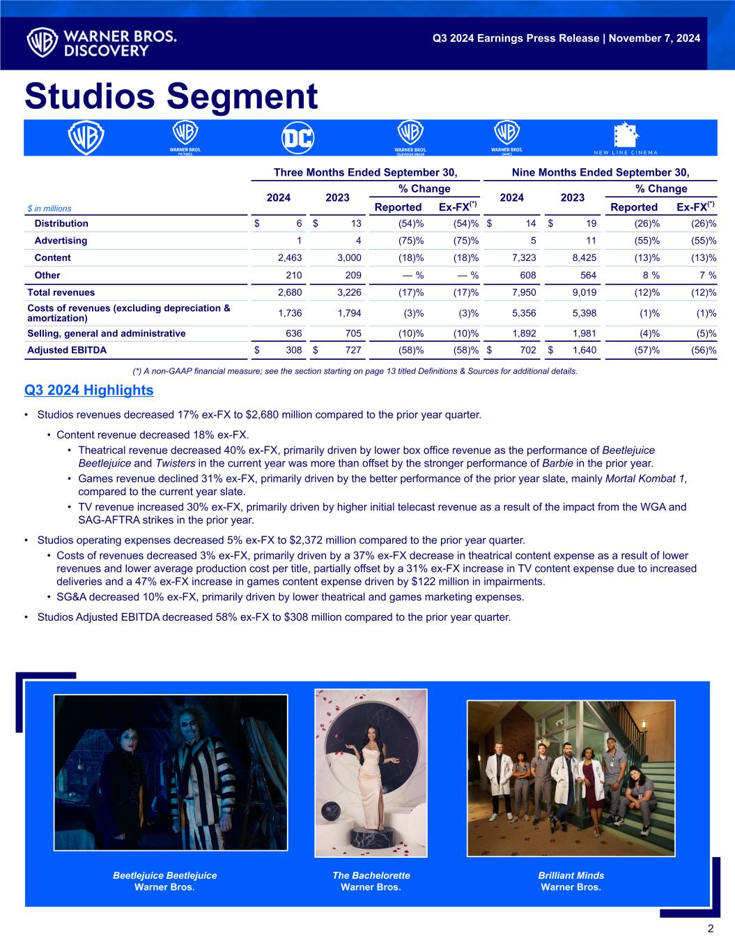 Three Months Ended September 30, Nine Months Ended September 30, 2024 2023 % Change 2024 2023 % Change $ in millions Reported Ex-FX(*) Reported Ex-FX(*) Distribution $ 6 $ 13 (54) % (54) % $ 14 $ 19 (26) % (26) % Advertising 1 4 (75) % (75) % 5 11 (55) % (55) % Content 2,463 3,000 (18) % (18) % 7,323 8,425 (13) % (13) % Other 210 209 — % — % 608 564 8 % 7 % Total revenues 2,680 3,226 (17) % (17) % 7,950 9,019 (12) % (12) % Costs of revenues (excluding depreciation & amortization) 1,736 1,794 (3) % (3) % 5,356 5,398 (1) % (1) % Selling, general and administrative 636 705 (10) % (10) % 1,892 1,981 (4) % (5) % Adjusted EBITDA $ 308 $ 727 (58) % (58) % $ 702 $ 1,640 (57) % (56) % 2 Studios Segment (*) A non-GAAP financial measure; see the section starting on page 13 titled Definitions & Sources for additional details. Q3 2024 Highlights Beetlejuice Beetlejuice Warner Bros. Q3 2024 Earnings Press Release | November 7, 2024 Brilliant Minds Warner Bros. The Bachelorette Warner Bros. • Studios revenues decreased 17% ex-FX to $2,680 million compared to the prior year quarter. • Content revenue decreased 18% ex-FX. • Theatrical revenue decreased 40% ex-FX, primarily driven by lower box office revenue as the performance of Beetlejuice Beetlejuice and Twisters in the current year was more than offset by the stronger performance of Barbie in the prior year. • Games revenue declined 31% ex-FX, primarily driven by the better performance of the prior year slate, mainly Mortal Kombat 1, compared to the current year slate. • TV revenue increased 30% ex-FX, primarily driven by higher initial telecast revenue as a result of the impact from the WGA and SAG-AFTRA strikes in the prior year. • Studios operating expenses decreased 5% ex-FX to $2,372 million compared to the prior year quarter. • Costs of revenues decreased 3% ex-FX, primarily driven by a 37% ex-FX decrease in theatrical content expense as a result of lower revenues and lower average production cost per title, partially offset by a 31% ex-FX increase in TV content expense due to increased deliveries and a 47% ex-FX increase in games content expense driven by $122 million in impairments. • SG&A decreased 10% ex-FX, primarily driven by lower theatrical and games marketing expenses. • Studios Adjusted EBITDA decreased 58% ex-FX to $308 million compared to the prior year quarter.