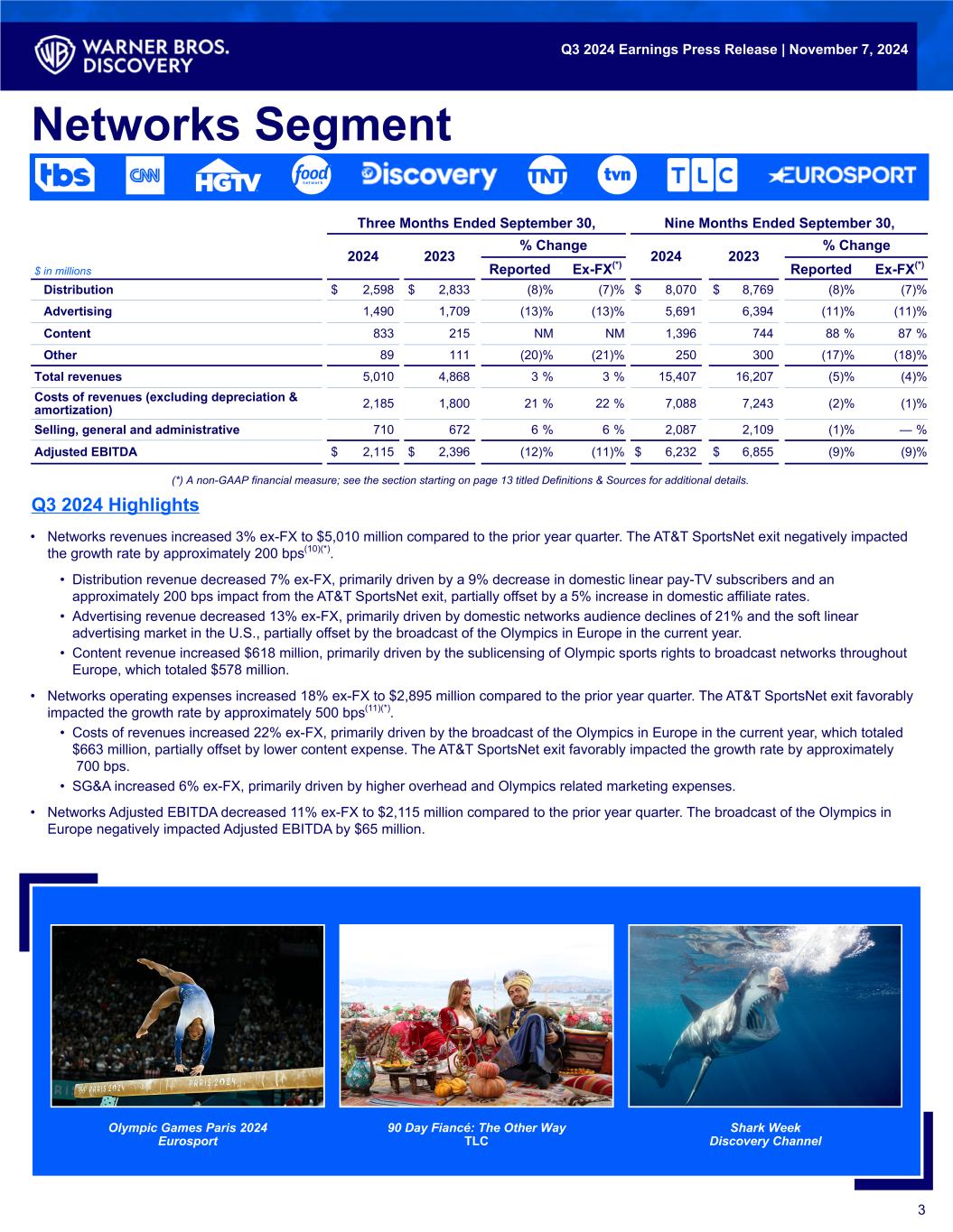 • Networks revenues increased 3% ex-FX to $5,010 million compared to the prior year quarter. The AT&T SportsNet exit negatively impacted the growth rate by approximately 200 bps(10)(*). • Distribution revenue decreased 7% ex-FX, primarily driven by a 9% decrease in domestic linear pay-TV subscribers and an approximately 200 bps impact from the AT&T SportsNet exit, partially offset by a 5% increase in domestic affiliate rates. • Advertising revenue decreased 13% ex-FX, primarily driven by domestic networks audience declines of 21% and the soft linear advertising market in the U.S., partially offset by the broadcast of the Olympics in Europe in the current year. • Content revenue increased $618 million, primarily driven by the sublicensing of Olympic sports rights to broadcast networks throughout Europe, which totaled $578 million. • Networks operating expenses increased 18% ex-FX to $2,895 million compared to the prior year quarter. The AT&T SportsNet exit favorably impacted the growth rate by approximately 500 bps(11)(*). • Costs of revenues increased 22% ex-FX, primarily driven by the broadcast of the Olympics in Europe in the current year, which totaled $663 million, partially offset by lower content expense. The AT&T SportsNet exit favorably impacted the growth rate by approximately 700 bps. • SG&A increased 6% ex-FX, primarily driven by higher overhead and Olympics related marketing expenses. • Networks Adjusted EBITDA decreased 11% ex-FX to $2,115 million compared to the prior year quarter. The broadcast of the Olympics in Europe negatively impacted Adjusted EBITDA by $65 million. Che Tempo Che Fa N Networks Segment Three Months Ended September 30, Nine Months Ended September 30, 2024 2023 % Change 2024 2023 % Change $ in millions Reported Ex-FX(*) Reported Ex-FX(*) Distribution $ 2,598 $ 2,833 (8) % (7) % $ 8,070 $ 8,769 (8) % (7) % Advertising 1,490 1,709 (13) % (13) % 5,691 6,394 (11) % (11) % Content 833 215 NM NM 1,396 744 88 % 87 % Other 89 111 (20) % (21) % 250 300 (17) % (18) % Total revenues 5,010 4,868 3 % 3 % 15,407 16,207 (5) % (4) % Costs of revenues (excluding depreciation & amortization) 2,185 1,800 21 % 22 % 7,088 7,243 (2) % (1) % Selling, general and administrative 710 672 6 % 6 % 2,087 2,109 (1) % — % Adjusted EBITDA $ 2,115 $ 2,396 (12) % (11) % $ 6,232 $ 6,855 (9) % (9) % 3 Olympic Games Paris 2024 Eurosport Q3 2024 Highlights Q3 2024 Earnings Press Release | November 7, 2024 (*) A non-GAAP financial measure; see the section starting on page 13 titled Definitions & Sources for additional details. Shark Week Discovery Channel 90 Day Fiancé: The Other Way TLC