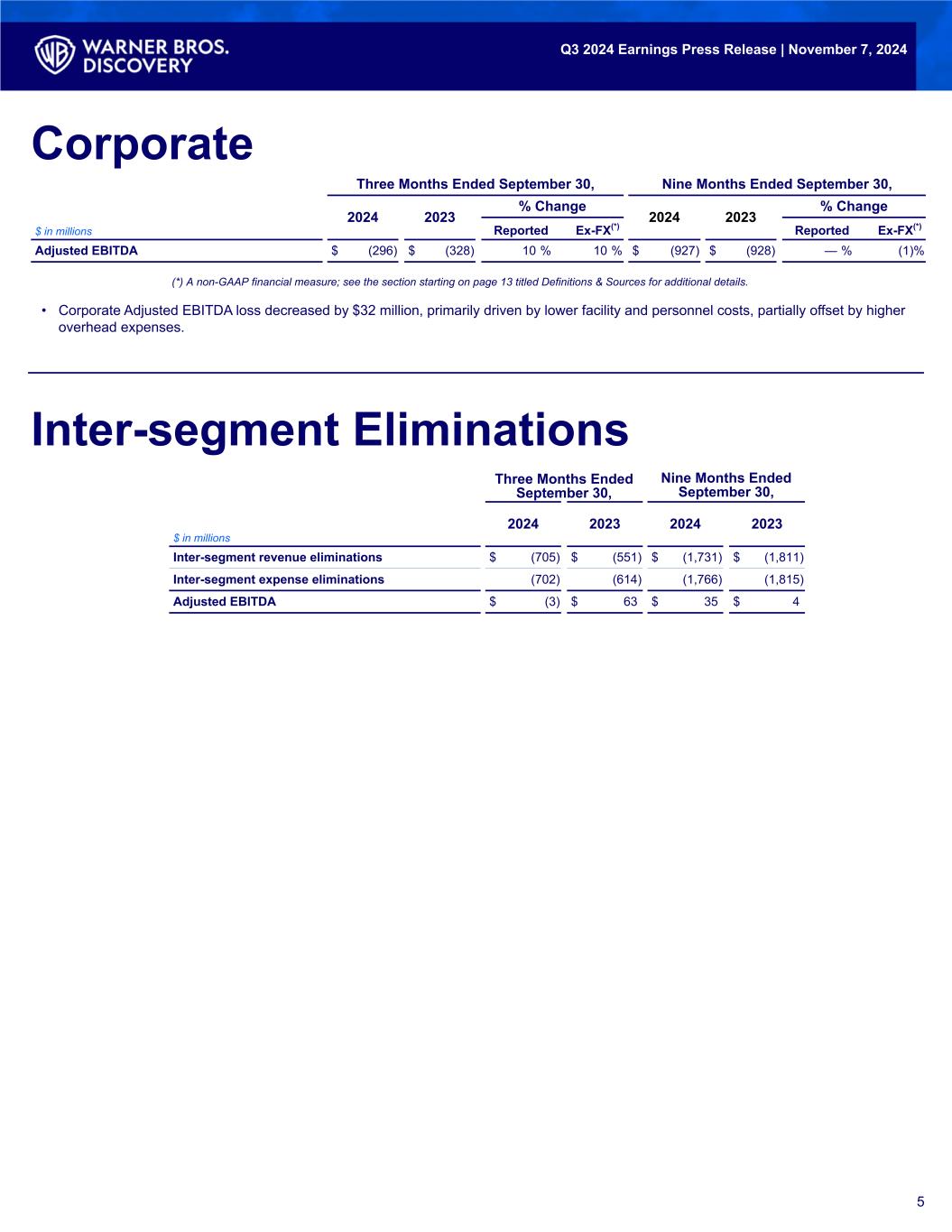 • Total DTC subscribers(6) were 110.5 million, an increase of 7.2 million global subscribers vs. Q2. • DTC revenues increased 9% ex-FX to $2,634 million compared to the prior year quarter. • Distribution revenue increased 8% ex-FX, primarily driven by a 15% increase in subscribers, as well as higher pricing, following the launch of Max in Latin America and Europe during 1H24, partially offset by continued domestic linear wholesale subscriber declines. • Advertising revenue increased 51% ex-FX, primarily driven by an increase in domestic ad-lite subscribers. • Global DTC ARPU(7) increased 1% ex-FX to $7.84, primarily driven by domestic ad-tier subscriber growth, higher pricing, and a continuing subscriber mix shift from linear wholesale, partially offset by growth in lower ARPU international markets. • Content revenue decreased 11% ex-FX, primarily driven by fewer third-party licensing deals. • DTC operating expenses increased 1% ex-FX to $2,345 million compared to the prior year quarter. • Costs of revenues decreased 5% ex-FX, primarily driven by lower content expense due to the timing of releases, partially offset by the broadcast of the Olympics in Europe in the current year. • SG&A increased 27% ex-FX, primarily driven by higher overhead and marketing expenses to support recent launches and our content slate, including the Olympics in Europe. • DTC Adjusted EBITDA was $289 million, a $178 million increase in Adjusted EBITDA vs. the prior year, including a $41 million loss from the broadcast of the Olympics in Europe. 4 Three Months Ended September 30, Nine Months Ended September 30, 2024 2023 % Change 2024 2023 % Change $ in millions Reported Ex-FX(*) Reported Ex-FX(*) Distribution $ 2,320 $ 2,179 6 % 8 % $ 6,707 $ 6,536 3 % 3 % Advertising 205 138 49 % 51 % 620 362 71 % 73 % Content 107 120 (11) % (11) % 329 715 (54) % (54) % Other 2 1 NM NM 6 12 (50) % (50) % Total revenues 2,634 2,438 8 % 9 % 7,662 7,625 — % 1 % Costs of revenues (excluding depreciation & amortization) 1,776 1,874 (5) % (5) % 5,699 5,640 1 % 2 % Selling, general and administrative 569 453 26 % 27 % 1,695 1,827 (7) % (6) % Adjusted EBITDA $ 289 $ 111 NM NM $ 268 $ 158 70 % 72 % In millions, except ARPU Q3 2024 Q2 2024 Q3 2023 Total subscribers(6) 52.6 52.4 52.6 ARPU(7) $ 11.99 $ 12.08 $ 11.29 Total subscribers(6) 57.9 50.8 43.3 ARPU(7) $ 4.05 $ 3.85 $ 3.98 Total DTC subscribers(6) 110.5 103.3 95.9 Global ARPU(7) $ 7.84 $ 8.00 $ 7.88 DTC Subscribers Direct-to-Consumer Segment In te rn at io na l D om es tic Note: Domestic includes the U.S. and Canada. Subscriber counts in the above table are rounded and minor differences in totals may exist. Refer to page 14 for more information. Q3 2024 Highlights Q3 2024 Earnings Press Release | November 7, 2024 Industry HBO (*) A non-GAAP financial measure; see the section starting on page 13 titled Definitions & Sources for additional details. The Penguin HBO