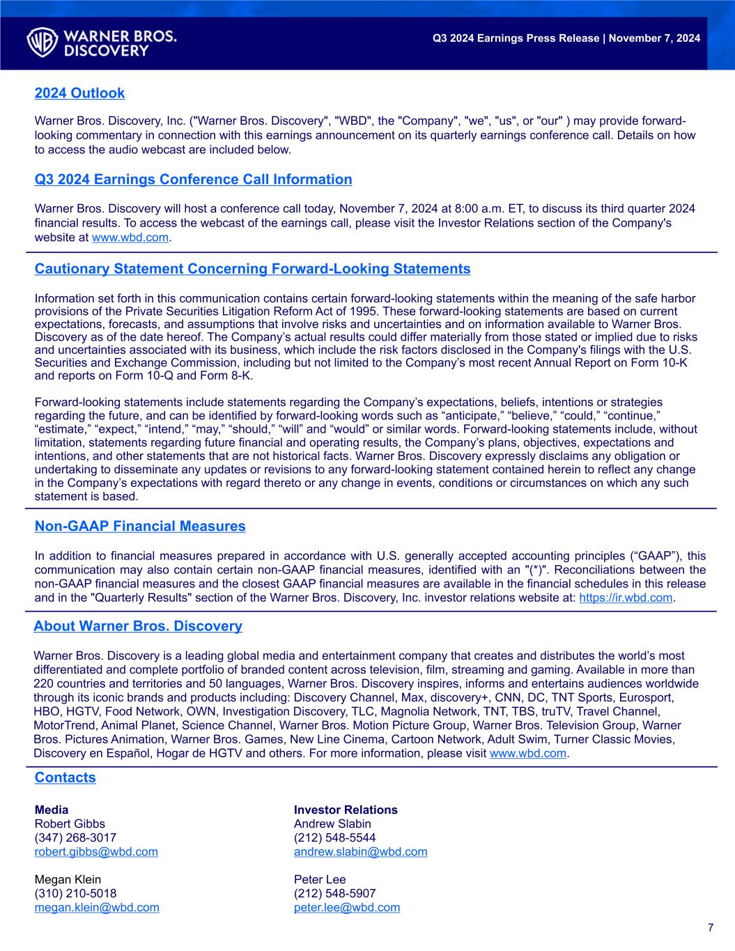 Cautionary Statement Concerning Forward-Looking Statements Information set forth in this communication contains certain forward-looking statements within the meaning of the safe harbor provisions of the Private Securities Litigation Reform Act of 1995. These forward-looking statements are based on current expectations, forecasts, and assumptions that involve risks and uncertainties and on information available to Warner Bros. Discovery as of the date hereof. The Company’s actual results could differ materially from those stated or implied due to risks and uncertainties associated with its business, which include the risk factors disclosed in the Company's filings with the U.S. Securities and Exchange Commission, including but not limited to the Company’s most recent Annual Report on Form 10-K and reports on Form 10-Q and Form 8-K. Forward-looking statements include statements regarding the Company’s expectations, beliefs, intentions or strategies regarding the future, and can be identified by forward-looking words such as “anticipate,” “believe,” “could,” “continue,” “estimate,” “expect,” “intend,” “may,” “should,” “will” and “would” or similar words. Forward-looking statements include, without limitation, statements regarding future financial and operating results, the Company’s plans, objectives, expectations and intentions, and other statements that are not historical facts. Warner Bros. Discovery expressly disclaims any obligation or undertaking to disseminate any updates or revisions to any forward-looking statement contained herein to reflect any change in the Company’s expectations with regard thereto or any change in events, conditions or circumstances on which any such statement is based. 7 2024 Outlook Warner Bros. Discovery, Inc. ("Warner Bros. Discovery", "WBD", the "Company", "we", "us", or "our" ) may provide forward- looking commentary in connection with this earnings announcement on its quarterly earnings conference call. Details on how to access the audio webcast are included below. Q3 2024 Earnings Conference Call Information Warner Bros. Discovery will host a conference call today, November 7, 2024 at 8:00 a.m. ET, to discuss its third quarter 2024 financial results. To access the webcast of the earnings call, please visit the Investor Relations section of the Company's website at www.wbd.com. Non-GAAP Financial Measures In addition to financial measures prepared in accordance with U.S. generally accepted accounting principles (“GAAP”), this communication may also contain certain non-GAAP financial measures, identified with an "(*)". Reconciliations between the non-GAAP financial measures and the closest GAAP financial measures are available in the financial schedules in this release and in the "Quarterly Results" section of the Warner Bros. Discovery, Inc. investor relations website at: https://ir.wbd.com. Q3 2024 Earnings Press Release | November 7, 2024 About Warner Bros. Discovery Warner Bros. Discovery is a leading global media and entertainment company that creates and distributes the world’s most differentiated and complete portfolio of branded content across television, film, streaming and gaming. Available in more than 220 countries and territories and 50 languages, Warner Bros. Discovery inspires, informs and entertains audiences worldwide through its iconic brands and products including: Discovery Channel, Max, discovery+, CNN, DC, TNT Sports, Eurosport, HBO, HGTV, Food Network, OWN, Investigation Discovery, TLC, Magnolia Network, TNT, TBS, truTV, Travel Channel, MotorTrend, Animal Planet, Science Channel, Warner Bros. Motion Picture Group, Warner Bros. Television Group, Warner Bros. Pictures Animation, Warner Bros. Games, New Line Cinema, Cartoon Network, Adult Swim, Turner Classic Movies, Discovery en Español, Hogar de HGTV and others. For more information, please visit www.wbd.com. Contacts Media Investor Relations Robert Gibbs Andrew Slabin (347) 268-3017 (212) 548-5544 robert.gibbs@wbd.com andrew.slabin@wbd.com Megan Klein Peter Lee (310) 210-5018 (212) 548-5907 megan.klein@wbd.com peter.lee@wbd.com