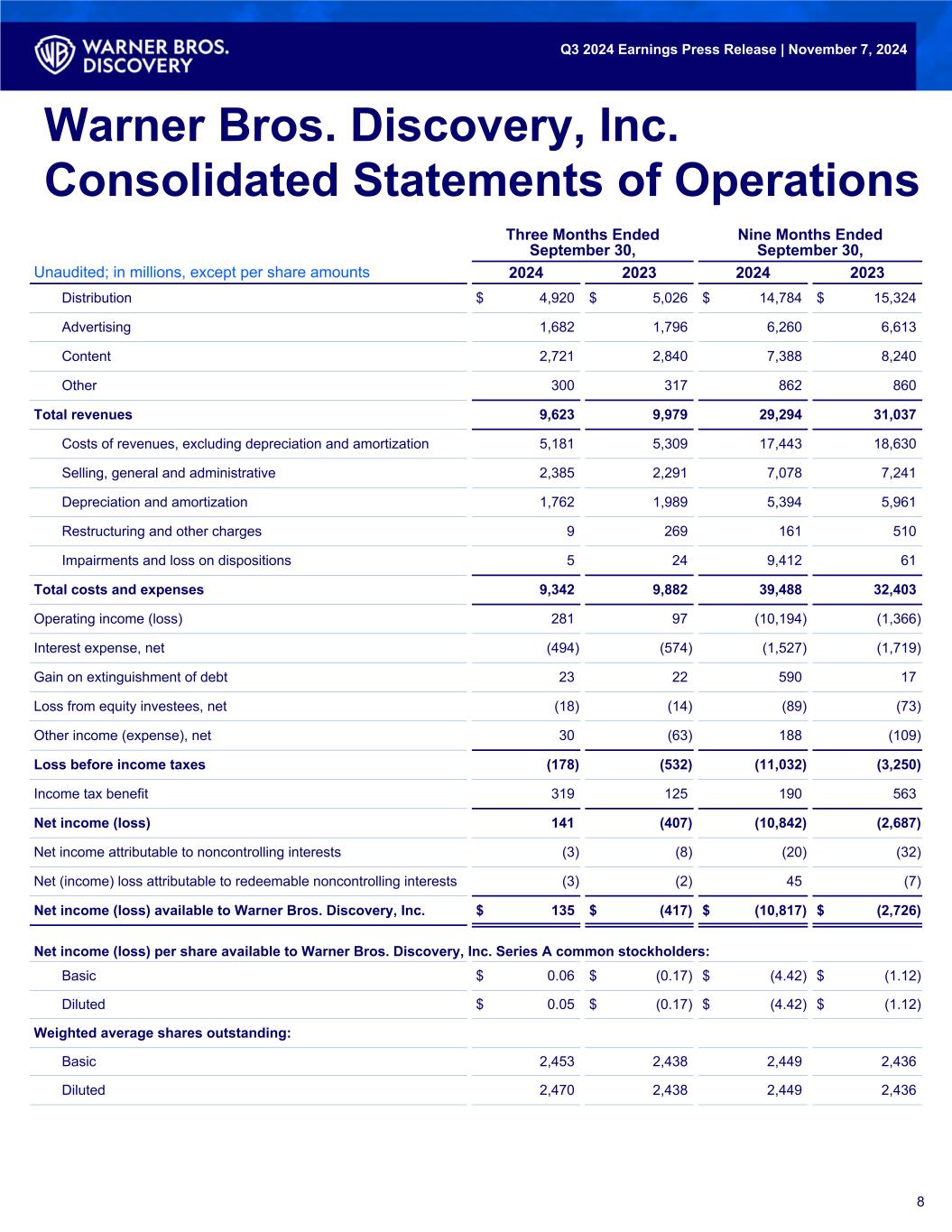 Three Months Ended September 30, Nine Months Ended September 30, Unaudited; in millions, except per share amounts 2024 2023 2024 2023 Distribution $ 4,920 $ 5,026 $ 14,784 $ 15,324 Advertising 1,682 1,796 6,260 6,613 Content 2,721 2,840 7,388 8,240 Other 300 317 862 860 Total revenues 9,623 9,979 29,294 31,037 Costs of revenues, excluding depreciation and amortization 5,181 5,309 17,443 18,630 Selling, general and administrative 2,385 2,291 7,078 7,241 Depreciation and amortization 1,762 1,989 5,394 5,961 Restructuring and other charges 9 269 161 510 Impairments and loss on dispositions 5 24 9,412 61 Total costs and expenses 9,342 9,882 39,488 32,403 Operating income (loss) 281 97 (10,194) (1,366) Interest expense, net (494) (574) (1,527) (1,719) Gain on extinguishment of debt 23 22 590 17 Loss from equity investees, net (18) (14) (89) (73) Other income (expense), net 30 (63) 188 (109) Loss before income taxes (178) (532) (11,032) (3,250) Income tax benefit 319 125 190 563 Net income (loss) 141 (407) (10,842) (2,687) Net income attributable to noncontrolling interests (3) (8) (20) (32) Net (income) loss attributable to redeemable noncontrolling interests (3) (2) 45 (7) Net income (loss) available to Warner Bros. Discovery, Inc. $ 135 $ (417) $ (10,817) $ (2,726) Net income (loss) per share available to Warner Bros. Discovery, Inc. Series A common stockholders: Basic $ 0.06 $ (0.17) $ (4.42) $ (1.12) Diluted $ 0.05 $ (0.17) $ (4.42) $ (1.12) Weighted average shares outstanding: Basic 2,453 2,438 2,449 2,436 Diluted 2,470 2,438 2,449 2,436 8 Warner Bros. Discovery, Inc. Consolidated Statements of Operations Q3 2024 Earnings Press Release | November 7, 2024
