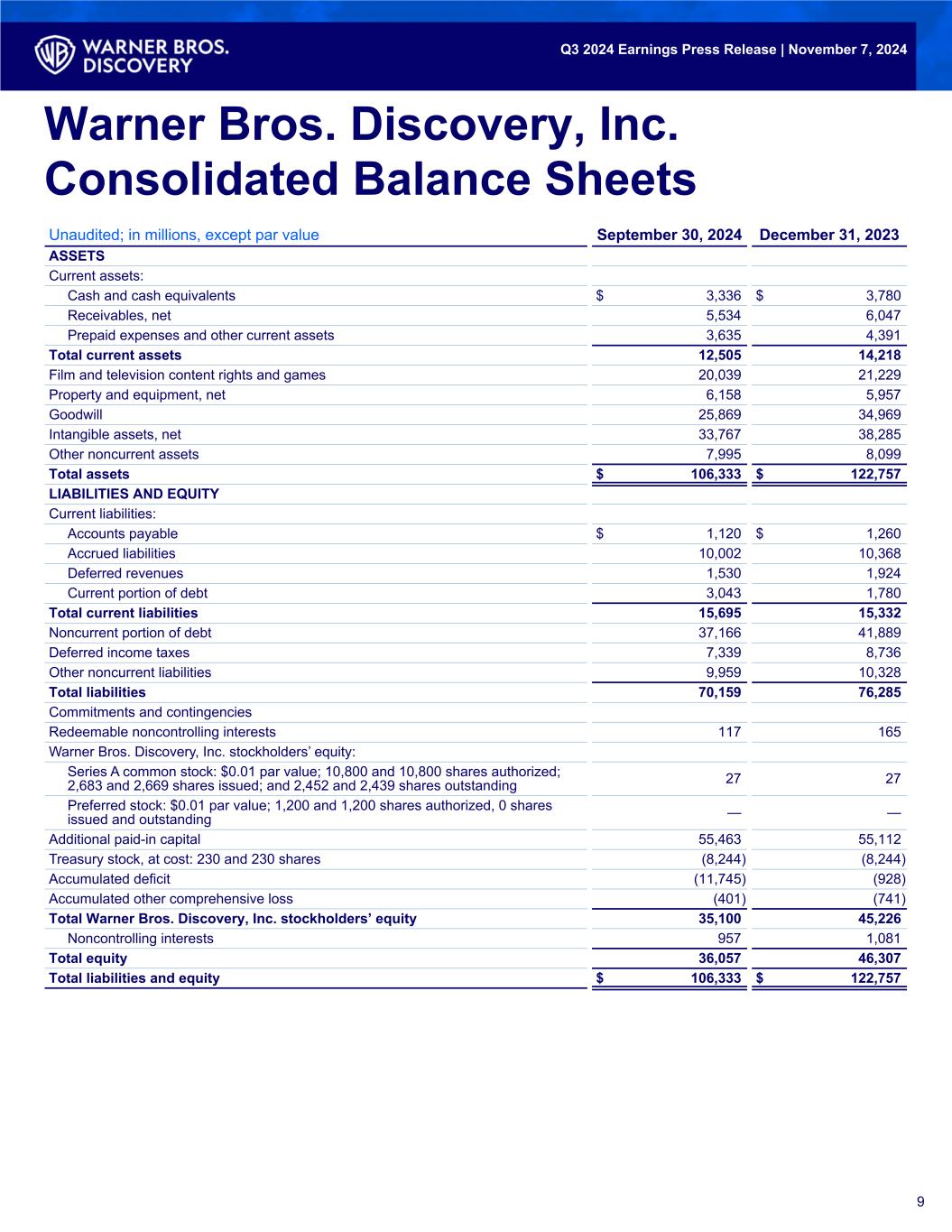 9 Unaudited; in millions, except par value September 30, 2024 December 31, 2023 ASSETS Current assets: Cash and cash equivalents $ 3,336 $ 3,780 Receivables, net 5,534 6,047 Prepaid expenses and other current assets 3,635 4,391 Total current assets 12,505 14,218 Film and television content rights and games 20,039 21,229 Property and equipment, net 6,158 5,957 Goodwill 25,869 34,969 Intangible assets, net 33,767 38,285 Other noncurrent assets 7,995 8,099 Total assets $ 106,333 $ 122,757 LIABILITIES AND EQUITY Current liabilities: Accounts payable $ 1,120 $ 1,260 Accrued liabilities 10,002 10,368 Deferred revenues 1,530 1,924 Current portion of debt 3,043 1,780 Total current liabilities 15,695 15,332 Noncurrent portion of debt 37,166 41,889 Deferred income taxes 7,339 8,736 Other noncurrent liabilities 9,959 10,328 Total liabilities 70,159 76,285 Commitments and contingencies Redeemable noncontrolling interests 117 165 Warner Bros. Discovery, Inc. stockholders’ equity: Series A common stock: $0.01 par value; 10,800 and 10,800 shares authorized; 2,683 and 2,669 shares issued; and 2,452 and 2,439 shares outstanding 27 27 Preferred stock: $0.01 par value; 1,200 and 1,200 shares authorized, 0 shares issued and outstanding — — Additional paid-in capital 55,463 55,112 Treasury stock, at cost: 230 and 230 shares (8,244) (8,244) Accumulated deficit (11,745) (928) Accumulated other comprehensive loss (401) (741) Total Warner Bros. Discovery, Inc. stockholders’ equity 35,100 45,226 Noncontrolling interests 957 1,081 Total equity 36,057 46,307 Total liabilities and equity $ 106,333 $ 122,757 9 Warner Bros. Discovery, Inc. Consolidated Balance Sheets Q3 2024 Earnings Press Release | November 7, 2024