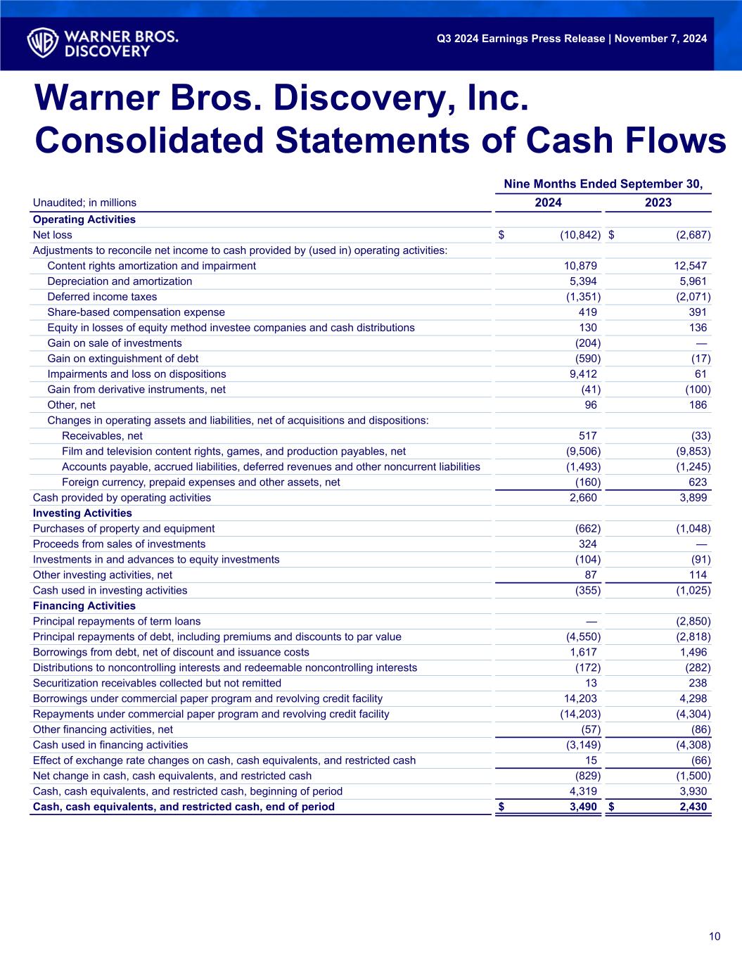 10 Nine Months Ended September 30, Unaudited; in millions 2024 2023 Operating Activities Net loss $ (10,842) $ (2,687) Adjustments to reconcile net income to cash provided by (used in) operating activities: Content rights amortization and impairment 10,879 12,547 Depreciation and amortization 5,394 5,961 Deferred income taxes (1,351) (2,071) Share-based compensation expense 419 391 Equity in losses of equity method investee companies and cash distributions 130 136 Gain on sale of investments (204) — Gain on extinguishment of debt (590) (17) Impairments and loss on dispositions 9,412 61 Gain from derivative instruments, net (41) (100) Other, net 96 186 Changes in operating assets and liabilities, net of acquisitions and dispositions: Receivables, net 517 (33) Film and television content rights, games, and production payables, net (9,506) (9,853) Accounts payable, accrued liabilities, deferred revenues and other noncurrent liabilities (1,493) (1,245) Foreign currency, prepaid expenses and other assets, net (160) 623 Cash provided by operating activities 2,660 3,899 Investing Activities Purchases of property and equipment (662) (1,048) Proceeds from sales of investments 324 — Investments in and advances to equity investments (104) (91) Other investing activities, net 87 114 Cash used in investing activities (355) (1,025) Financing Activities Principal repayments of term loans — (2,850) Principal repayments of debt, including premiums and discounts to par value (4,550) (2,818) Borrowings from debt, net of discount and issuance costs 1,617 1,496 Distributions to noncontrolling interests and redeemable noncontrolling interests (172) (282) Securitization receivables collected but not remitted 13 238 Borrowings under commercial paper program and revolving credit facility 14,203 4,298 Repayments under commercial paper program and revolving credit facility (14,203) (4,304) Other financing activities, net (57) (86) Cash used in financing activities (3,149) (4,308) Effect of exchange rate changes on cash, cash equivalents, and restricted cash 15 (66) Net change in cash, cash equivalents, and restricted cash (829) (1,500) Cash, cash equivalents, and restricted cash, beginning of period 4,319 3,930 Cash, cash equivalents, and restricted cash, end of period $ 3,490 $ 2,430 10 Warner Bros. Discovery, Inc. Consolidated Statements of Cash Flows Q3 2024 Earnings Press Release | November 7, 2024