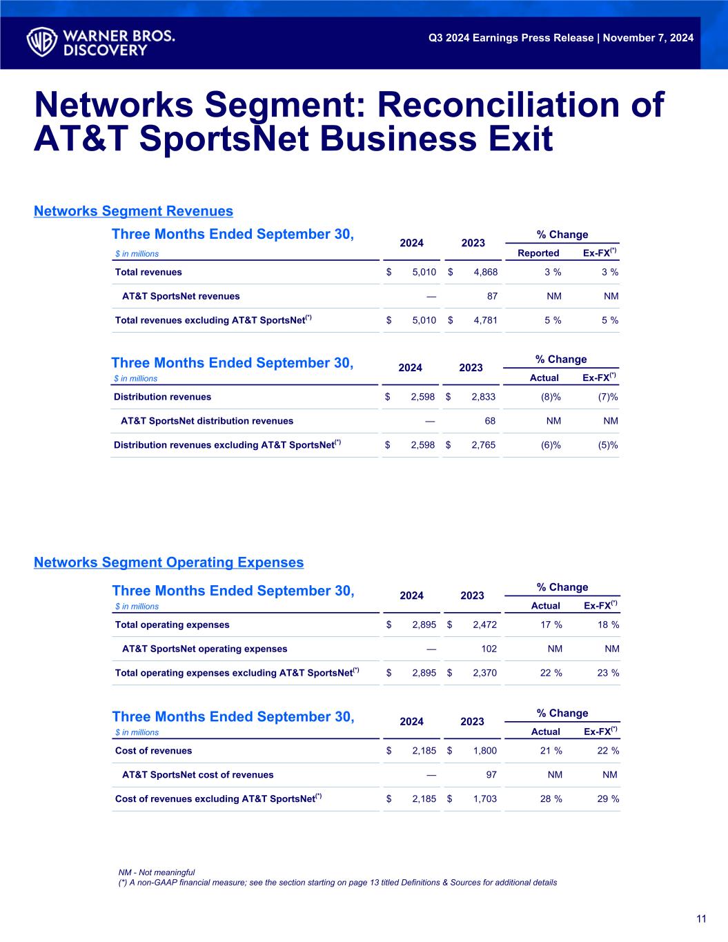 Networks Segment: Reconciliation of AT&T SportsNet Business Exit 11 NM - Not meaningful (*) A non-GAAP financial measure; see the section starting on page 13 titled Definitions & Sources for additional details Networks Segment Revenues 2024 2023 % Change $ in millions Actual Ex-FX(*) Distribution revenues $ 2,598 $ 2,833 (8) % (7) % AT&T SportsNet distribution revenues — 68 NM NM Distribution revenues excluding AT&T SportsNet(*) $ 2,598 $ 2,765 (6) % (5) % Three Months Ended September 30, 2024 2023 % Change $ in millions Actual Ex-FX(*) Cost of revenues $ 2,185 $ 1,800 21 % 22 % AT&T SportsNet cost of revenues — 97 NM NM Cost of revenues excluding AT&T SportsNet(*) $ 2,185 $ 1,703 28 % 29 % Three Months Ended September 30, Networks Segment Operating Expenses 2024 2023 % Change $ in millions Actual Ex-FX(*) Total operating expenses $ 2,895 $ 2,472 17 % 18 % AT&T SportsNet operating expenses — 102 NM NM Total operating expenses excluding AT&T SportsNet(*) $ 2,895 $ 2,370 22 % 23 % Three Months Ended September 30, 2024 2023 % Change $ in millions Reported Ex-FX(*) Total revenues $ 5,010 $ 4,868 3 % 3 % AT&T SportsNet revenues — 87 NM NM Total revenues excluding AT&T SportsNet(*) $ 5,010 $ 4,781 5 % 5 % Three Months Ended September 30, Q3 2024 Earnings Press Release | November 7, 2024