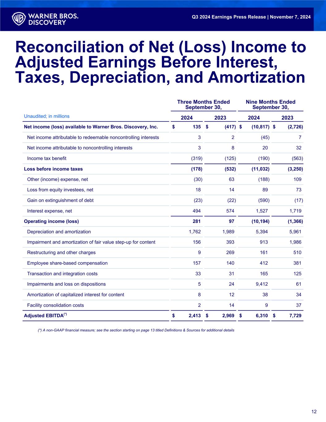 12 Three Months Ended September 30, Nine Months Ended September 30, Unaudited; in millions 2024 2023 2024 2023 Net income (loss) available to Warner Bros. Discovery, Inc. $ 135 $ (417) $ (10,817) $ (2,726) Net income attributable to redeemable noncontrolling interests 3 2 (45) 7 Net income attributable to noncontrolling interests 3 8 20 32 Income tax benefit (319) (125) (190) (563) Loss before income taxes (178) (532) (11,032) (3,250) Other (income) expense, net (30) 63 (188) 109 Loss from equity investees, net 18 14 89 73 Gain on extinguishment of debt (23) (22) (590) (17) Interest expense, net 494 574 1,527 1,719 Operating income (loss) 281 97 (10,194) (1,366) Depreciation and amortization 1,762 1,989 5,394 5,961 Impairment and amortization of fair value step-up for content 156 393 913 1,986 Restructuring and other charges 9 269 161 510 Employee share-based compensation 157 140 412 381 Transaction and integration costs 33 31 165 125 Impairments and loss on dispositions 5 24 9,412 61 Amortization of capitalized interest for content 8 12 38 34 Facility consolidation costs 2 14 9 37 Adjusted EBITDA(*) $ 2,413 $ 2,969 $ 6,310 $ 7,729 Reconciliation of Net (Loss) Income to Adjusted Earnings Before Interest, Taxes, Depreciation, and Amortization (*) A non-GAAP financial measure; see the section starting on page 13 titled Definitions & Sources for additional details Q3 2024 Earnings Press Release | November 7, 2024