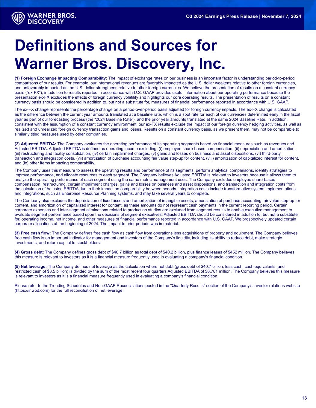 (1) Foreign Exchange Impacting Comparability: The impact of exchange rates on our business is an important factor in understanding period-to-period comparisons of our results. For example, our international revenues are favorably impacted as the U.S. dollar weakens relative to other foreign currencies, and unfavorably impacted as the U.S. dollar strengthens relative to other foreign currencies. We believe the presentation of results on a constant currency basis (“ex-FX”), in addition to results reported in accordance with U.S. GAAP provides useful information about our operating performance because the presentation ex-FX excludes the effects of foreign currency volatility and highlights our core operating results. The presentation of results on a constant currency basis should be considered in addition to, but not a substitute for, measures of financial performance reported in accordance with U.S. GAAP. The ex-FX change represents the percentage change on a period-over-period basis adjusted for foreign currency impacts. The ex-FX change is calculated as the difference between the current year amounts translated at a baseline rate, which is a spot rate for each of our currencies determined early in the fiscal year as part of our forecasting process (the “2024 Baseline Rate”), and the prior year amounts translated at the same 2024 Baseline Rate. In addition, consistent with the assumption of a constant currency environment, our ex-FX results exclude the impact of our foreign currency hedging activities, as well as realized and unrealized foreign currency transaction gains and losses. Results on a constant currency basis, as we present them, may not be comparable to similarly titled measures used by other companies. (2) Adjusted EBITDA: The Company evaluates the operating performance of its operating segments based on financial measures such as revenues and Adjusted EBITDA. Adjusted EBITDA is defined as operating income excluding: (i) employee share-based compensation, (ii) depreciation and amortization, (iii) restructuring and facility consolidation, (iv) certain impairment charges, (v) gains and losses on business and asset dispositions, (vi) third-party transaction and integration costs, (vii) amortization of purchase accounting fair value step-up for content, (viii) amortization of capitalized interest for content, and (ix) other items impacting comparability. The Company uses this measure to assess the operating results and performance of its segments, perform analytical comparisons, identify strategies to improve performance, and allocate resources to each segment. The Company believes Adjusted EBITDA is relevant to investors because it allows them to analyze the operating performance of each segment using the same metric management uses. The Company excludes employee share-based compensation, restructuring, certain impairment charges, gains and losses on business and asset dispositions, and transaction and integration costs from the calculation of Adjusted EBITDA due to their impact on comparability between periods. Integration costs include transformative system implementations and integrations, such as Enterprise Resource Planning systems, and may take several years to complete. The Company also excludes the depreciation of fixed assets and amortization of intangible assets, amortization of purchase accounting fair value step-up for content, and amortization of capitalized interest for content, as these amounts do not represent cash payments in the current reporting period. Certain corporate expenses and inter-segment eliminations related to production studios are excluded from segment results to enable executive management to evaluate segment performance based upon the decisions of segment executives. Adjusted EBITDA should be considered in addition to, but not a substitute for, operating income, net income, and other measures of financial performance reported in accordance with U.S. GAAP. We prospectively updated certain corporate allocations at the beginning of 2024. The impact to prior periods was immaterial. (3) Free cash flow: The Company defines free cash flow as cash flow from operations less acquisitions of property and equipment. The Company believes free cash flow is an important indicator for management and investors of the Company’s liquidity, including its ability to reduce debt, make strategic investments, and return capital to stockholders. (4) Gross debt: The Company defines gross debt of $40.7 billion as total debt of $40.2 billion, plus finance leases of $452 million. The Company believes this measure is relevant to investors as it is a financial measure frequently used in evaluating a company's financial condition. (5) Net leverage: The Company defines net leverage as the calculation where net debt (gross debt of $40.7 billion, less cash, cash equivalents, and restricted cash of $3.5 billion) is divided by the sum of the most recent four quarters Adjusted EBITDA of $8,781 million. The Company believes this measure is relevant to investors as it is a financial measure frequently used in evaluating a company's financial condition. Please refer to the Trending Schedules and Non-GAAP Reconciliations posted in the "Quarterly Results" section of the Company's investor relations website (https://ir.wbd.com) for the full reconciliation of net leverage. 13 Definitions and Sources for Warner Bros. Discovery, Inc. Q3 2024 Earnings Press Release | November 7, 2024
