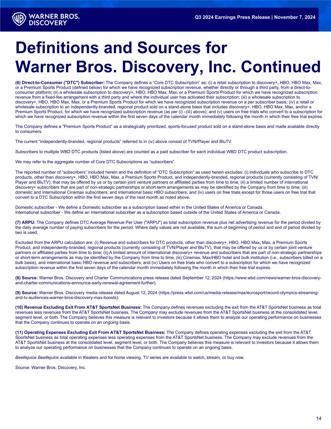 (6) Direct-to-Consumer ("DTC") Subscriber: The Company defines a “Core DTC Subscription” as: (i) a retail subscription to discovery+, HBO, HBO Max, Max, or a Premium Sports Product (defined below) for which we have recognized subscription revenue, whether directly or through a third party, from a direct-to- consumer platform; (ii) a wholesale subscription to discovery+, HBO, HBO Max, Max, or a Premium Sports Product for which we have recognized subscription revenue from a fixed-fee arrangement with a third party and where the individual user has activated their subscription; (iii) a wholesale subscription to discovery+, HBO, HBO Max, Max, or a Premium Sports Product for which we have recognized subscription revenue on a per subscriber basis; (iv) a retail or wholesale subscription to an independently-branded, regional product sold on a stand-alone basis that includes discovery+, HBO, HBO Max, Max, and/or a Premium Sports Product, for which we have recognized subscription revenue (as per (i) –(iii) above); and (v) users on free trials who convert to a subscription for which we have recognized subscription revenue within the first seven days of the calendar month immediately following the month in which their free trial expires. The Company defines a “Premium Sports Product” as a strategically prioritized, sports-focused product sold on a stand-alone basis and made available directly to consumers. The current “independently-branded, regional products” referred to in (iv) above consist of TVN/Player and BluTV. Subscribers to multiple WBD DTC products (listed above) are counted as a paid subscriber for each individual WBD DTC product subscription. We may refer to the aggregate number of Core DTC Subscriptions as “subscribers”. The reported number of “subscribers” included herein and the definition of “DTC Subscription” as used herein excludes: (i) individuals who subscribe to DTC products, other than discovery+, HBO, HBO Max, Max, a Premium Sports Product, and independently-branded, regional products (currently consisting of TVN/ Player and BluTV), that may be offered by us or by certain joint venture partners or affiliated parties from time to time; (ii) a limited number of international discovery+ subscribers that are part of non-strategic partnerships or short-term arrangements as may be identified by the Company from time to time; (iii) domestic and international Cinemax subscribers, and international basic HBO subscribers; and (iv) users on free trials except for those users on free trial that convert to a DTC Subscription within the first seven days of the next month as noted above. Domestic subscriber - We define a Domestic subscriber as a subscription based either in the United States of America or Canada. International subscriber - We define an International subscriber as a subscription based outside of the United States of America or Canada. (7) ARPU: The Company defines DTC Average Revenue Per User ("ARPU") as total subscription revenue plus net advertising revenue for the period divided by the daily average number of paying subscribers for the period. Where daily values are not available, the sum of beginning of period and end of period divided by two is used. Excluded from the ARPU calculation are: (i) Revenue and subscribers for DTC products, other than discovery+, HBO, HBO Max, Max, a Premium Sports Product, and independently-branded, regional products (currently consisting of TVN/Player and BluTV), that may be offered by us or by certain joint venture partners or affiliated parties from time to time; (ii) A limited amount of international discovery+ revenue and subscribers that are part of non-strategic partnerships or short-term arrangements as may be identified by the Company from time to time; (iii) Cinemax, Max/HBO hotel and bulk institution (i.e., subscribers billed on a bulk basis), and international basic HBO revenue and subscribers; and (iv) Users on free trials who convert to a subscription for which we have recognized subscription revenue within the first seven days of the calendar month immediately following the month in which their free trial expires. (8) Source: Warner Bros. Discovery and Charter Communications press release dated September 12, 2024 (https://www.wbd.com/news/warner-bros-discovery- and-charter-communications-announce-early-renewal-agreement-further). (9) Source: Warner Bros. Discovery media release dated August 12, 2024 (https://press.wbd.com/us/media-release/max/eurosport/record-olympics-streaming- and-tv-audiences-warner-bros-discovery-max-boosts). (10) Revenue Excluding Exit From AT&T SportsNet Business: The Company defines revenues excluding the exit from the AT&T SportsNet business as total revenues less revenues from the AT&T SportsNet business. The Company may exclude revenues from the AT&T SportsNet business at the consolidated level, segment level, or both. The Company believes this measure is relevant to investors because it allows them to analyze our operating performance on businesses that the Company continues to operate on an ongoing basis. (11) Operating Expenses Excluding Exit From AT&T SportsNet Business: The Company defines operating expenses excluding the exit from the AT&T SportsNet business as total operating expenses less operating expenses from the AT&T SportsNet business. The Company may exclude revenues from the AT&T SportsNet business at the consolidated level, segment level, or both. The Company believes this measure is relevant to investors because it allows them to analyze our operating performance on businesses that the Company continues to operate on an ongoing basis. Beetlejuice Beetlejuice available in theaters and for home viewing. TV series are available to watch, stream, or buy now. Source: Warner Bros. Discovery, Inc. 14 Definitions and Sources for Warner Bros. Discovery, Inc. Continued Q3 2024 Earnings Press Release | November 7, 2024