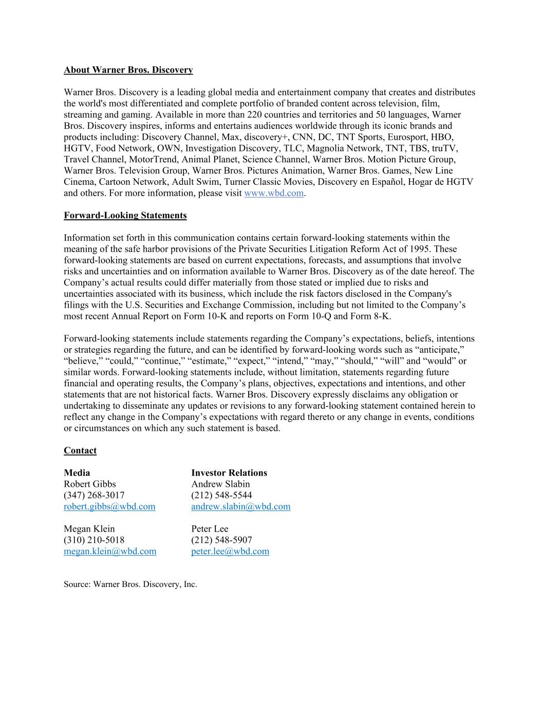 About Warner Bros. Discovery Warner Bros. Discovery is a leading global media and entertainment company that creates and distributes the world's most differentiated and complete portfolio of branded content across television, film, streaming and gaming. Available in more than 220 countries and territories and 50 languages, Warner Bros. Discovery inspires, informs and entertains audiences worldwide through its iconic brands and products including: Discovery Channel, Max, discovery+, CNN, DC, TNT Sports, Eurosport, HBO, HGTV, Food Network, OWN, Investigation Discovery, TLC, Magnolia Network, TNT, TBS, truTV, Travel Channel, MotorTrend, Animal Planet, Science Channel, Warner Bros. Motion Picture Group, Warner Bros. Television Group, Warner Bros. Pictures Animation, Warner Bros. Games, New Line Cinema, Cartoon Network, Adult Swim, Turner Classic Movies, Discovery en Español, Hogar de HGTV and others. For more information, please visit www.wbd.com. Forward-Looking Statements Information set forth in this communication contains certain forward-looking statements within the meaning of the safe harbor provisions of the Private Securities Litigation Reform Act of 1995. These forward-looking statements are based on current expectations, forecasts, and assumptions that involve risks and uncertainties and on information available to Warner Bros. Discovery as of the date hereof. The Company’s actual results could differ materially from those stated or implied due to risks and uncertainties associated with its business, which include the risk factors disclosed in the Company's filings with the U.S. Securities and Exchange Commission, including but not limited to the Company’s most recent Annual Report on Form 10-K and reports on Form 10-Q and Form 8-K. Forward-looking statements include statements regarding the Company’s expectations, beliefs, intentions or strategies regarding the future, and can be identified by forward-looking words such as “anticipate,” “believe,” “could,” “continue,” “estimate,” “expect,” “intend,” “may,” “should,” “will” and “would” or similar words. Forward-looking statements include, without limitation, statements regarding future financial and operating results, the Company’s plans, objectives, expectations and intentions, and other statements that are not historical facts. Warner Bros. Discovery expressly disclaims any obligation or undertaking to disseminate any updates or revisions to any forward-looking statement contained herein to reflect any change in the Company’s expectations with regard thereto or any change in events, conditions or circumstances on which any such statement is based. Contact Media Investor Relations Robert Gibbs Andrew Slabin (347) 268-3017 (212) 548-5544 robert.gibbs@wbd.com andrew.slabin@wbd.com Megan Klein Peter Lee (310) 210-5018 (212) 548-5907 megan.klein@wbd.com peter.lee@wbd.com Source: Warner Bros. Discovery, Inc.