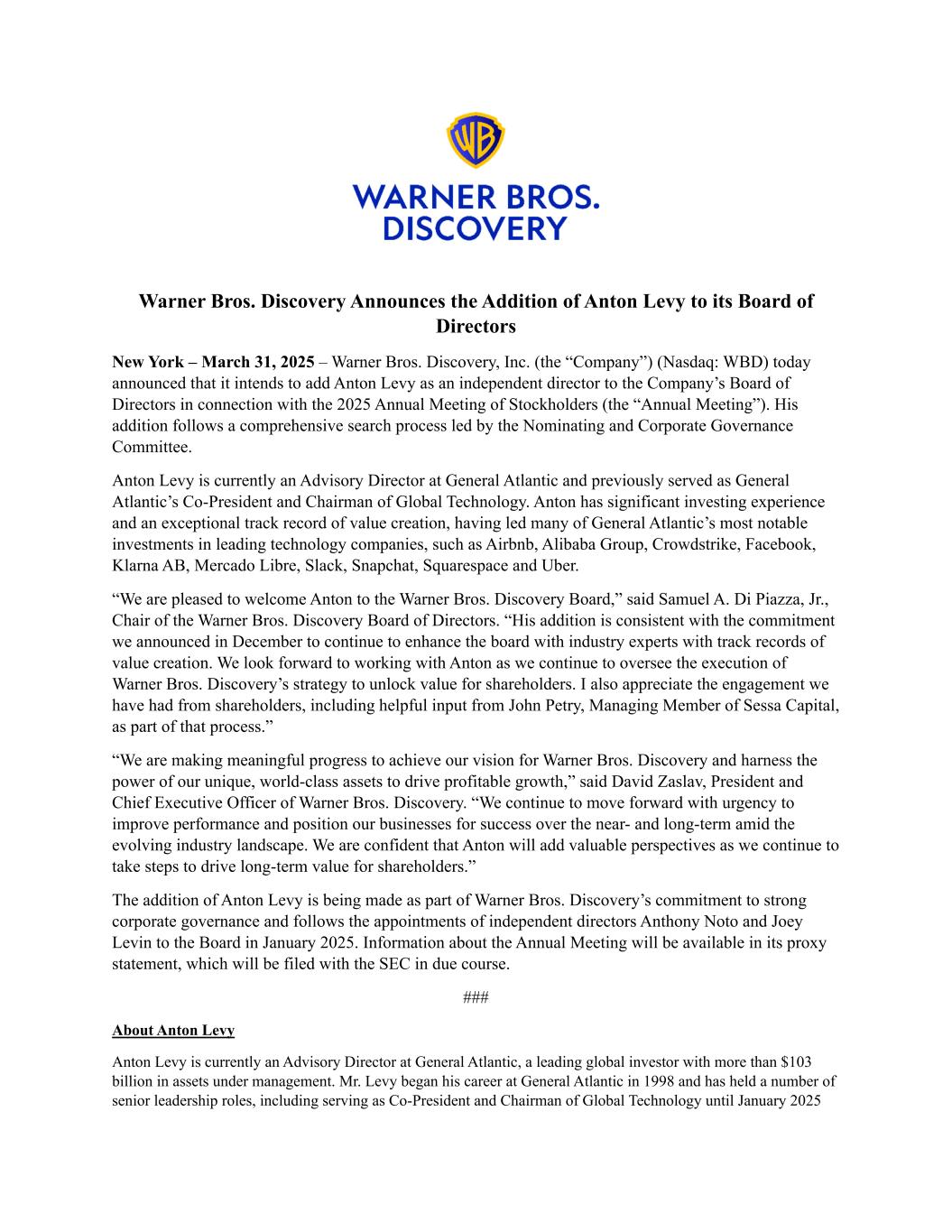 Warner Bros. Discovery Announces the Addition of Anton Levy to its Board of Directors New York – March 31, 2025 – Warner Bros. Discovery, Inc. (the “Company”) (Nasdaq: WBD) today announced that it intends to add Anton Levy as an independent director to the Company’s Board of Directors in connection with the 2025 Annual Meeting of Stockholders (the “Annual Meeting”). His addition follows a comprehensive search process led by the Nominating and Corporate Governance Committee. Anton Levy is currently an Advisory Director at General Atlantic and previously served as General Atlantic’s Co-President and Chairman of Global Technology. Anton has significant investing experience and an exceptional track record of value creation, having led many of General Atlantic’s most notable investments in leading technology companies, such as Airbnb, Alibaba Group, Crowdstrike, Facebook, Klarna AB, Mercado Libre, Slack, Snapchat, Squarespace and Uber. “We are pleased to welcome Anton to the Warner Bros. Discovery Board,” said Samuel A. Di Piazza, Jr., Chair of the Warner Bros. Discovery Board of Directors. “His addition is consistent with the commitment we announced in December to continue to enhance the board with industry experts with track records of value creation. We look forward to working with Anton as we continue to oversee the execution of Warner Bros. Discovery’s strategy to unlock value for shareholders. I also appreciate the engagement we have had from shareholders, including helpful input from John Petry, Managing Member of Sessa Capital, as part of that process.” “We are making meaningful progress to achieve our vision for Warner Bros. Discovery and harness the power of our unique, world-class assets to drive profitable growth,” said David Zaslav, President and Chief Executive Officer of Warner Bros. Discovery. “We continue to move forward with urgency to improve performance and position our businesses for success over the near- and long-term amid the evolving industry landscape. We are confident that Anton will add valuable perspectives as we continue to take steps to drive long-term value for shareholders.” The addition of Anton Levy is being made as part of Warner Bros. Discovery’s commitment to strong corporate governance and follows the appointments of independent directors Anthony Noto and Joey Levin to the Board in January 2025. Information about the Annual Meeting will be available in its proxy statement, which will be filed with the SEC in due course. ### About Anton Levy Anton Levy is currently an Advisory Director at General Atlantic, a leading global investor with more than $103 billion in assets under management. Mr. Levy began his career at General Atlantic in 1998 and has held a number of senior leadership roles, including serving as Co-President and Chairman of Global Technology until January 2025