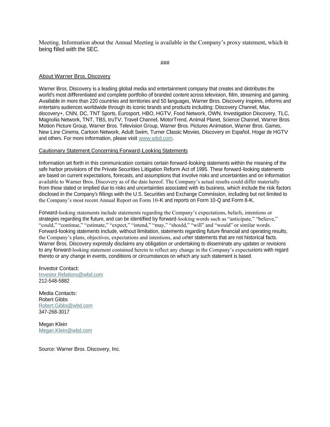Meeting. Information about the Annual Meeting is available in the Company’s proxy statement, which is being filed with the SEC. ### About Warner Bros. Discovery Warner Bros. Discovery is a leading global media and entertainment company that creates and distributes the world's most differentiated and complete portfolio of branded content across television, film, streaming and gaming. Available in more than 220 countries and territories and 50 languages, Warner Bros. Discovery inspires, informs and entertains audiences worldwide through its iconic brands and products including: Discovery Channel, Max, discovery+, CNN, DC, TNT Sports, Eurosport, HBO, HGTV, Food Network, OWN, Investigation Discovery, TLC, Magnolia Network, TNT, TBS, truTV, Travel Channel, MotorTrend, Animal Planet, Science Channel, Warner Bros. Motion Picture Group, Warner Bros. Television Group, Warner Bros. Pictures Animation, Warner Bros. Games, New Line Cinema, Cartoon Network, Adult Swim, Turner Classic Movies, Discovery en Español, Hogar de HGTV and others. For more information, please visit www.wbd.com. Cautionary Statement Concerning Forward-Looking Statements Information set forth in this communication contains certain forward-looking statements within the meaning of the safe harbor provisions of the Private Securities Litigation Reform Act of 1995. These forward-looking statements are based on current expectations, forecasts, and assumptions that involve risks and uncertainties and on information available to Warner Bros. Discovery as of the date hereof. The Company’s actual results could differ materially from those stated or implied due to risks and uncertainties associated with its business, which include the risk factors disclosed in the Company's filings with the U.S. Securities and Exchange Commission, including but not limited to the Company’s most recent Annual Report on Form 10-K and reports on Form 10-Q and Form 8-K. Forward-looking statements include statements regarding the Company’s expectations, beliefs, intentions or strategies regarding the future, and can be identified by forward-looking words such as “anticipate,” “believe,” “could,” “continue,” “estimate,” “expect,” “intend,” “may,” “should,” “will” and “would” or similar words. Forward-looking statements include, without limitation, statements regarding future financial and operating results, the Company’s plans, objectives, expectations and intentions, and other statements that are not historical facts. Warner Bros. Discovery expressly disclaims any obligation or undertaking to disseminate any updates or revisions to any forward-looking statement contained herein to reflect any change in the Company’s expectations with regard thereto or any change in events, conditions or circumstances on which any such statement is based. Investor Contact: Investor.Relations@wbd.com 212-548-5882 Media Contacts: Robert Gibbs Robert.Gibbs@wbd.com 347-268-3017 Megan Klein Megan.Klein@wbd.com Source: Warner Bros. Discovery, Inc.