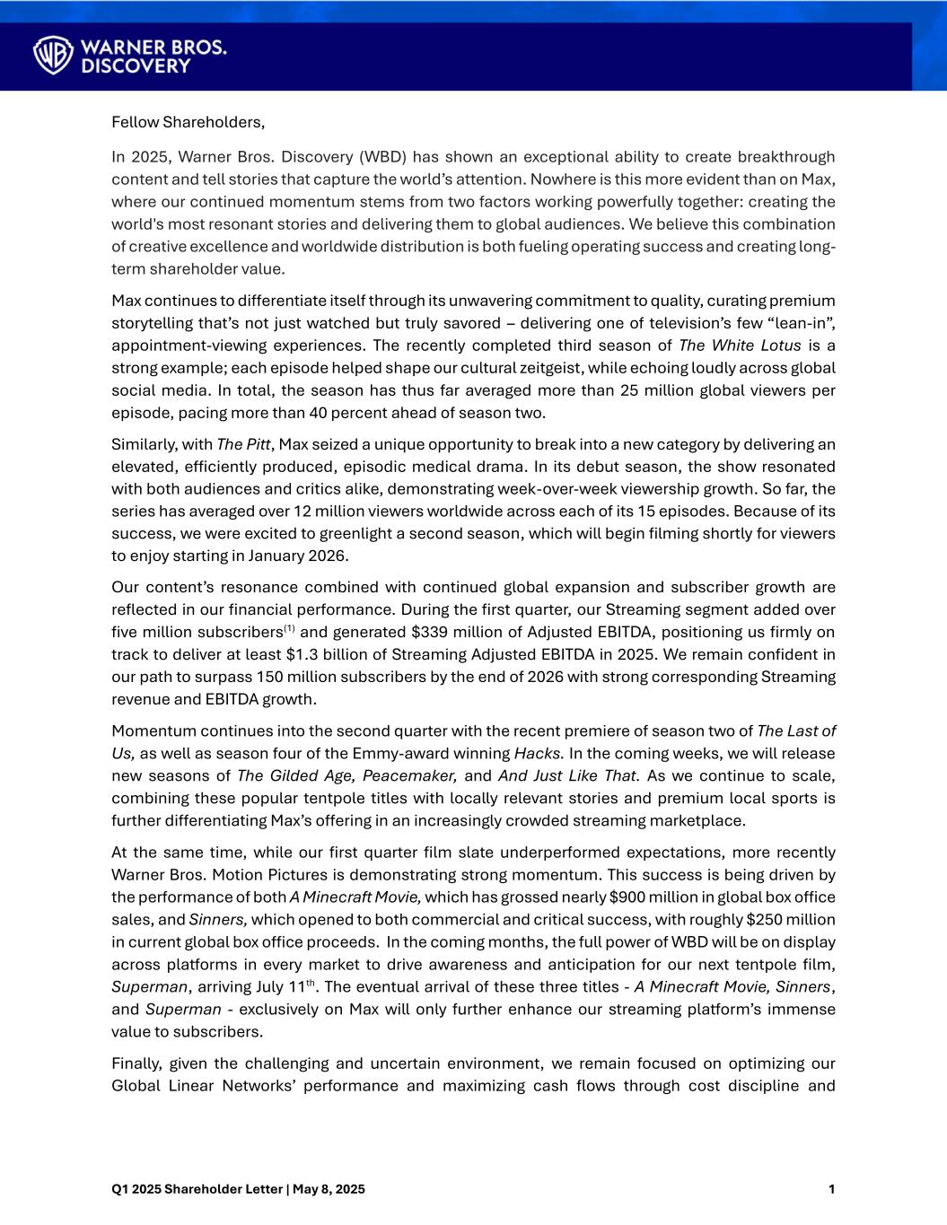 Q1 2025 Shareholder Letter | May 8, 2025 1 Fellow Shareholders, In 2025, Warner Bros. Discovery (WBD) has shown an exceptional ability to create breakthrough content and tell stories that capture the world’s attention. Nowhere is this more evident than on Max, where our continued momentum stems from two factors working powerfully together: creating the world's most resonant stories and delivering them to global audiences. We believe this combination of creative excellence and worldwide distribution is both fueling operating success and creating long- term shareholder value. Max continues to differentiate itself through its unwavering commitment to quality, curating premium storytelling that’s not just watched but truly savored – delivering one of television’s few “lean-in”, appointment-viewing experiences. The recently completed third season of The White Lotus is a strong example; each episode helped shape our cultural zeitgeist, while echoing loudly across global social media. In total, the season has thus far averaged more than 25 million global viewers per episode, pacing more than 40 percent ahead of season two. Similarly, with The Pitt, Max seized a unique opportunity to break into a new category by delivering an elevated, efficiently produced, episodic medical drama. In its debut season, the show resonated with both audiences and critics alike, demonstrating week-over-week viewership growth. So far, the series has averaged over 12 million viewers worldwide across each of its 15 episodes. Because of its success, we were excited to greenlight a second season, which will begin filming shortly for viewers to enjoy starting in January 2026. Our content’s resonance combined with continued global expansion and subscriber growth are reflected in our financial performance. During the first quarter, our Streaming segment added over five million subscribers(1) and generated $339 million of Adjusted EBITDA, positioning us firmly on track to deliver at least $1.3 billion of Streaming Adjusted EBITDA in 2025. We remain confident in our path to surpass 150 million subscribers by the end of 2026 with strong corresponding Streaming revenue and EBITDA growth. Momentum continues into the second quarter with the recent premiere of season two of The Last of Us, as well as season four of the Emmy-award winning Hacks. In the coming weeks, we will release new seasons of The Gilded Age, Peacemaker, and And Just Like That. As we continue to scale, combining these popular tentpole titles with locally relevant stories and premium local sports is further differentiating Max’s offering in an increasingly crowded streaming marketplace. At the same time, while our first quarter film slate underperformed expectations, more recently Warner Bros. Motion Pictures is demonstrating strong momentum. This success is being driven by the performance of both A Minecraft Movie, which has grossed nearly $900 million in global box office sales, and Sinners, which opened to both commercial and critical success, with roughly $250 million in current global box office proceeds. In the coming months, the full power of WBD will be on display across platforms in every market to drive awareness and anticipation for our next tentpole film, Superman, arriving July 11th. The eventual arrival of these three titles - A Minecraft Movie, Sinners, and Superman - exclusively on Max will only further enhance our streaming platform’s immense value to subscribers. Finally, given the challenging and uncertain environment, we remain focused on optimizing our Global Linear Networks’ performance and maximizing cash flows through cost discipline and