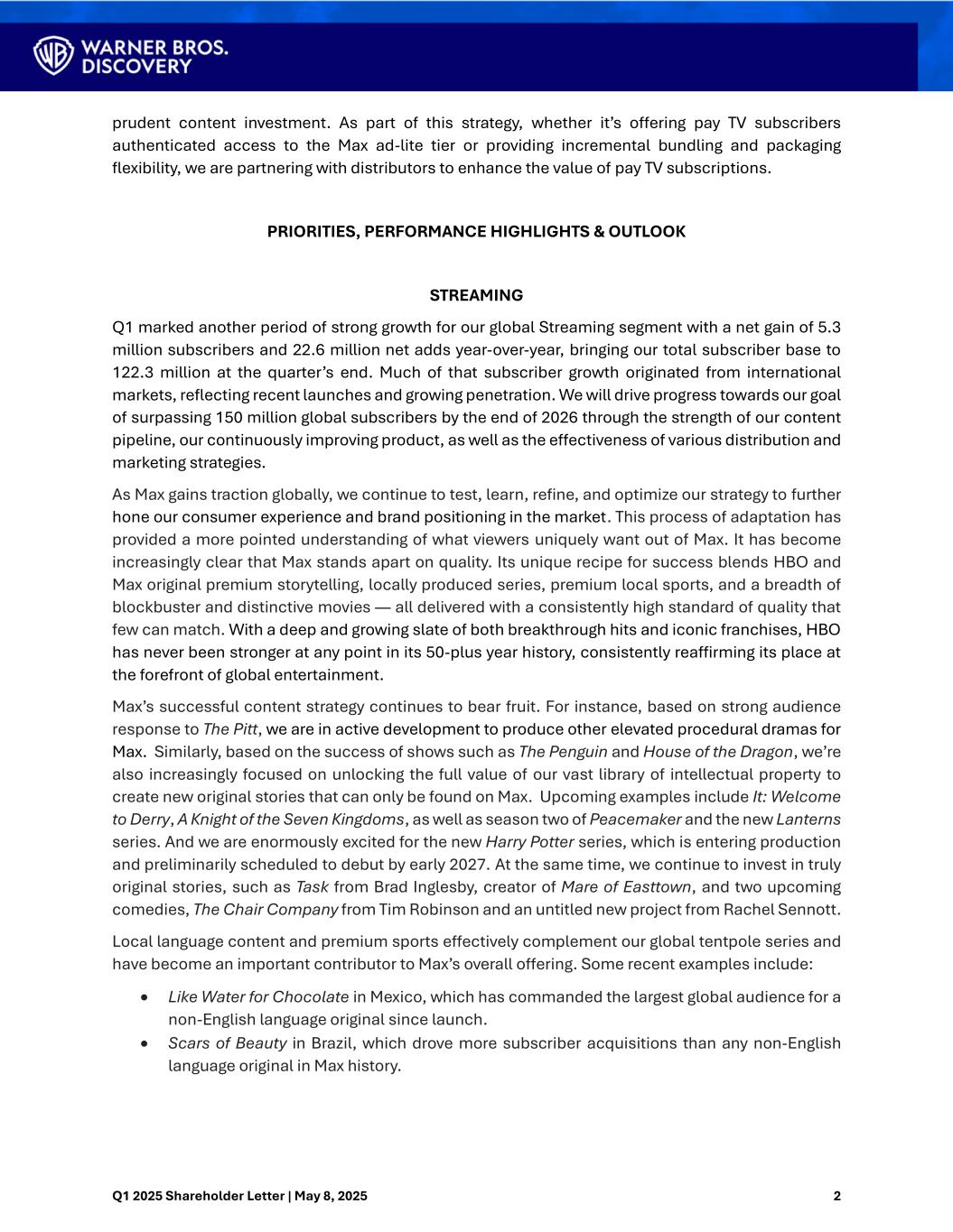 Q1 2025 Shareholder Letter | May 8, 2025 2 prudent content investment. As part of this strategy, whether it’s offering pay TV subscribers authenticated access to the Max ad-lite tier or providing incremental bundling and packaging flexibility, we are partnering with distributors to enhance the value of pay TV subscriptions. PRIORITIES, PERFORMANCE HIGHLIGHTS & OUTLOOK STREAMING Q1 marked another period of strong growth for our global Streaming segment with a net gain of 5.3 million subscribers and 22.6 million net adds year-over-year, bringing our total subscriber base to 122.3 million at the quarter’s end. Much of that subscriber growth originated from international markets, reflecting recent launches and growing penetration. We will drive progress towards our goal of surpassing 150 million global subscribers by the end of 2026 through the strength of our content pipeline, our continuously improving product, as well as the effectiveness of various distribution and marketing strategies. As Max gains traction globally, we continue to test, learn, refine, and optimize our strategy to further hone our consumer experience and brand positioning in the market. This process of adaptation has provided a more pointed understanding of what viewers uniquely want out of Max. It has become increasingly clear that Max stands apart on quality. Its unique recipe for success blends HBO and Max original premium storytelling, locally produced series, premium local sports, and a breadth of blockbuster and distinctive movies — all delivered with a consistently high standard of quality that few can match. With a deep and growing slate of both breakthrough hits and iconic franchises, HBO has never been stronger at any point in its 50-plus year history, consistently reaffirming its place at the forefront of global entertainment. Max’s successful content strategy continues to bear fruit. For instance, based on strong audience response to The Pitt, we are in active development to produce other elevated procedural dramas for Max. Similarly, based on the success of shows such as The Penguin and House of the Dragon, we’re also increasingly focused on unlocking the full value of our vast library of intellectual property to create new original stories that can only be found on Max. Upcoming examples include It: Welcome to Derry, A Knight of the Seven Kingdoms, as well as season two of Peacemaker and the new Lanterns series. And we are enormously excited for the new Harry Potter series, which is entering production and preliminarily scheduled to debut by early 2027. At the same time, we continue to invest in truly original stories, such as Task from Brad Inglesby, creator of Mare of Easttown, and two upcoming comedies, The Chair Company from Tim Robinson and an untitled new project from Rachel Sennott. Local language content and premium sports effectively complement our global tentpole series and have become an important contributor to Max’s overall offering. Some recent examples include: • Like Water for Chocolate in Mexico, which has commanded the largest global audience for a non-English language original since launch. • Scars of Beauty in Brazil, which drove more subscriber acquisitions than any non-English language original in Max history.