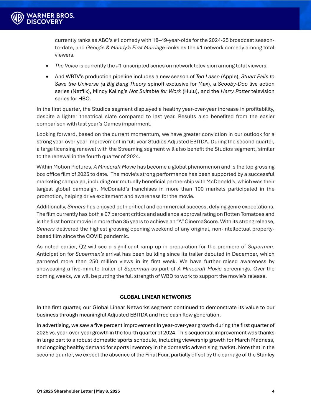 Q1 2025 Shareholder Letter | May 8, 2025 4 currently ranks as ABC’s #1 comedy with 18–49-year-olds for the 2024-25 broadcast season- to-date, and Georgie & Mandy’s First Marriage ranks as the #1 network comedy among total viewers. • The Voice is currently the #1 unscripted series on network television among total viewers. • And WBTV’s production pipeline includes a new season of Ted Lasso (Apple), Stuart Fails to Save the Universe (a Big Bang Theory spinoff exclusive for Max), a Scooby-Doo live action series (Netflix), Mindy Kaling’s Not Suitable for Work (Hulu), and the Harry Potter television series for HBO. In the first quarter, the Studios segment displayed a healthy year-over-year increase in profitability, despite a lighter theatrical slate compared to last year. Results also benefited from the easier comparison with last year’s Games impairment. Looking forward, based on the current momentum, we have greater conviction in our outlook for a strong year-over-year improvement in full-year Studios Adjusted EBITDA. During the second quarter, a large licensing renewal with the Streaming segment will also benefit the Studios segment, similar to the renewal in the fourth quarter of 2024. Within Motion Pictures, A Minecraft Movie has become a global phenomenon and is the top grossing box office film of 2025 to date. The movie’s strong performance has been supported by a successful marketing campaign, including our mutually beneficial partnership with McDonald’s, which was their largest global campaign. McDonald’s franchises in more than 100 markets participated in the promotion, helping drive excitement and awareness for the movie. Additionally, Sinners has enjoyed both critical and commercial success, defying genre expectations. The film currently has both a 97 percent critics and audience approval rating on Rotten Tomatoes and is the first horror movie in more than 35 years to achieve an “A” CinemaScore. With its strong release, Sinners delivered the highest grossing opening weekend of any original, non-intellectual property- based film since the COVID pandemic. As noted earlier, Q2 will see a significant ramp up in preparation for the premiere of Superman. Anticipation for Superman’s arrival has been building since its trailer debuted in December, which garnered more than 250 million views in its first week. We have further raised awareness by showcasing a five-minute trailer of Superman as part of A Minecraft Movie screenings. Over the coming weeks, we will be putting the full strength of WBD to work to support the movie’s release. GLOBAL LINEAR NETWORKS In the first quarter, our Global Linear Networks segment continued to demonstrate its value to our business through meaningful Adjusted EBITDA and free cash flow generation. In advertising, we saw a five percent improvement in year-over-year growth during the first quarter of 2025 vs. year-over-year growth in the fourth quarter of 2024. This sequential improvement was thanks in large part to a robust domestic sports schedule, including viewership growth for March Madness, and ongoing healthy demand for sports inventory in the domestic advertising market. Note that in the second quarter, we expect the absence of the Final Four, partially offset by the carriage of the Stanley