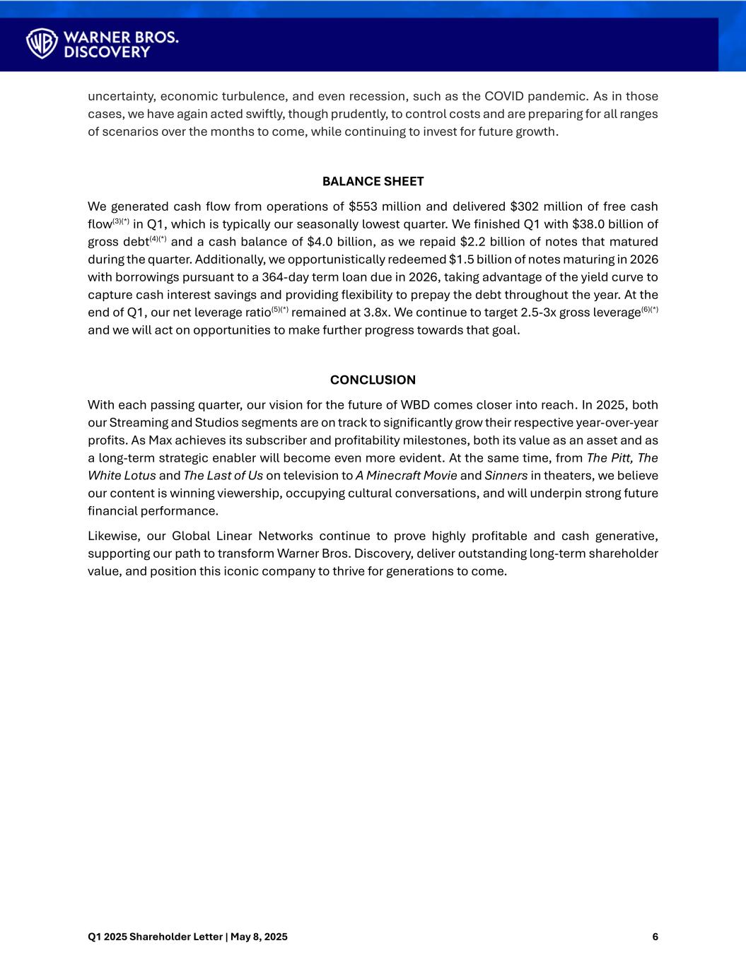 Q1 2025 Shareholder Letter | May 8, 2025 6 uncertainty, economic turbulence, and even recession, such as the COVID pandemic. As in those cases, we have again acted swiftly, though prudently, to control costs and are preparing for all ranges of scenarios over the months to come, while continuing to invest for future growth. BALANCE SHEET We generated cash flow from operations of $553 million and delivered $302 million of free cash flow(3)(*) in Q1, which is typically our seasonally lowest quarter. We finished Q1 with $38.0 billion of gross debt(4)(*) and a cash balance of $4.0 billion, as we repaid $2.2 billion of notes that matured during the quarter. Additionally, we opportunistically redeemed $1.5 billion of notes maturing in 2026 with borrowings pursuant to a 364-day term loan due in 2026, taking advantage of the yield curve to capture cash interest savings and providing flexibility to prepay the debt throughout the year. At the end of Q1, our net leverage ratio(5)(*) remained at 3.8x. We continue to target 2.5-3x gross leverage(6)(*) and we will act on opportunities to make further progress towards that goal. CONCLUSION With each passing quarter, our vision for the future of WBD comes closer into reach. In 2025, both our Streaming and Studios segments are on track to significantly grow their respective year-over-year profits. As Max achieves its subscriber and profitability milestones, both its value as an asset and as a long-term strategic enabler will become even more evident. At the same time, from The Pitt, The White Lotus and The Last of Us on television to A Minecraft Movie and Sinners in theaters, we believe our content is winning viewership, occupying cultural conversations, and will underpin strong future financial performance. Likewise, our Global Linear Networks continue to prove highly profitable and cash generative, supporting our path to transform Warner Bros. Discovery, deliver outstanding long-term shareholder value, and position this iconic company to thrive for generations to come.