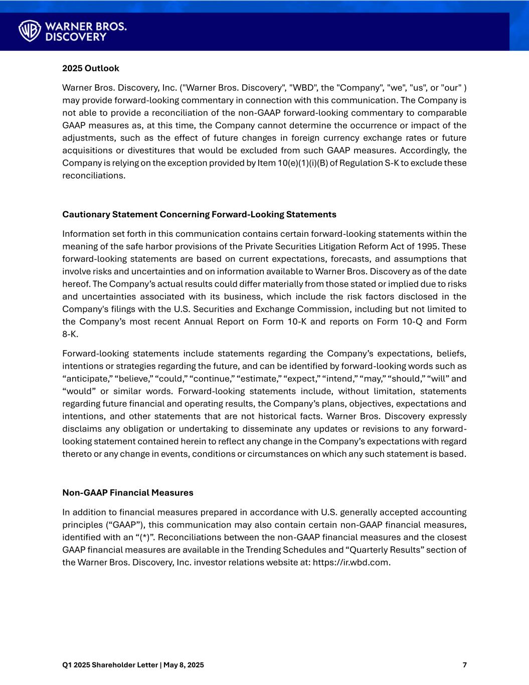 Q1 2025 Shareholder Letter | May 8, 2025 7 2025 Outlook Warner Bros. Discovery, Inc. ("Warner Bros. Discovery", "WBD", the "Company", "we", "us", or "our" ) may provide forward-looking commentary in connection with this communication. The Company is not able to provide a reconciliation of the non-GAAP forward-looking commentary to comparable GAAP measures as, at this time, the Company cannot determine the occurrence or impact of the adjustments, such as the effect of future changes in foreign currency exchange rates or future acquisitions or divestitures that would be excluded from such GAAP measures. Accordingly, the Company is relying on the exception provided by Item 10(e)(1)(i)(B) of Regulation S-K to exclude these reconciliations. Cautionary Statement Concerning Forward-Looking Statements Information set forth in this communication contains certain forward-looking statements within the meaning of the safe harbor provisions of the Private Securities Litigation Reform Act of 1995. These forward-looking statements are based on current expectations, forecasts, and assumptions that involve risks and uncertainties and on information available to Warner Bros. Discovery as of the date hereof. The Company’s actual results could differ materially from those stated or implied due to risks and uncertainties associated with its business, which include the risk factors disclosed in the Company's filings with the U.S. Securities and Exchange Commission, including but not limited to the Company’s most recent Annual Report on Form 10-K and reports on Form 10-Q and Form 8-K. Forward-looking statements include statements regarding the Company’s expectations, beliefs, intentions or strategies regarding the future, and can be identified by forward-looking words such as “anticipate,” “believe,” “could,” “continue,” “estimate,” “expect,” “intend,” “may,” “should,” “will” and “would” or similar words. Forward-looking statements include, without limitation, statements regarding future financial and operating results, the Company’s plans, objectives, expectations and intentions, and other statements that are not historical facts. Warner Bros. Discovery expressly disclaims any obligation or undertaking to disseminate any updates or revisions to any forward- looking statement contained herein to reflect any change in the Company’s expectations with regard thereto or any change in events, conditions or circumstances on which any such statement is based. Non-GAAP Financial Measures In addition to financial measures prepared in accordance with U.S. generally accepted accounting principles (“GAAP”), this communication may also contain certain non-GAAP financial measures, identified with an “(*)”. Reconciliations between the non-GAAP financial measures and the closest GAAP financial measures are available in the Trending Schedules and “Quarterly Results” section of the Warner Bros. Discovery, Inc. investor relations website at: https://ir.wbd.com.