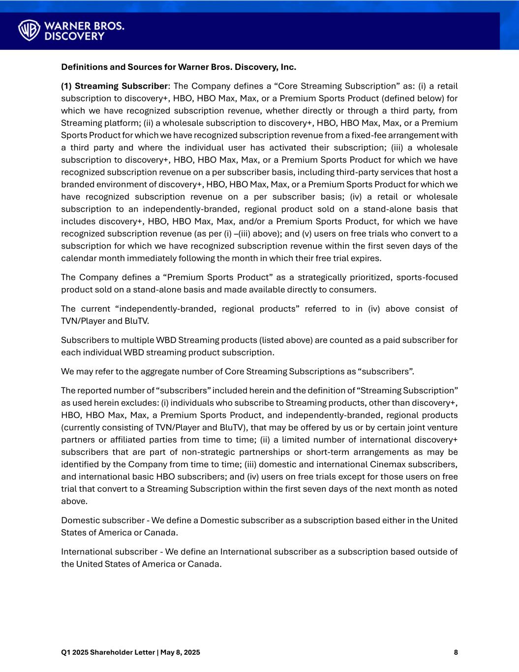 Q1 2025 Shareholder Letter | May 8, 2025 8 Definitions and Sources for Warner Bros. Discovery, Inc. (1) Streaming Subscriber: The Company defines a “Core Streaming Subscription” as: (i) a retail subscription to discovery+, HBO, HBO Max, Max, or a Premium Sports Product (defined below) for which we have recognized subscription revenue, whether directly or through a third party, from Streaming platform; (ii) a wholesale subscription to discovery+, HBO, HBO Max, Max, or a Premium Sports Product for which we have recognized subscription revenue from a fixed-fee arrangement with a third party and where the individual user has activated their subscription; (iii) a wholesale subscription to discovery+, HBO, HBO Max, Max, or a Premium Sports Product for which we have recognized subscription revenue on a per subscriber basis, including third-party services that host a branded environment of discovery+, HBO, HBO Max, Max, or a Premium Sports Product for which we have recognized subscription revenue on a per subscriber basis; (iv) a retail or wholesale subscription to an independently-branded, regional product sold on a stand-alone basis that includes discovery+, HBO, HBO Max, Max, and/or a Premium Sports Product, for which we have recognized subscription revenue (as per (i) –(iii) above); and (v) users on free trials who convert to a subscription for which we have recognized subscription revenue within the first seven days of the calendar month immediately following the month in which their free trial expires. The Company defines a “Premium Sports Product” as a strategically prioritized, sports-focused product sold on a stand-alone basis and made available directly to consumers. The current “independently-branded, regional products” referred to in (iv) above consist of TVN/Player and BluTV. Subscribers to multiple WBD Streaming products (listed above) are counted as a paid subscriber for each individual WBD streaming product subscription. We may refer to the aggregate number of Core Streaming Subscriptions as “subscribers”. The reported number of “subscribers” included herein and the definition of “Streaming Subscription” as used herein excludes: (i) individuals who subscribe to Streaming products, other than discovery+, HBO, HBO Max, Max, a Premium Sports Product, and independently-branded, regional products (currently consisting of TVN/Player and BluTV), that may be offered by us or by certain joint venture partners or affiliated parties from time to time; (ii) a limited number of international discovery+ subscribers that are part of non-strategic partnerships or short-term arrangements as may be identified by the Company from time to time; (iii) domestic and international Cinemax subscribers, and international basic HBO subscribers; and (iv) users on free trials except for those users on free trial that convert to a Streaming Subscription within the first seven days of the next month as noted above. Domestic subscriber - We define a Domestic subscriber as a subscription based either in the United States of America or Canada. International subscriber - We define an International subscriber as a subscription based outside of the United States of America or Canada.