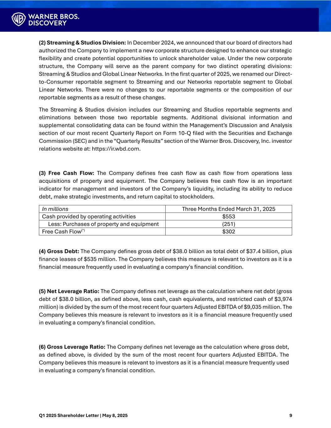 Q1 2025 Shareholder Letter | May 8, 2025 9 (2) Streaming & Studios Division: In December 2024, we announced that our board of directors had authorized the Company to implement a new corporate structure designed to enhance our strategic flexibility and create potential opportunities to unlock shareholder value. Under the new corporate structure, the Company will serve as the parent company for two distinct operating divisions: Streaming & Studios and Global Linear Networks. In the first quarter of 2025, we renamed our Direct- to-Consumer reportable segment to Streaming and our Networks reportable segment to Global Linear Networks. There were no changes to our reportable segments or the composition of our reportable segments as a result of these changes. The Streaming & Studios division includes our Streaming and Studios reportable segments and eliminations between those two reportable segments. Additional divisional information and supplemental consolidating data can be found within the Management’s Discussion and Analysis section of our most recent Quarterly Report on Form 10-Q filed with the Securities and Exchange Commission (SEC) and in the “Quarterly Results” section of the Warner Bros. Discovery, Inc. investor relations website at: https://ir.wbd.com. (3) Free Cash Flow: The Company defines free cash flow as cash flow from operations less acquisitions of property and equipment. The Company believes free cash flow is an important indicator for management and investors of the Company’s liquidity, including its ability to reduce debt, make strategic investments, and return capital to stockholders. In millions Three Months Ended March 31, 2025 Cash provided by operating activities $553 Less: Purchases of property and equipment (251) Free Cash Flow(*) $302 (4) Gross Debt: The Company defines gross debt of $38.0 billion as total debt of $37.4 billion, plus finance leases of $535 million. The Company believes this measure is relevant to investors as it is a financial measure frequently used in evaluating a company's financial condition. (5) Net Leverage Ratio: The Company defines net leverage as the calculation where net debt (gross debt of $38.0 billion, as defined above, less cash, cash equivalents, and restricted cash of $3,974 million) is divided by the sum of the most recent four quarters Adjusted EBITDA of $9,035 million. The Company believes this measure is relevant to investors as it is a financial measure frequently used in evaluating a company's financial condition. (6) Gross Leverage Ratio: The Company defines net leverage as the calculation where gross debt, as defined above, is divided by the sum of the most recent four quarters Adjusted EBITDA. The Company believes this measure is relevant to investors as it is a financial measure frequently used in evaluating a company's financial condition.