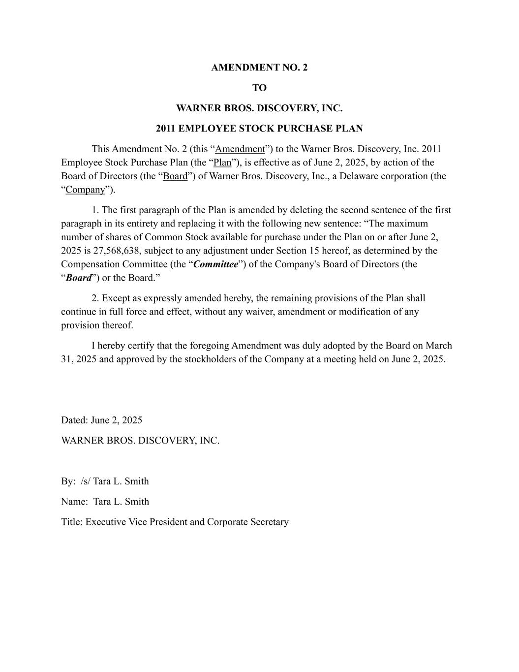 AMENDMENT NO. 2 TO WARNER BROS. DISCOVERY, INC. 2011 EMPLOYEE STOCK PURCHASE PLAN This Amendment No. 2 (this “Amendment”) to the Warner Bros. Discovery, Inc. 2011 Employee Stock Purchase Plan (the “Plan”), is effective as of June 2, 2025, by action of the Board of Directors (the “Board”) of Warner Bros. Discovery, Inc., a Delaware corporation (the “Company”). 1. The first paragraph of the Plan is amended by deleting the second sentence of the first paragraph in its entirety and replacing it with the following new sentence: “The maximum number of shares of Common Stock available for purchase under the Plan on or after June 2, 2025 is 27,568,638, subject to any adjustment under Section 15 hereof, as determined by the Compensation Committee (the “Committee”) of the Company's Board of Directors (the “Board”) or the Board.” 2. Except as expressly amended hereby, the remaining provisions of the Plan shall continue in full force and effect, without any waiver, amendment or modification of any provision thereof. I hereby certify that the foregoing Amendment was duly adopted by the Board on March 31, 2025 and approved by the stockholders of the Company at a meeting held on June 2, 2025. Dated: June 2, 2025 WARNER BROS. DISCOVERY, INC. By: /s/ Tara L. Smith Name: Tara L. Smith Title: Executive Vice President and Corporate Secretary