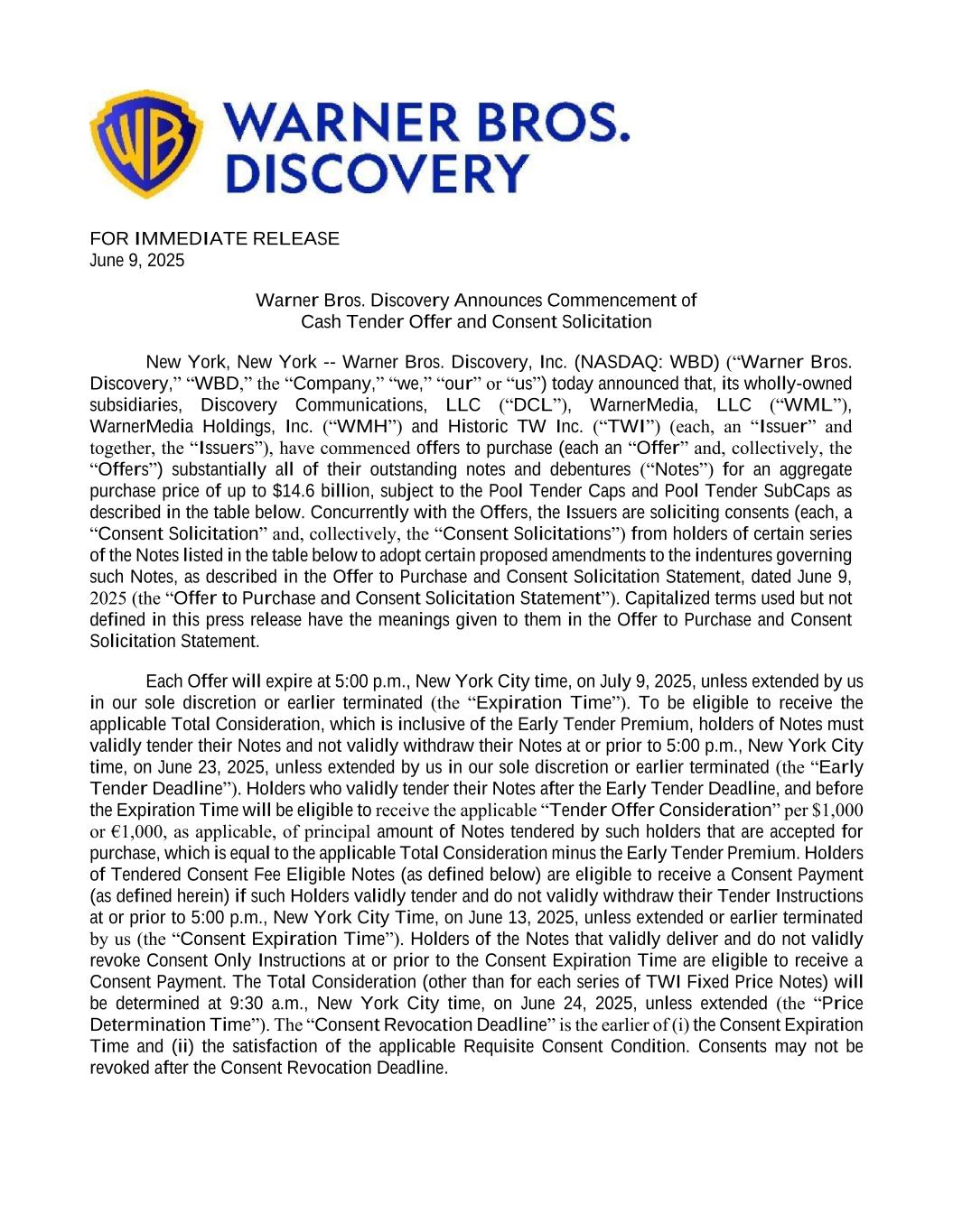 FOR IMMEDIATE RELEASE June 9, 2025 Warner Bros. Discovery Announces Commencement of Cash Tender Offer and Consent Solicitation New York, New York -- Warner Bros. Discovery, Inc. (NASDAQ: WBD) (“Warner Bros. Discovery,” “WBD,” the “Company,” “we,” “our” or “us”) today announced that, its wholly-owned subsidiaries, Discovery Communications, LLC (“DCL”), WarnerMedia, LLC (“WML”), WarnerMedia Holdings, Inc. (“WMH”) and Historic TW Inc. (“TWI”) (each, an “Issuer” and together, the “Issuers”), have commenced offers to purchase (each an “Offer” and, collectively, the “Offers”) substantially all of their outstanding notes and debentures (“Notes”) for an aggregate purchase price of up to $14.6 billion, subject to the Pool Tender Caps and Pool Tender SubCaps as described in the table below. Concurrently with the Offers, the Issuers are soliciting consents (each, a “Consent Solicitation” and, collectively, the “Consent Solicitations”) from holders of certain series of the Notes listed in the table below to adopt certain proposed amendments to the indentures governing such Notes, as described in the Offer to Purchase and Consent Solicitation Statement, dated June 9, 2025 (the “Offer to Purchase and Consent Solicitation Statement”). Capitalized terms used but not defined in this press release have the meanings given to them in the Offer to Purchase and Consent Solicitation Statement. Each Offer will expire at 5:00 p.m., New York City time, on July 9, 2025, unless extended by us in our sole discretion or earlier terminated (the “Expiration Time”). To be eligible to receive the applicable Total Consideration, which is inclusive of the Early Tender Premium, holders of Notes must validly tender their Notes and not validly withdraw their Notes at or prior to 5:00 p.m., New York City time, on June 23, 2025, unless extended by us in our sole discretion or earlier terminated (the “Early Tender Deadline”). Holders who validly tender their Notes after the Early Tender Deadline, and before the Expiration Time will be eligible to receive the applicable “Tender Offer Consideration” per $1,000 or €1,000, as applicable, of principal amount of Notes tendered by such holders that are accepted for purchase, which is equal to the applicable Total Consideration minus the Early Tender Premium. Holders of Tendered Consent Fee Eligible Notes (as defined below) are eligible to receive a Consent Payment (as defined herein) if such Holders validly tender and do not validly withdraw their Tender Instructions at or prior to 5:00 p.m., New York City Time, on June 13, 2025, unless extended or earlier terminated by us (the “Consent Expiration Time”). Holders of the Notes that validly deliver and do not validly revoke Consent Only Instructions at or prior to the Consent Expiration Time are eligible to receive a Consent Payment. The Total Consideration (other than for each series of TWI Fixed Price Notes) will be determined at 9:30 a.m., New York City time, on June 24, 2025, unless extended (the “Price Determination Time”). The “Consent Revocation Deadline” is the earlier of (i) the Consent Expiration Time and (ii) the satisfaction of the applicable Requisite Consent Condition. Consents may not be revoked after the Consent Revocation Deadline.