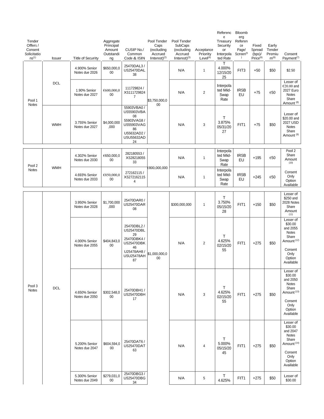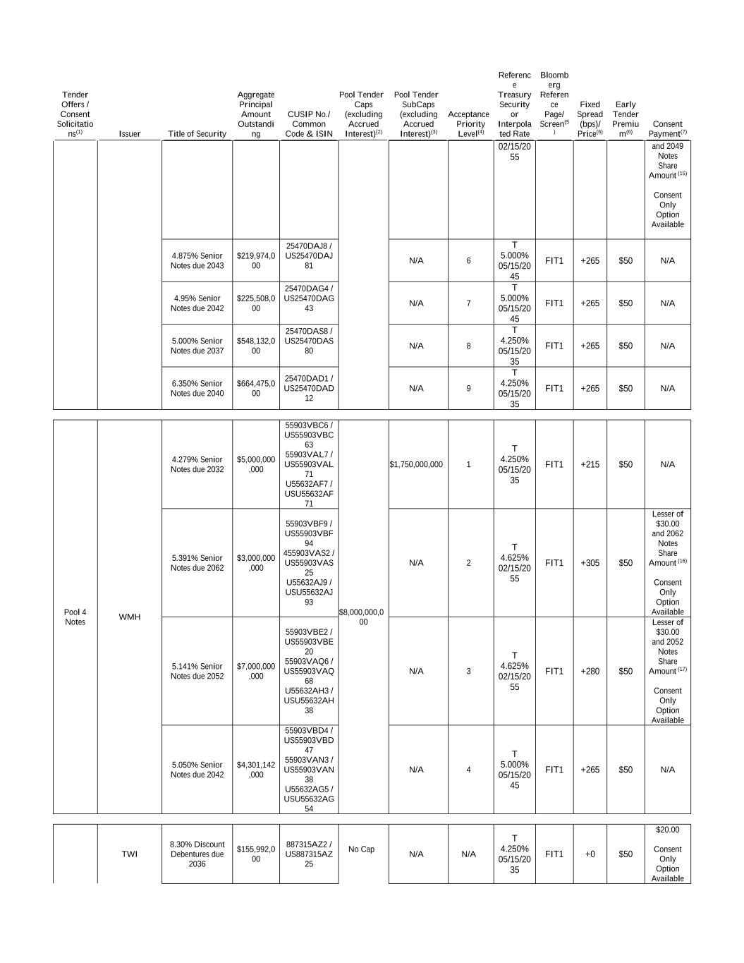Tender Offers / Consent Solicitatio ns(1) Issuer Title of Security Aggregate Principal Amount Outstandi ng CUSIP No./ Common Code & ISIN Pool Tender Caps (excluding Accrued Interest)(2) Pool Tender SubCaps (excluding Accrued Interest)(3) Acceptance Priority Level(4) Referenc e Treasury Security or Interpola ted Rate Bloomb erg Referen ce Page/ Screen(5 ) Fixed Spread (bps)/ Price(6) Early Tender Premiu m(6) Consent Payment(7) 02/15/20 55 and 2049 Notes Share Amount (15) Consent Only Option Available 4.875% Senior Notes due 2043 $219,974,0 00 25470DAJ8 / US25470DAJ 81 N/A 6 T 5.000% 05/15/20 45 FIT1 +265 $50 N/A 4.95% Senior Notes due 2042 $225,508,0 00 25470DAG4 / US25470DAG 43 N/A 7 T 5.000% 05/15/20 45 FIT1 +265 $50 N/A 5.000% Senior Notes due 2037 $548,132,0 00 25470DAS8 / US25470DAS 80 N/A 8 T 4.250% 05/15/20 35 FIT1 +265 $50 N/A 6.350% Senior Notes due 2040 $664,475,0 00 25470DAD1 / US25470DAD 12 N/A 9 T 4.250% 05/15/20 35 FIT1 +265 $50 N/A Pool 4 Notes WMH 4.279% Senior Notes due 2032 $5,000,000 ,000 55903VBC6 / US55903VBC 63 55903VAL7 / US55903VAL 71 U55632AF7 / USU55632AF 71 $8,000,000,0 00 $1,750,000,000 1 T 4.250% 05/15/20 35 FIT1 +215 $50 N/A 5.391% Senior Notes due 2062 $3,000,000 ,000 55903VBF9 / US55903VBF 94 455903VAS2 / US55903VAS 25 U55632AJ9 / USU55632AJ 93 N/A 2 T 4.625% 02/15/20 55 FIT1 +305 $50 Lesser of $30.00 and 2062 Notes Share Amount (16) Consent Only Option Available 5.141% Senior Notes due 2052 $7,000,000 ,000 55903VBE2 / US55903VBE 20 55903VAQ6 / US55903VAQ 68 U55632AH3 / USU55632AH 38 N/A 3 T 4.625% 02/15/20 55 FIT1 +280 $50 Lesser of $30.00 and 2052 Notes Share Amount (17) Consent Only Option Available 5.050% Senior Notes due 2042 $4,301,142 ,000 55903VBD4 / US55903VBD 47 55903VAN3 / US55903VAN 38 U55632AG5 / USU55632AG 54 N/A 4 T 5.000% 05/15/20 45 FIT1 +265 $50 N/A TWI 8.30% Discount Debentures due 2036 $155,992,0 00 887315AZ2 / US887315AZ 25 No Cap N/A N/A T 4.250% 05/15/20 35 FIT1 +0 $50 $20.00 Consent Only Option Available
