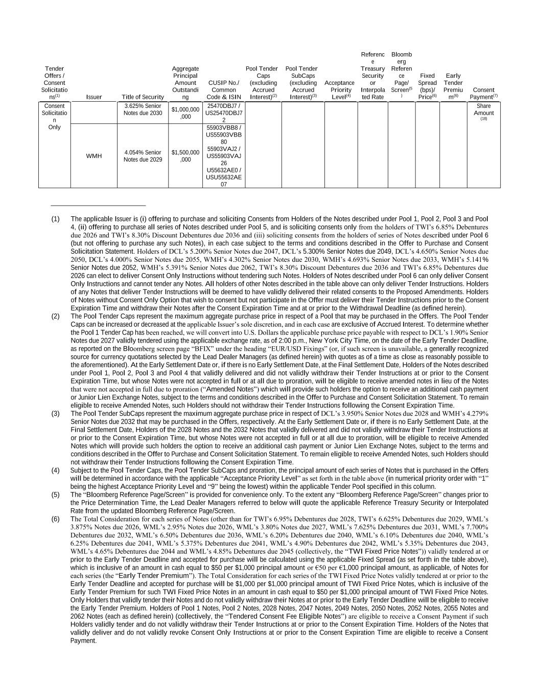 Tender Offers / Consent Solicitatio ns(1) Issuer Title of Security Aggregate Principal Amount Outstandi ng CUSIP No./ Common Code & ISIN Pool Tender Caps (excluding Accrued Interest)(2) Pool Tender SubCaps (excluding Accrued Interest)(3) Acceptance Priority Level(4) Referenc e Treasury Security or Interpola ted Rate Bloomb erg Referen ce Page/ Screen(5 ) Fixed Spread (bps)/ Price(6) Early Tender Premiu m(6) Consent Payment(7) Consent Solicitatio n Only 3.625% Senior Notes due 2030 $1,000,000 ,000 25470DBJ7 / US25470DBJ7 2 Share Amount (18) WMH 4.054% Senior Notes due 2029 $1,500,000 ,000 55903VBB8 / US55903VBB 80 55903VAJ2 / US55903VAJ 26 U55632AE0 / USU55632AE 07 (1) The applicable Issuer is (i) offering to purchase and soliciting Consents from Holders of the Notes described under Pool 1, Pool 2, Pool 3 and Pool 4, (ii) offering to purchase all series of Notes described under Pool 5, and is soliciting consents only from the holders of TWI’s 6.85% Debentures due 2026 and TWI’s 8.30% Discount Debentures due 2036 and (iii) soliciting consents from the holders of series of Notes described under Pool 6 (but not offering to purchase any such Notes), in each case subject to the terms and conditions described in the Offer to Purchase and Consent Solicitation Statement. Holders of DCL’s 5.200% Senior Notes due 2047, DCL’s 5.300% Senior Notes due 2049, DCL’s 4.650% Senior Notes due 2050, DCL’s 4.000% Senior Notes due 2055, WMH’s 4.302% Senior Notes due 2030, WMH’s 4.693% Senior Notes due 2033, WMH’s 5.141% Senior Notes due 2052, WMH’s 5.391% Senior Notes due 2062, TWI’s 8.30% Discount Debentures due 2036 and TWI’s 6.85% Debentures due 2026 can elect to deliver Consent Only Instructions without tendering such Notes. Holders of Notes described under Pool 6 can only deliver Consent Only Instructions and cannot tender any Notes. All holders of other Notes described in the table above can only deliver Tender Instructions. Holders of any Notes that deliver Tender Instructions will be deemed to have validly delivered their related consents to the Proposed Amendments. Holders of Notes without Consent Only Option that wish to consent but not participate in the Offer must deliver their Tender Instructions prior to the Consent Expiration Time and withdraw their Notes after the Consent Expiration Time and at or prior to the Withdrawal Deadline (as defined herein). (2) The Pool Tender Caps represent the maximum aggregate purchase price in respect of a Pool that may be purchased in the Offers. The Pool Tender Caps can be increased or decreased at the applicable Issuer’s sole discretion, and in each case are exclusive of Accrued Interest. To determine whether the Pool 1 Tender Cap has been reached, we will convert into U.S. Dollars the applicable purchase price payable with respect to DCL’s 1.90% Senior Notes due 2027 validly tendered using the applicable exchange rate, as of 2:00 p.m., New York City Time, on the date of the Early Tender Deadline, as reported on the Bloomberg screen page “BFIX” under the heading “EUR/USD Fixings” (or, if such screen is unavailable, a generally recognized source for currency quotations selected by the Lead Dealer Managers (as defined herein) with quotes as of a time as close as reasonably possible to the aforementioned). At the Early Settlement Date or, if there is no Early Settlement Date, at the Final Settlement Date, Holders of the Notes described under Pool 1, Pool 2, Pool 3 and Pool 4 that validly delivered and did not validly withdraw their Tender Instructions at or prior to the Consent Expiration Time, but whose Notes were not accepted in full or at all due to proration, will be eligible to receive amended notes in lieu of the Notes that were not accepted in full due to proration (“Amended Notes”) which will provide such holders the option to receive an additional cash payment or Junior Lien Exchange Notes, subject to the terms and conditions described in the Offer to Purchase and Consent Solicitation Statement. To remain eligible to receive Amended Notes, such Holders should not withdraw their Tender Instructions following the Consent Expiration Time. (3) The Pool Tender SubCaps represent the maximum aggregate purchase price in respect of DCL’s 3.950% Senior Notes due 2028 and WMH’s 4.279% Senior Notes due 2032 that may be purchased in the Offers, respectively. At the Early Settlement Date or, if there is no Early Settlement Date, at the Final Settlement Date, Holders of the 2028 Notes and the 2032 Notes that validly delivered and did not validly withdraw their Tender Instructions at or prior to the Consent Expiration Time, but whose Notes were not accepted in full or at all due to proration, will be eligible to receive Amended Notes which will provide such holders the option to receive an additional cash payment or Junior Lien Exchange Notes, subject to the terms and conditions described in the Offer to Purchase and Consent Solicitation Statement. To remain eligible to receive Amended Notes, such Holders should not withdraw their Tender Instructions following the Consent Expiration Time. (4) Subject to the Pool Tender Caps, the Pool Tender SubCaps and proration, the principal amount of each series of Notes that is purchased in the Offers will be determined in accordance with the applicable “Acceptance Priority Level” as set forth in the table above (in numerical priority order with “1” being the highest Acceptance Priority Level and “9” being the lowest) within the applicable Tender Pool specified in this column. (5) The “Bloomberg Reference Page/Screen” is provided for convenience only. To the extent any “Bloomberg Reference Page/Screen” changes prior to the Price Determination Time, the Lead Dealer Managers referred to below will quote the applicable Reference Treasury Security or Interpolated Rate from the updated Bloomberg Reference Page/Screen. (6) The Total Consideration for each series of Notes (othe