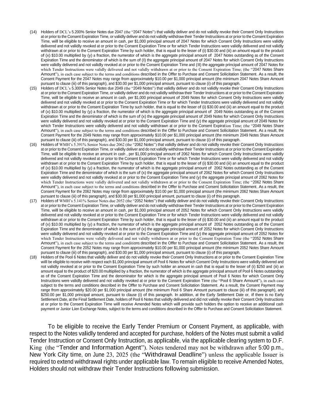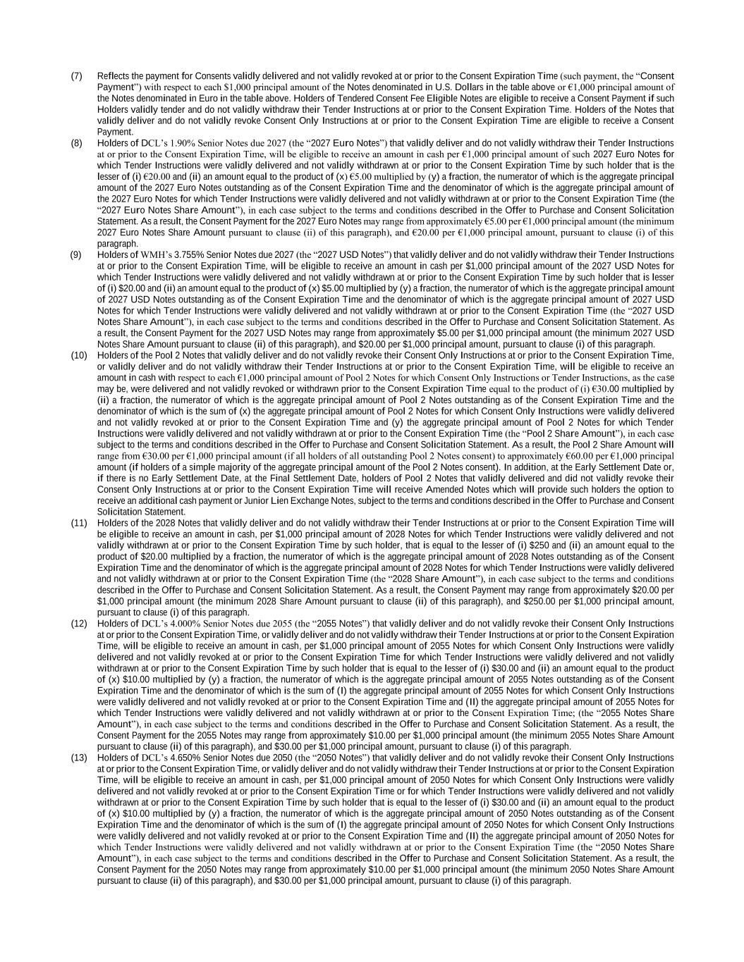 (14) Holders of DCL’s 5.200% Senior Notes due 2047 (the “2047 Notes”) that validly deliver and do not validly revoke their Consent Only Instructions at or prior to the Consent Expiration Time, or validly deliver and do not validly withdraw their Tender Instructions at or prior to the Consent Expiration Time, will be eligible to receive an amount in cash, per $1,000 principal amount of 2047 Notes for which Consent Only Instructions were validly delivered and not validly revoked at or prior to the Consent Expiration Time or for which Tender Instructions were validly delivered and not validly withdrawn at or prior to the Consent Expiration Time by such holder, that is equal to the lesser of (i) $30.00 and (ii) an amount equal to the product of (x) $10.00 multiplied by (y) a fraction, the numerator of which is the aggregate principal amount of 2047 Notes outstanding as of the Consent Expiration Time and the denominator of which is the sum of (I) the aggregate principal amount of 2047 Notes for which Consent Only Instructions were validly delivered and not validly revoked at or prior to the Consent Expiration Time and (II) the aggregate principal amount of 2047 Notes for which Tender Instructions were validly delivered and not validly withdrawn at or prior to the Consent Expiration Time; (the “2047 Notes Share Amount”), in each case subject to the terms and conditions described in the Offer to Purchase and Consent Solicitation Statement. As a result, the Consent Payment for the 2047 Notes may range from approximately $10.00 per $1,000 principal amount (the minimum 2047 Notes Share Amount pursuant to clause (ii) of this paragraph), and $30.00 per $1,000 principal amount, pursuant to clause (i) of this paragraph. (15) Holders of DCL’s 5.300% Senior Notes due 2049 (the “2049 Notes”) that validly deliver and do not validly revoke their Consent Only Instructions at or prior to the Consent Expiration Time, or validly deliver and do not validly withdraw their Tender Instructions at or prior to the Consent Expiration Time, will be eligible to receive an amount in cash, per $1,000 principal amount of 2049 Notes for which Consent Only Instructions were validly delivered and not validly revoked at or prior to the Consent Expiration Time or for which Tender Instructions were validly delivered and not validly withdrawn at or prior to the Consent Expiration Time by such holder, that is equal to the lesser of (i) $30.00 and (ii) an amount equal to the product of (x) $10.00 multiplied by (y) a fraction, the numerator of which is the aggregate principal amount of 2049 Notes outstanding as of the Consent Expiration Time and the denominator of which is the sum of (x) the aggregate principal amount of 2049 Notes for which Consent Only Instructions were validly delivered and not validly revoked at or prior to the Consent Expiration Time and (y) the aggregate principal amount of 2049 Notes for which Tender Instructions were validly delivered and not validly withdrawn at or prior to the Consent Expiration Time; (the “2049 Notes Share Amount”), in each case subject to the terms and conditions described in the Offer to Purchase and Consent Solicitation Statement. As a result, the Consent Payment for the 2049 Notes may range from approximately $10.00 per $1,000 principal amount (the minimum 2049 Notes Share Amount pursuant to clause (ii) of this paragraph), and $30.00 per $1,000 principal amount, pursuant to clause (i) of this paragraph. (16) Holders of WMH’s 5.391% Senior Notes due 2062 (the “2062 Notes”) that validly deliver and do not validly revoke their Consent Only Instructions at or prior to the Consent Expiration Time, or validly deliver and do not validly withdraw their Tender Instructions at or prior to the Consent Expiration Time, will be eligible to receive an amount in cash , per $1,000 principal amount of 2062 Notes for which Consent Only Instructions were validly delivered and not validly revoked at or prior to the Consent Expiration Time or for which Tender Instructions were validly delivered and not validly withdrawn at or prior to the Consent Expiration Time by such holder, that is equal to the lesser of (i) $30.00 and (ii) an amount equal to the product of (x) $10.00 multiplied by (y) a fraction, the numerator of which is the aggregate principal amount of 2062 Notes outstanding as of the Consent Expiration Time and the denominator of which is the sum of (x) the aggregate principal amount of 2062 Notes for which Consent Only Instructions were validly delivered and not validly revoked at or prior to the Consent Expiration Time and (y) the aggregate principal amount of 2062 Notes for which Tender Instructions were validly delivered and not validly withdrawn at or prior to the Consent Expiration Time; (the “2062 Notes Share Amount”), in each case subject to the terms and conditions described in the Offer to Purchase and Consent Solicitation Statement. As a result, the Consent Payment for the 2062 Notes may range from approximately $10.00 per $1,000 principal amount (the minimum 2062 Notes Share Amount pursuant to clause (ii) of this paragraph), and $30.00 per $1,000 principal amount, pursuant to clause (i) of this paragraph. (17) Holders of WMH’s 5.141% Senior Notes due 2052 (the “2052 Notes”) that validly deliver and do not validly revoke their Consent Only Instructions at or prior to the Consent Expiration Time, or validly deliver and do not validly withdraw their Tender Instructions at or prior to the Consent Expiration Time, will be eligible to receive an amount in cash, per $1,000 principal amount of 2052 Notes for which Consent Only Instructions were validly delivered and not validly revoked at or prior to the Consent Expiration Time or for which Tender Instructions were validly delivered and not validly withdrawn at or prior to the Consent Expiration Time by such holder, that is equal to the lesser of (i) $30.00 and (ii) an amount equal to the product of (x) $1