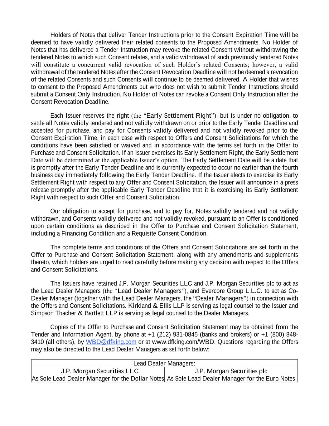 Holders of Notes that deliver Tender Instructions prior to the Consent Expiration Time will be deemed to have validly delivered their related consents to the Proposed Amendments. No Holder of Notes that has delivered a Tender Instruction may revoke the related Consent without withdrawing the tendered Notes to which such Consent relates, and a valid withdrawal of such previously tendered Notes will constitute a concurrent valid revocation of such Holder’s related Consents; however, a valid withdrawal of the tendered Notes after the Consent Revocation Deadline will not be deemed a revocation of the related Consents and such Consents will continue to be deemed delivered. A Holder that wishes to consent to the Proposed Amendments but who does not wish to submit Tender Instructions should submit a Consent Only Instruction. No Holder of Notes can revoke a Consent Only Instruction after the Consent Revocation Deadline. Each Issuer reserves the right (the “Early Settlement Right”), but is under no obligation, to settle all Notes validly tendered and not validly withdrawn on or prior to the Early Tender Deadline and accepted for purchase, and pay for Consents validly delivered and not validly revoked prior to the Consent Expiration Time, in each case with respect to Offers and Consent Solicitations for which the conditions have been satisfied or waived and in accordance with the terms set forth in the Offer to Purchase and Consent Solicitation. If an Issuer exercises its Early Settlement Right, the Early Settlement Date will be determined at the applicable Issuer’s option. The Early Settlement Date will be a date that is promptly after the Early Tender Deadline and is currently expected to occur no earlier than the fourth business day immediately following the Early Tender Deadline. If the Issuer elects to exercise its Early Settlement Right with respect to any Offer and Consent Solicitation, the Issuer will announce in a press release promptly after the applicable Early Tender Deadline that it is exercising its Early Settlement Right with respect to such Offer and Consent Solicitation. Our obligation to accept for purchase, and to pay for, Notes validly tendered and not validly withdrawn, and Consents validly delivered and not validly revoked, pursuant to an Offer is conditioned upon certain conditions as described in the Offer to Purchase and Consent Solicitation Statement, including a Financing Condition and a Requisite Consent Condition. The complete terms and conditions of the Offers and Consent Solicitations are set forth in the Offer to Purchase and Consent Solicitation Statement, along with any amendments and supplements thereto, which holders are urged to read carefully before making any decision with respect to the Offers and Consent Solicitations. The Issuers have retained J.P. Morgan Securities LLC and J.P. Morgan Securities plc to act as the Lead Dealer Managers (the “Lead Dealer Managers”), and Evercore Group L.L.C. to act as Co- Dealer Manager (together with the Lead Dealer Managers, the “Dealer Managers”) in connection with the Offers and Consent Solicitations. Kirkland & Ellis LLP is serving as legal counsel to the Issuer and Simpson Thacher & Bartlett LLP is serving as legal counsel to the Dealer Managers. Copies of the Offer to Purchase and Consent Solicitation Statement may be obtained from the Tender and Information Agent, by phone at +1 (212) 931-0845 (banks and brokers) or +1 (800) 848- 3410 (all others), by WBD@dfking.com or at www.dfking.com/WBD. Questions regarding the Offers may also be directed to the Lead Dealer Managers as set forth below: Lead Dealer Managers: J.P. Morgan Securities LLC As Sole Lead Dealer Manager for the Dollar Notes J.P. Morgan Securities plc As Sole Lead Dealer Manager for the Euro Notes