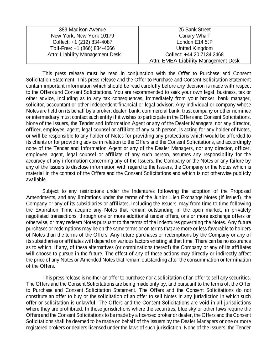 383 Madison Avenue New York, New York 10179 Collect: +1 (212) 834-4087 Toll-Free: +1 (866) 834-4666 Attn: Liability Management Desk 25 Bank Street Canary Wharf London E14 5JP United Kingdom Collect: +44 20 7134 2468 Attn: EMEA Liability Management Desk This press release must be read in conjunction with the Offer to Purchase and Consent Solicitation Statement. This press release and the Offer to Purchase and Consent Solicitation Statement contain important information which should be read carefully before any decision is made with respect to the Offers and Consent Solicitations. You are recommended to seek your own legal, business, tax or other advice, including as to any tax consequences, immediately from your broker, bank manager, solicitor, accountant or other independent financial or legal advisor. Any individual or company whose Notes are held on its behalf by a broker, dealer, bank, commercial bank, trust company or other nominee or intermediary must contact such entity if it wishes to participate in the Offers and Consent Solicitations. None of the Issuers, the Tender and Information Agent or any of the Dealer Managers, nor any director, officer, employee, agent, legal counsel or affiliate of any such person, is acting for any holder of Notes, or will be responsible to any holder of Notes for providing any protections which would be afforded to its clients or for providing advice in relation to the Offers and the Consent Solicitations, and accordingly none of the Tender and Information Agent or any of the Dealer Managers, nor any director, officer, employee, agent, legal counsel or affiliate of any such person, assumes any responsibility for the accuracy of any information concerning any of the Issuers, the Company or the Notes or any failure by any of the Issuers to disclose information with regard to the Issuers, the Company or the Notes which is material in the context of the Offers and the Consent Solicitations and which is not otherwise publicly available. Subject to any restrictions under the Indentures following the adoption of the Proposed Amendments, and any limitations under the terms of the Junior Lien Exchange Notes (if issued), the Company or any of its subsidiaries or affiliates, including the Issuers, may from time to time following the Expiration Time acquire any Notes that remain outstanding in the open market, in privately negotiated transactions, through one or more additional tender offers, one or more exchange offers or otherwise, or may redeem Notes pursuant to the terms of the indentures governing the Notes. Any future purchases or redemptions may be on the same terms or on terms that are more or less favorable to holders of Notes than the terms of the Offers. Any future purchases or redemptions by the Company or any of its subsidiaries or affiliates will depend on various factors existing at that time. There can be no assurance as to which, if any, of these alternatives (or combinations thereof) the Company or any of its affiliates will choose to pursue in the future. The effect of any of these actions may directly or indirectly affect the price of any Notes or Amended Notes that remain outstanding after the consummation or termination of the Offers. This press release is neither an offer to purchase nor a solicitation of an offer to sell any securities. The Offers and the Consent Solicitations are being made only by, and pursuant to the terms of, the Offer to Purchase and Consent Solicitation Statement. The Offers and the Consent Solicitations do not constitute an offer to buy or the solicitation of an offer to sell Notes in any jurisdiction in which such offer or solicitation is unlawful. The Offers and the Consent Solicitations are void in all jurisdictions where they are prohibited. In those jurisdictions where the securities, blue sky or other laws require the Offers and the Consent Solicitations to be made by a licensed broker or dealer, the Offers and the Consent Solicitations shall be deemed to be made on behalf of the Issuers by the Dealer Managers or one or more registered brokers or dealers licensed under the laws of such jurisdiction. None of the Issuers, the Tender