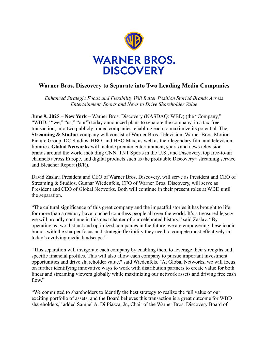 Warner Bros. Discovery to Separate into Two Leading Media Companies Enhanced Strategic Focus and Flexibility Will Better Position Storied Brands Across Entertainment, Sports and News to Drive Shareholder Value June 9, 2025 – New York – Warner Bros. Discovery (NASDAQ: WBD) (the “Company,” “WBD,” “we,” “us,” “our”) today announced plans to separate the company, in a tax-free transaction, into two publicly traded companies, enabling each to maximize its potential. The Streaming & Studios company will consist of Warner Bros. Television, Warner Bros. Motion Picture Group, DC Studios, HBO, and HBO Max, as well as their legendary film and television libraries. Global Networks will include premier entertainment, sports and news television brands around the world including CNN, TNT Sports in the U.S., and Discovery, top free-to-air channels across Europe, and digital products such as the profitable Discovery+ streaming service and Bleacher Report (B/R). David Zaslav, President and CEO of Warner Bros. Discovery, will serve as President and CEO of Streaming & Studios. Gunnar Wiedenfels, CFO of Warner Bros. Discovery, will serve as President and CEO of Global Networks. Both will continue in their present roles at WBD until the separation. “The cultural significance of this great company and the impactful stories it has brought to life for more than a century have touched countless people all over the world. It’s a treasured legacy we will proudly continue in this next chapter of our celebrated history,” said Zaslav. “By operating as two distinct and optimized companies in the future, we are empowering these iconic brands with the sharper focus and strategic flexibility they need to compete most effectively in today’s evolving media landscape.” “This separation will invigorate each company by enabling them to leverage their strengths and specific financial profiles. This will also allow each company to pursue important investment opportunities and drive shareholder value," said Wiedenfels. "At Global Networks, we will focus on further identifying innovative ways to work with distribution partners to create value for both linear and streaming viewers globally while maximizing our network assets and driving free cash flow.” “We committed to shareholders to identify the best strategy to realize the full value of our exciting portfolio of assets, and the Board believes this transaction is a great outcome for WBD shareholders,” added Samuel A. Di Piazza, Jr., Chair of the Warner Bros. Discovery Board of