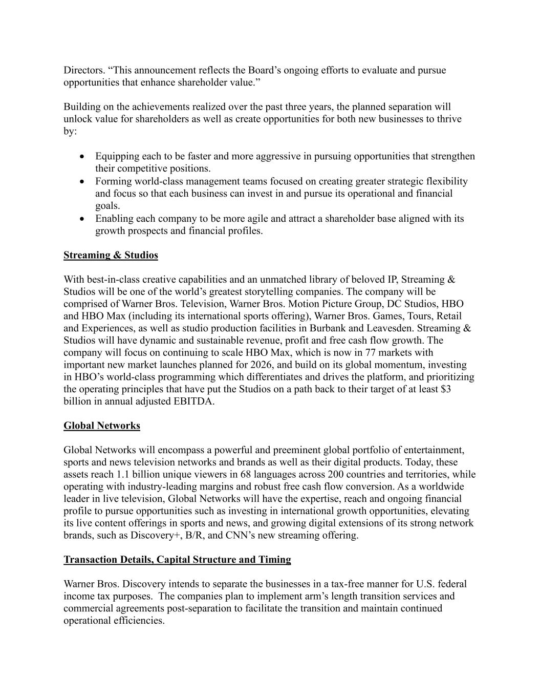 Directors. “This announcement reflects the Board’s ongoing efforts to evaluate and pursue opportunities that enhance shareholder value.” Building on the achievements realized over the past three years, the planned separation will unlock value for shareholders as well as create opportunities for both new businesses to thrive by: • Equipping each to be faster and more aggressive in pursuing opportunities that strengthen their competitive positions. • Forming world-class management teams focused on creating greater strategic flexibility and focus so that each business can invest in and pursue its operational and financial goals. • Enabling each company to be more agile and attract a shareholder base aligned with its growth prospects and financial profiles. Streaming & Studios With best-in-class creative capabilities and an unmatched library of beloved IP, Streaming & Studios will be one of the world’s greatest storytelling companies. The company will be comprised of Warner Bros. Television, Warner Bros. Motion Picture Group, DC Studios, HBO and HBO Max (including its international sports offering), Warner Bros. Games, Tours, Retail and Experiences, as well as studio production facilities in Burbank and Leavesden. Streaming & Studios will have dynamic and sustainable revenue, profit and free cash flow growth. The company will focus on continuing to scale HBO Max, which is now in 77 markets with important new market launches planned for 2026, and build on its global momentum, investing in HBO’s world-class programming which differentiates and drives the platform, and prioritizing the operating principles that have put the Studios on a path back to their target of at least $3 billion in annual adjusted EBITDA. Global Networks Global Networks will encompass a powerful and preeminent global portfolio of entertainment, sports and news television networks and brands as well as their digital products. Today, these assets reach 1.1 billion unique viewers in 68 languages across 200 countries and territories, while operating with industry-leading margins and robust free cash flow conversion. As a worldwide leader in live television, Global Networks will have the expertise, reach and ongoing financial profile to pursue opportunities such as investing in international growth opportunities, elevating its live content offerings in sports and news, and growing digital extensions of its strong network brands, such as Discovery+, B/R, and CNN’s new streaming offering. Transaction Details, Capital Structure and Timing Warner Bros. Discovery intends to separate the businesses in a tax-free manner for U.S. federal income tax purposes. The companies plan to implement arm’s length transition services and commercial agreements post-separation to facilitate the transition and maintain continued operational efficiencies.